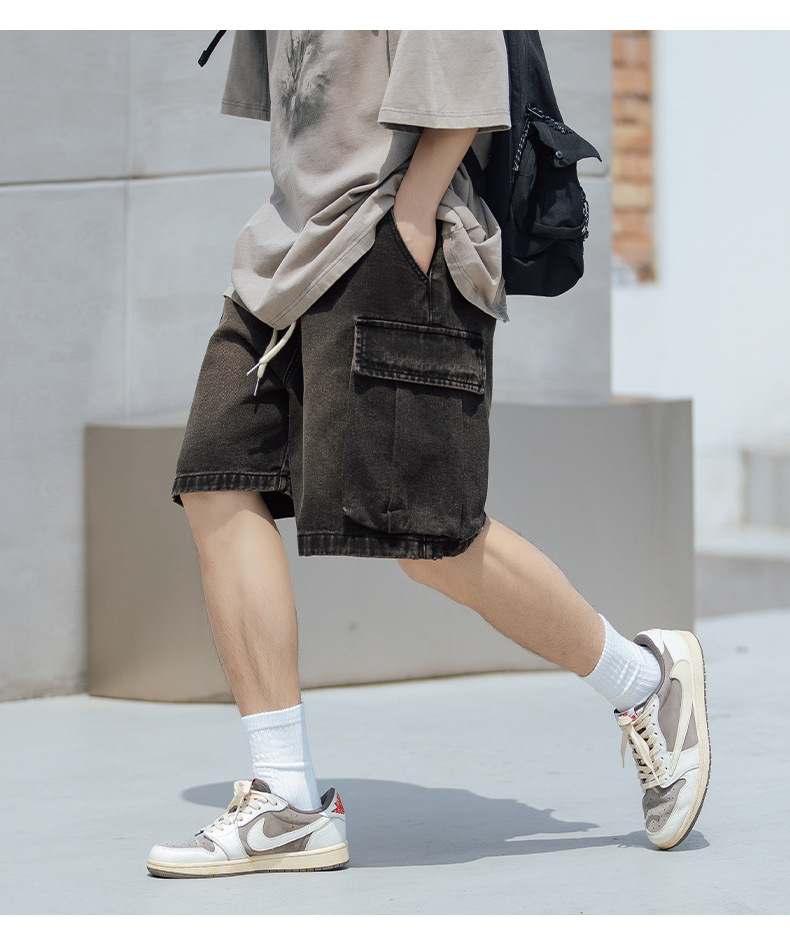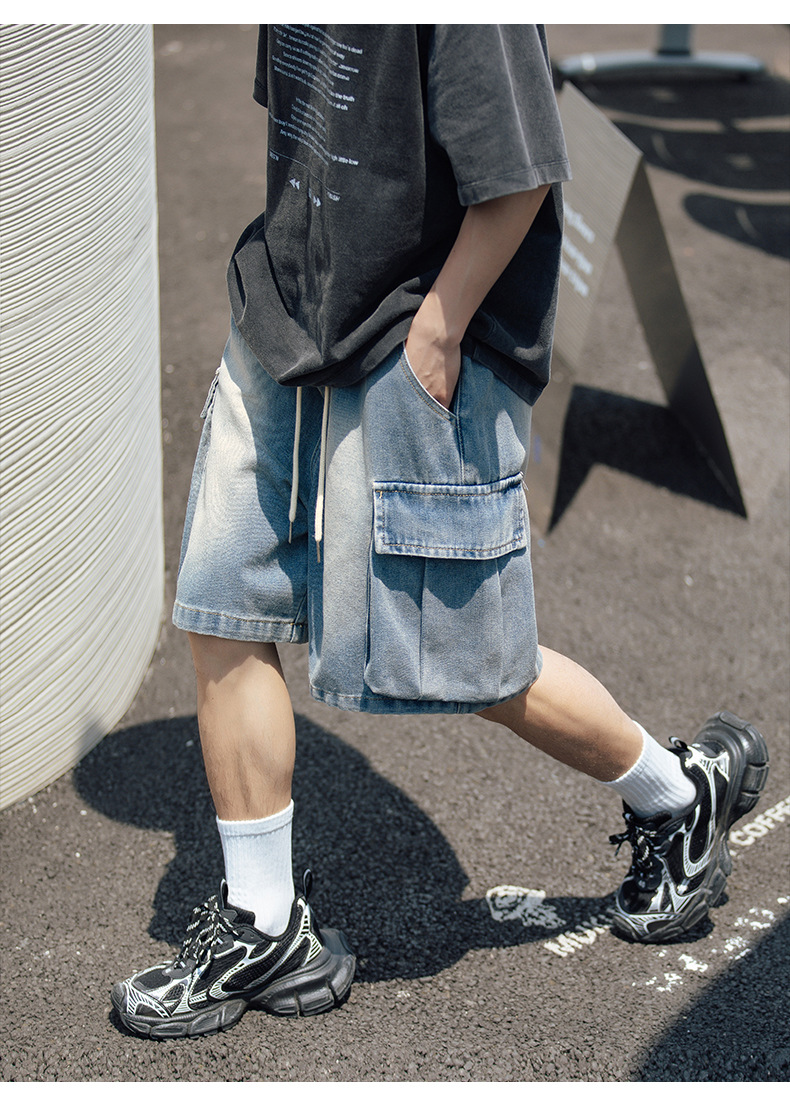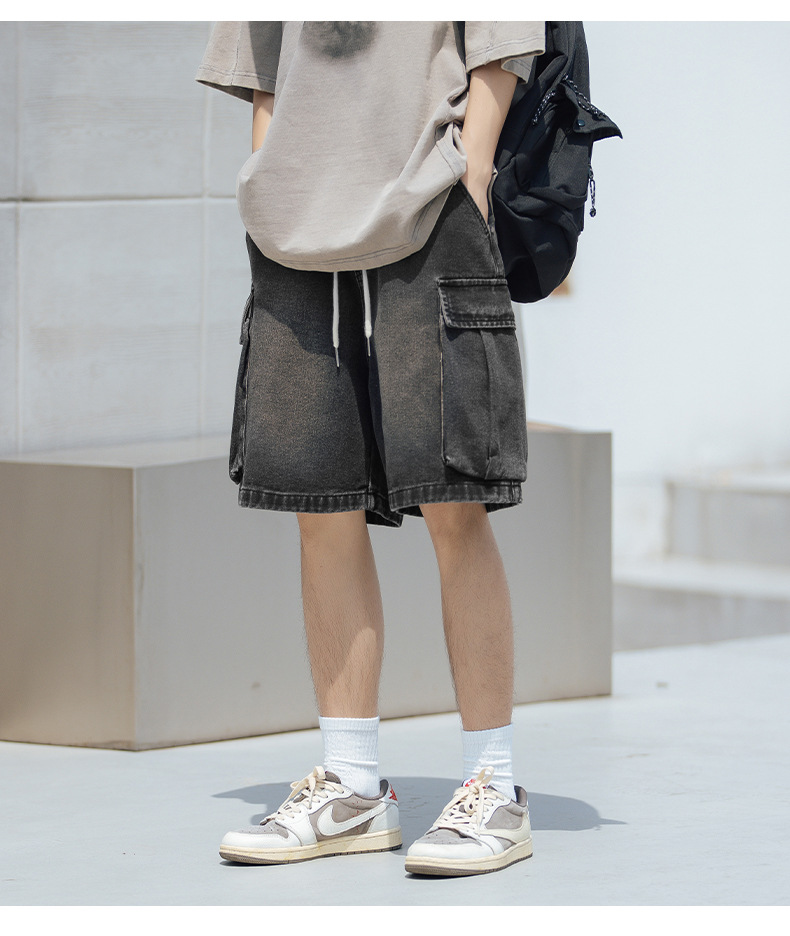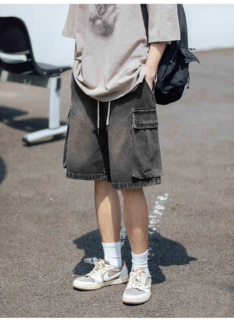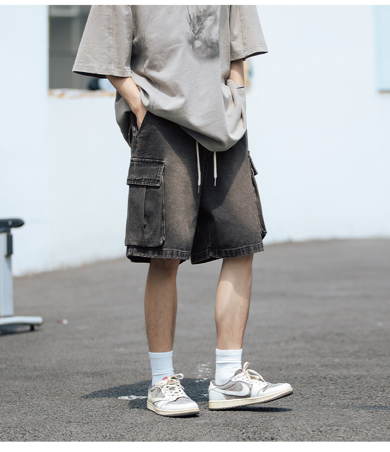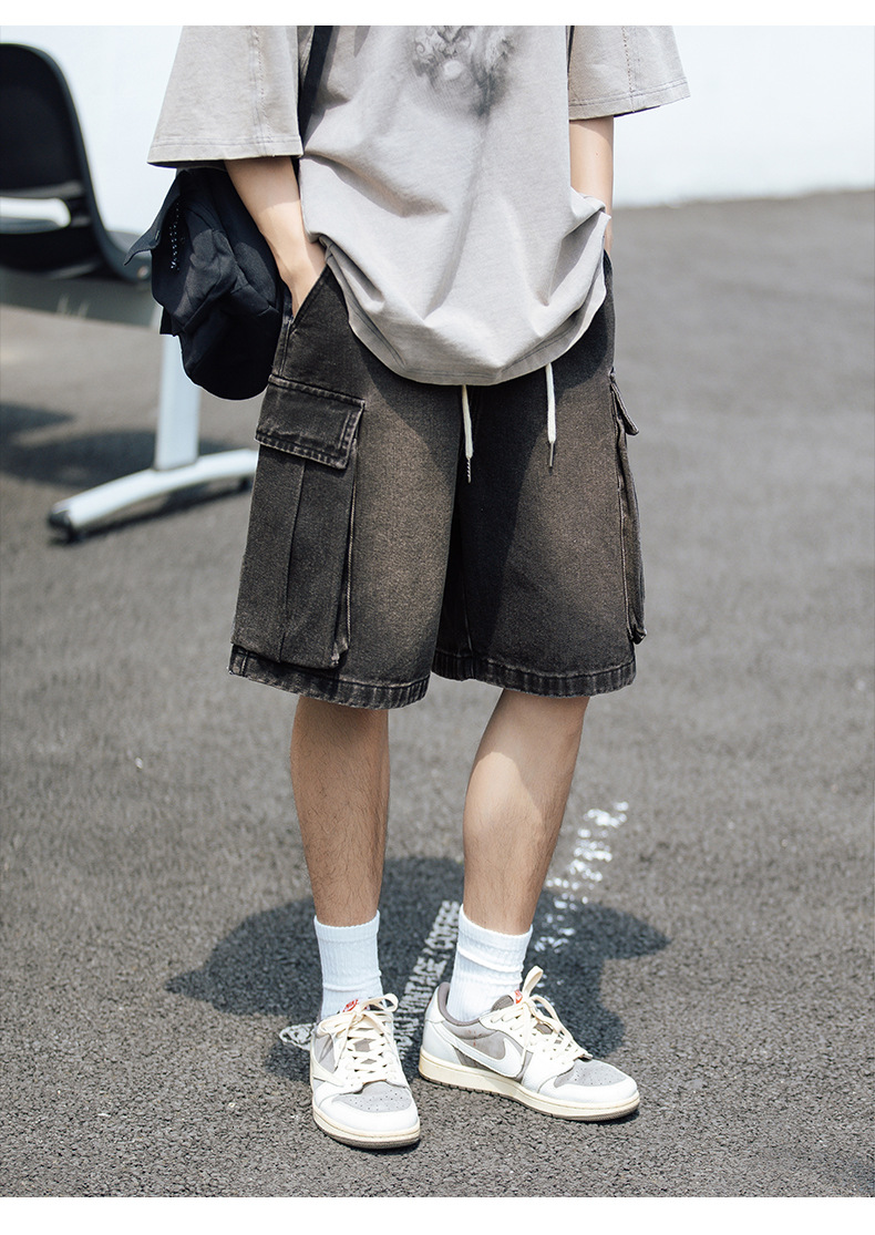 하이 스트리트 오래 된 사이드 포켓 디자인 데님 반바지 남자 여름 일본 캐주얼 느슨한 끈 바지스토어 가기