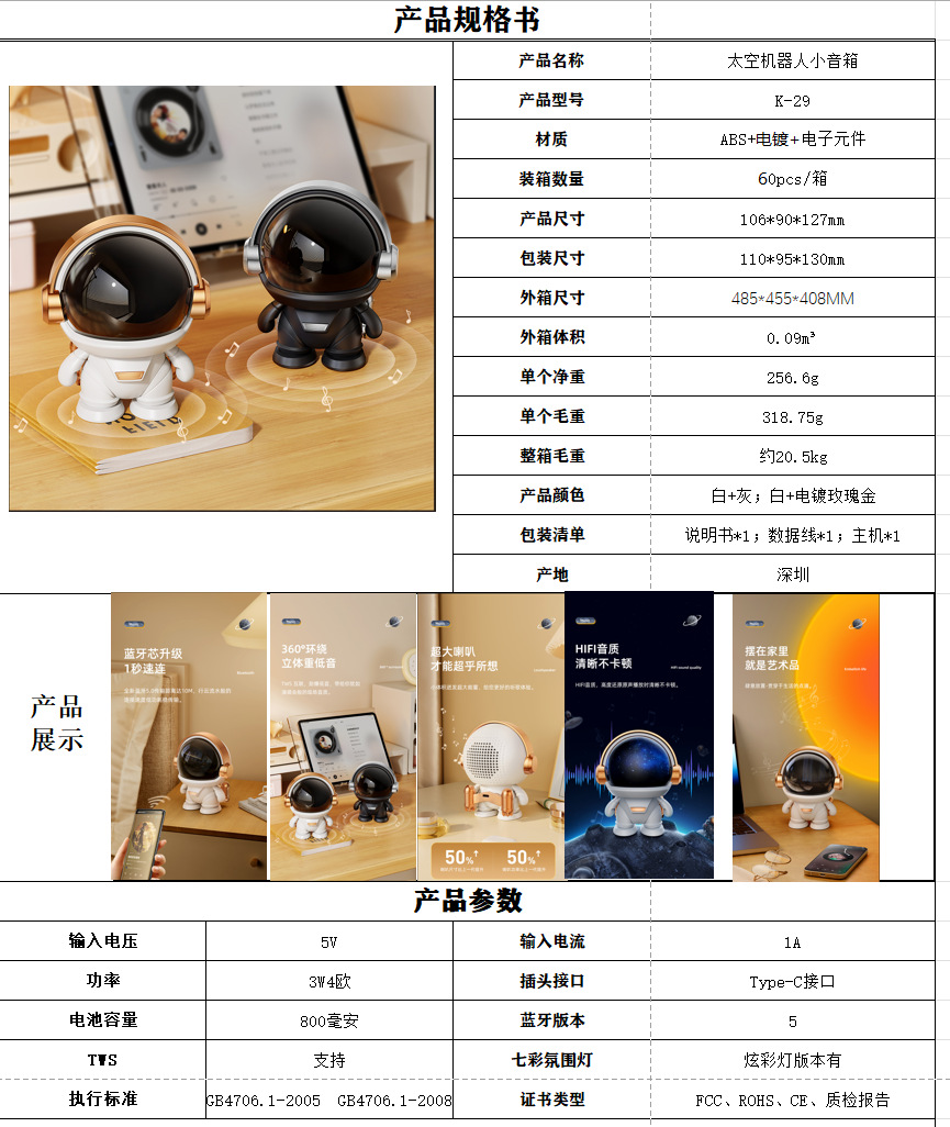 새로운 우주 비행사 창조적 인 블루투스 스피커 데스크탑 학생 다채로운 빛 서브 우퍼 야외 작은 오디오 선물 휴대용스토어 가기