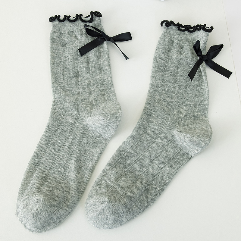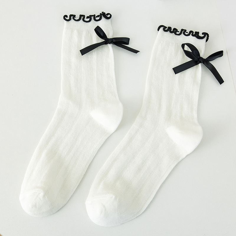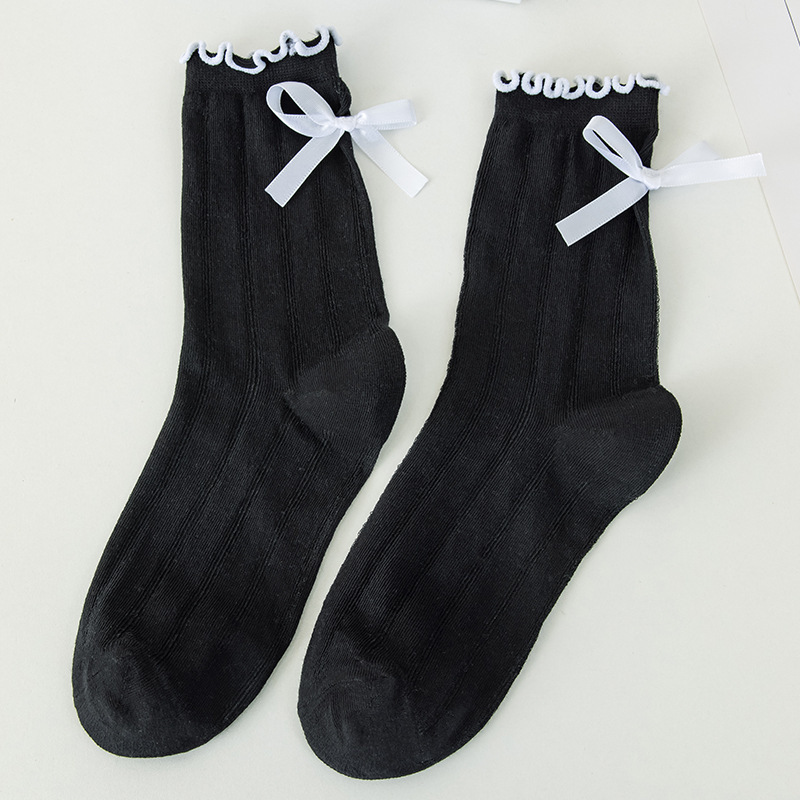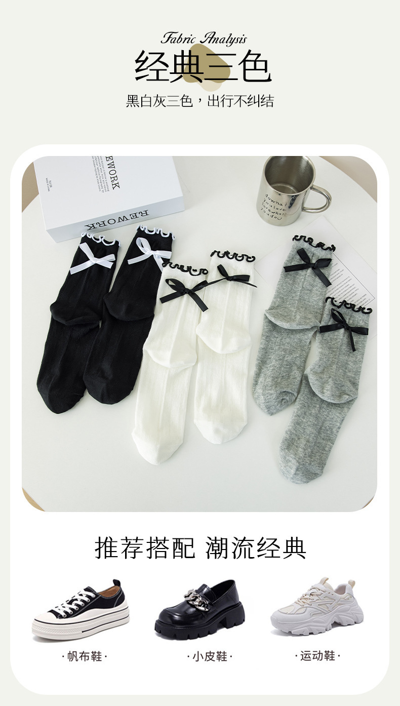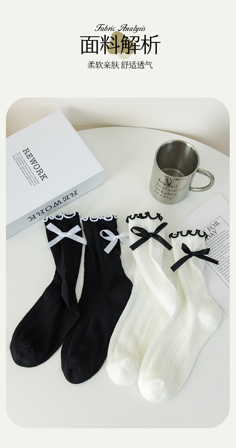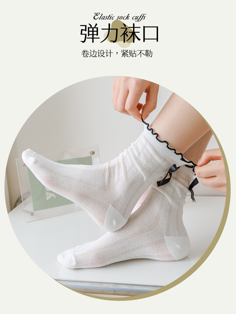 여성용 리본 양말, 얇은 종아리 중간 순면 양말, 학생 jk 여름용 작은 가죽 신발이 달린 일본식 레이스 면 스타킹
