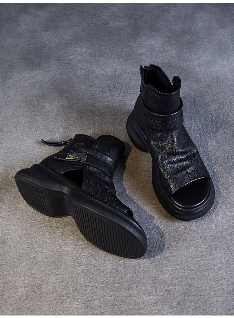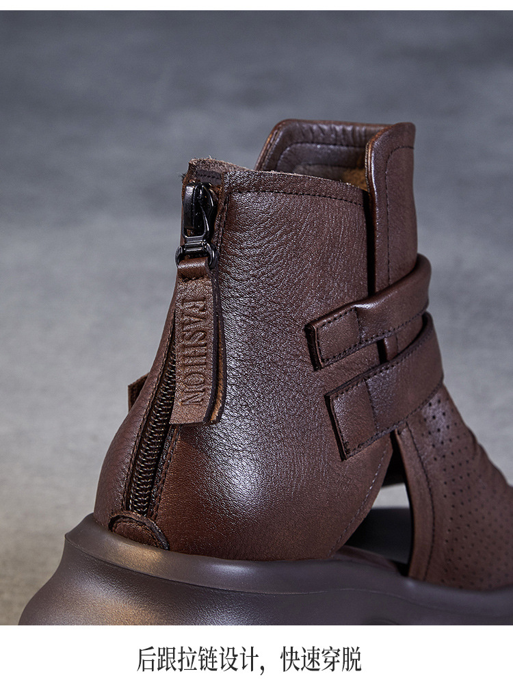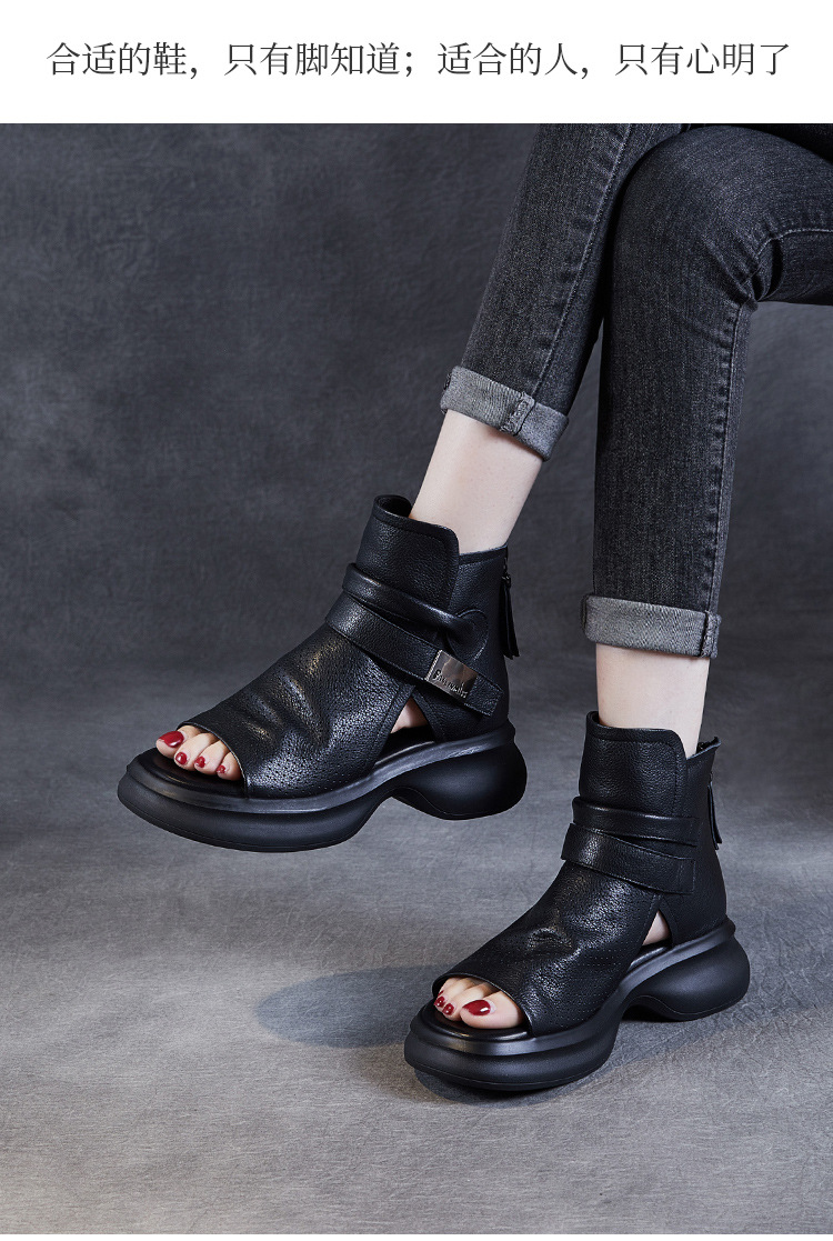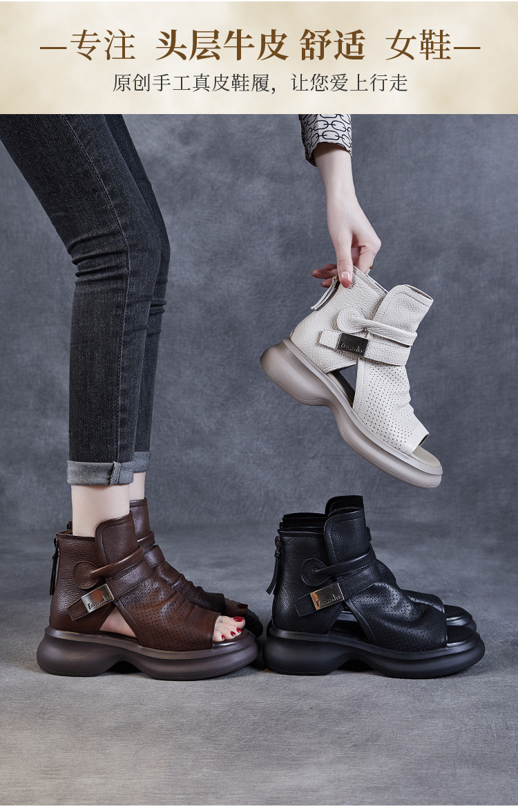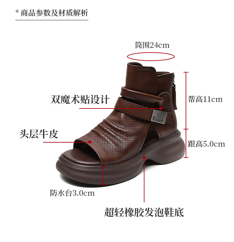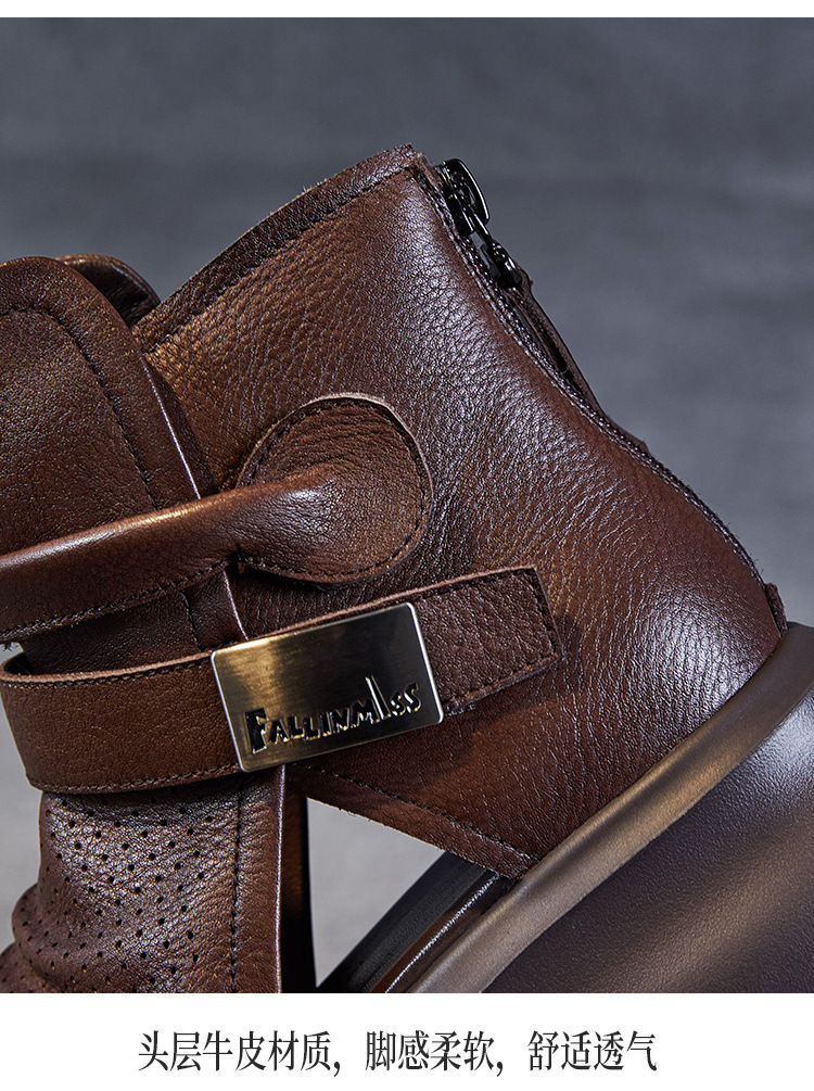 2024 봄과 여름 수제 정품 가죽 레트로 스타일 플랫 하이 바텀 벨크로 피쉬 머스 쿨 부츠 두꺼운 싱글 레이어 부츠 로마 부츠
