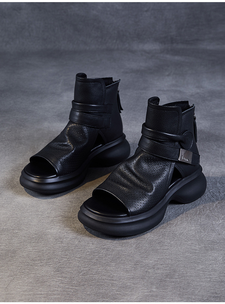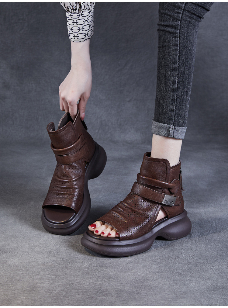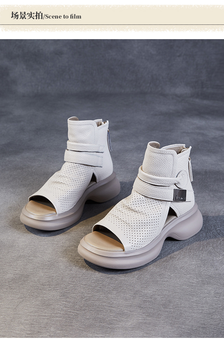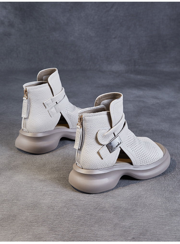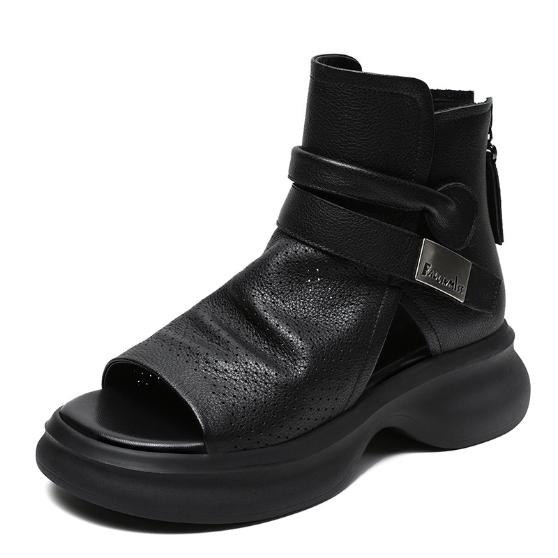 2024 봄과 여름 수제 정품 가죽 레트로 스타일 플랫 하이 바텀 벨크로 피쉬 머스 쿨 부츠 두꺼운 싱글 레이어 부츠 로마 부츠
