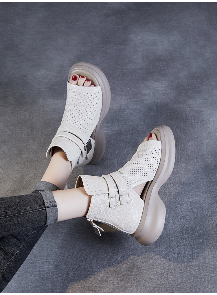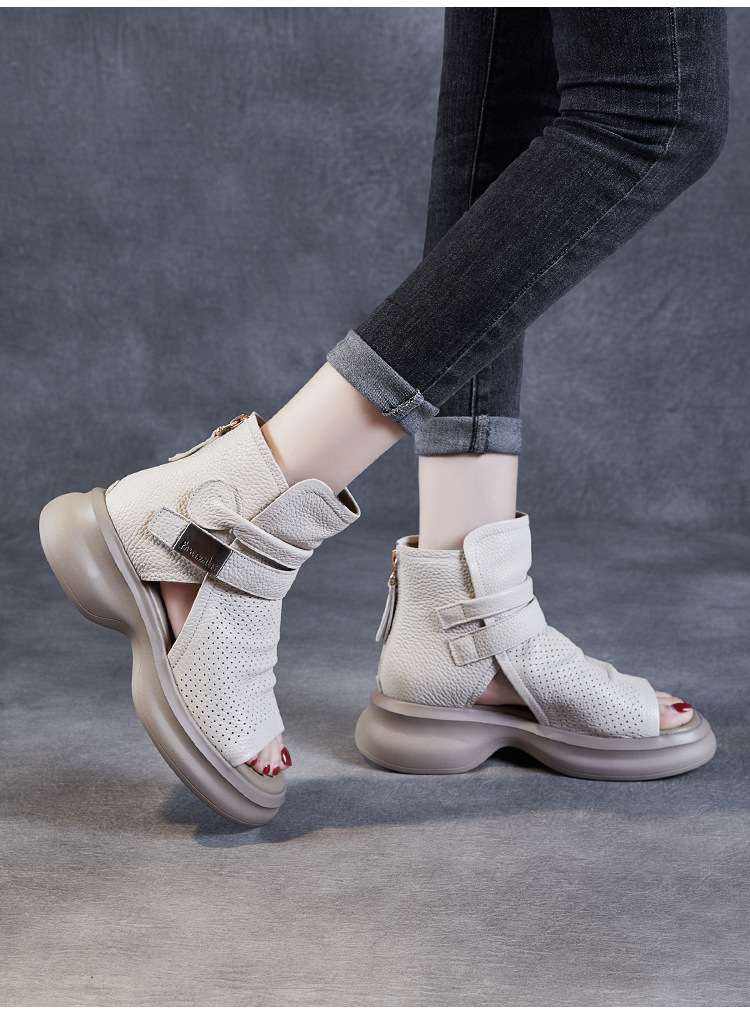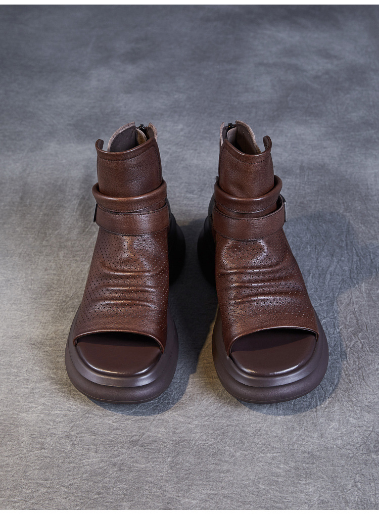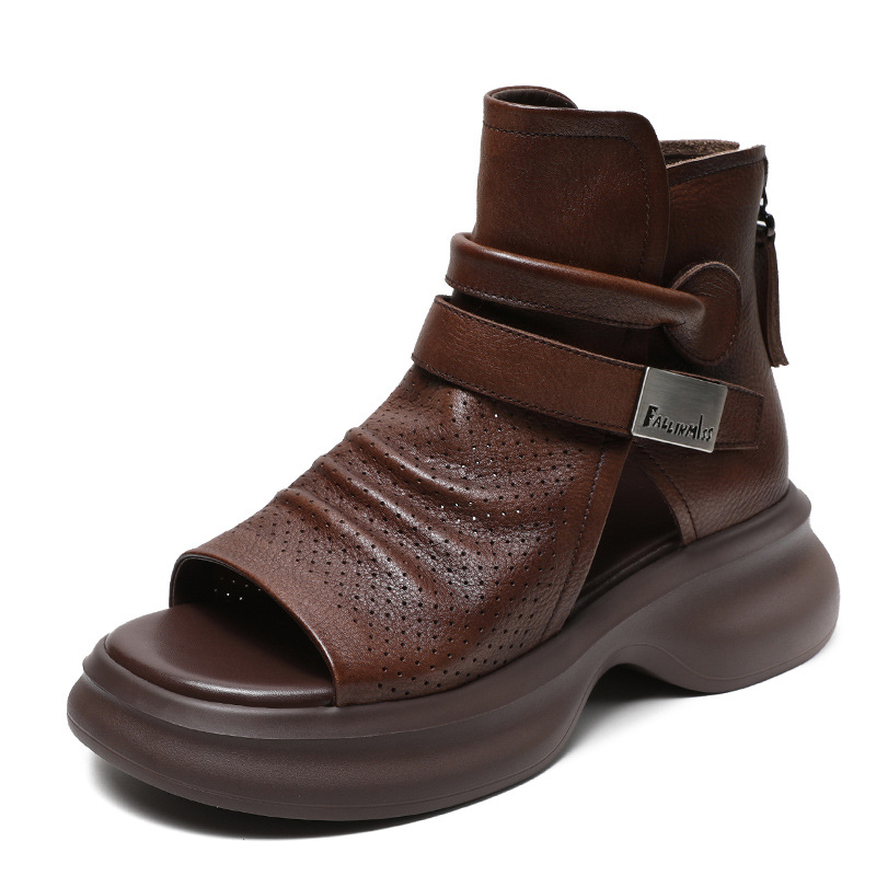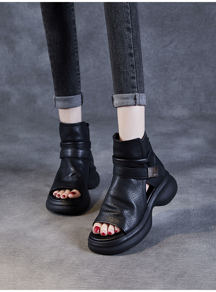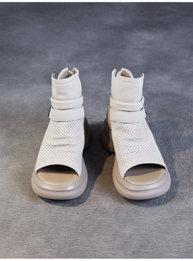 2024 봄과 여름 수제 정품 가죽 레트로 스타일 플랫 하이 바텀 벨크로 피쉬 머스 쿨 부츠 두꺼운 싱글 레이어 부츠 로마 부츠