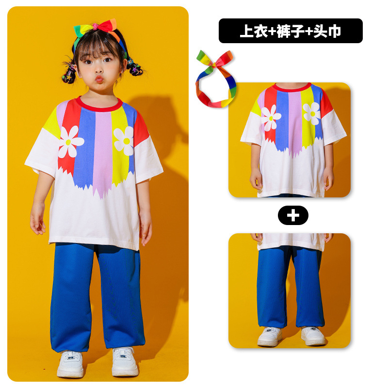 • 세트 [569D 꽃 짧은 소매 542D 블루 바지] 무지개 헤어 밴드