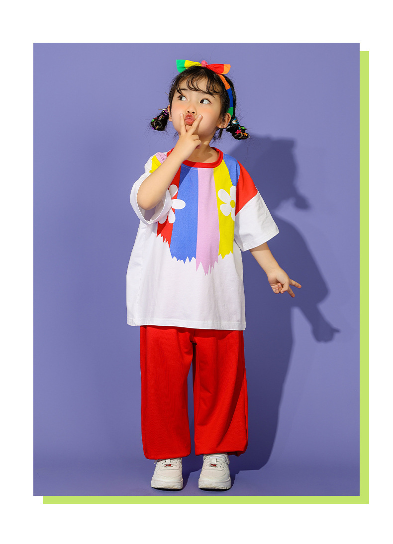 • 세트 [569D 꽃 반팔 534D 빨간 바지] 무지개 머리 스카프