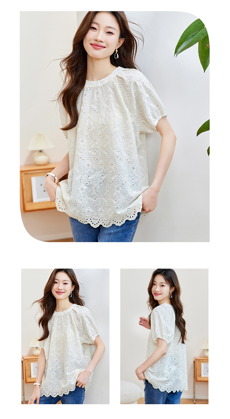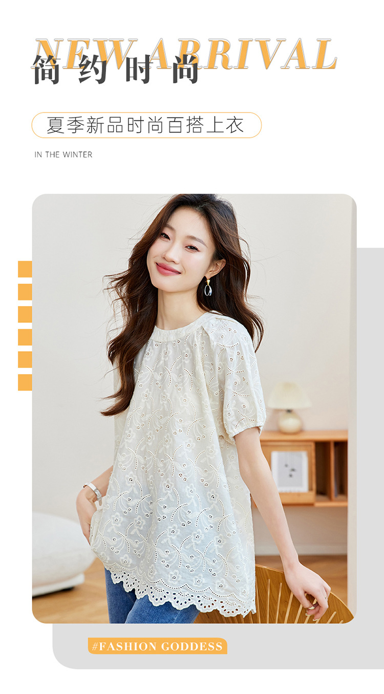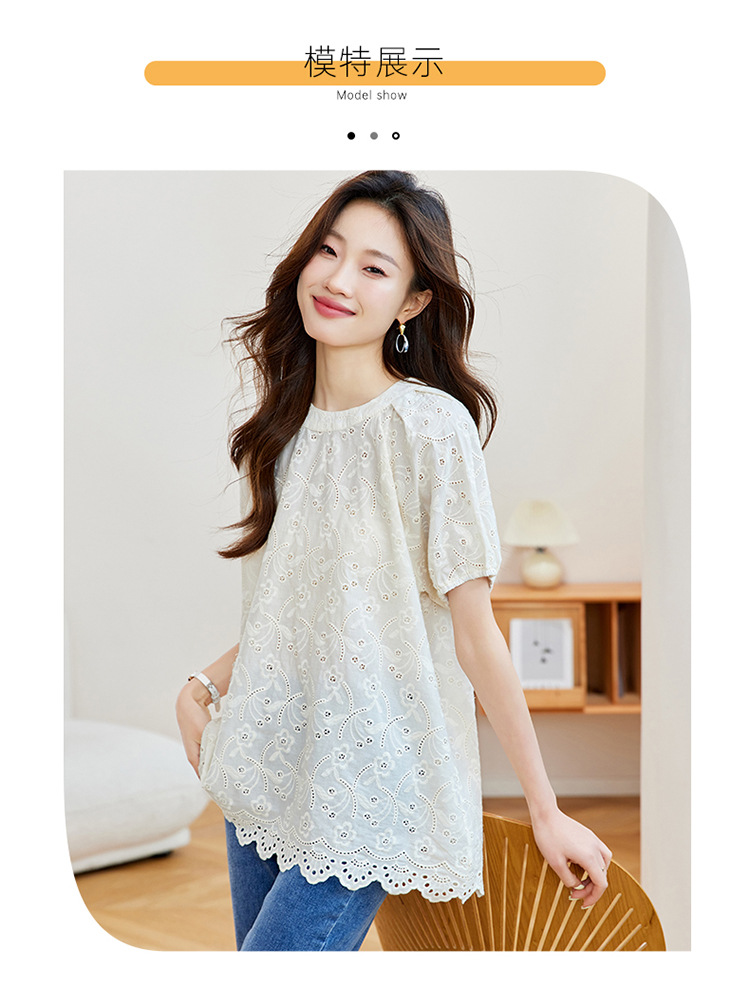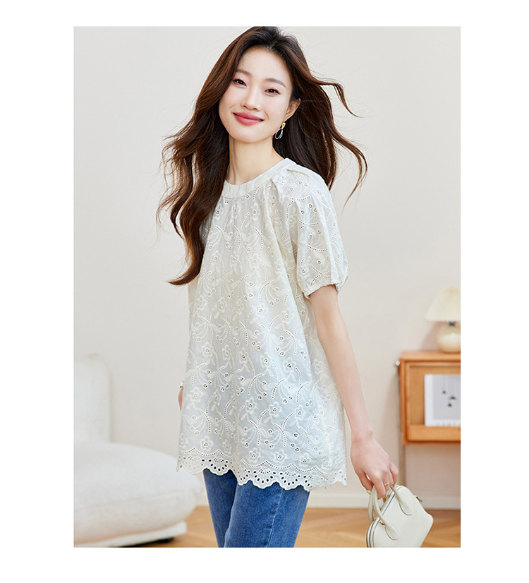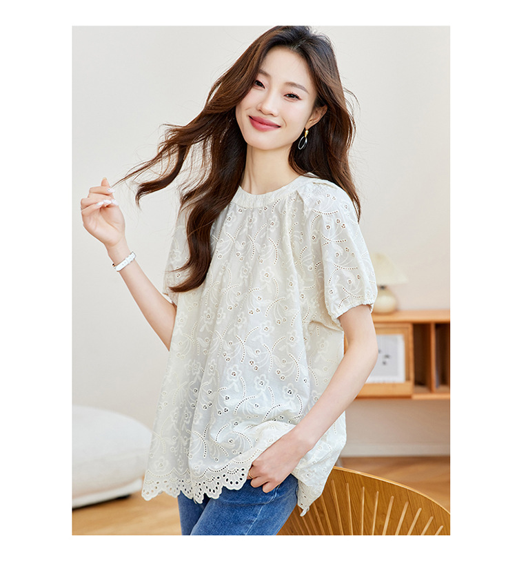 2024 새로운 여름 여성복 할로우 탑 디자인 틈새 레이스 짧은 소매 화이트 V-넥 달콤한 작은 셔츠스토어 가기
