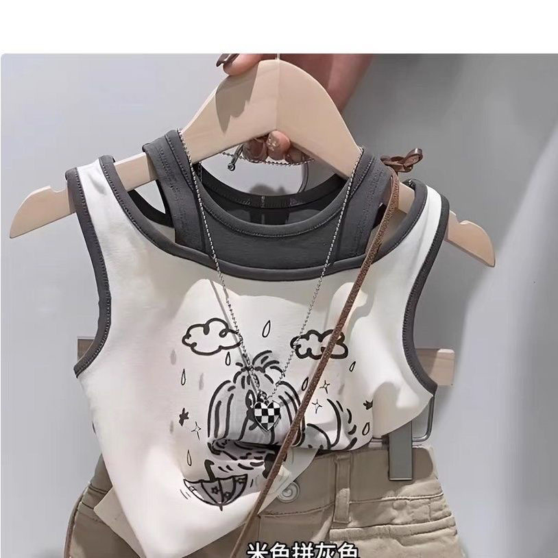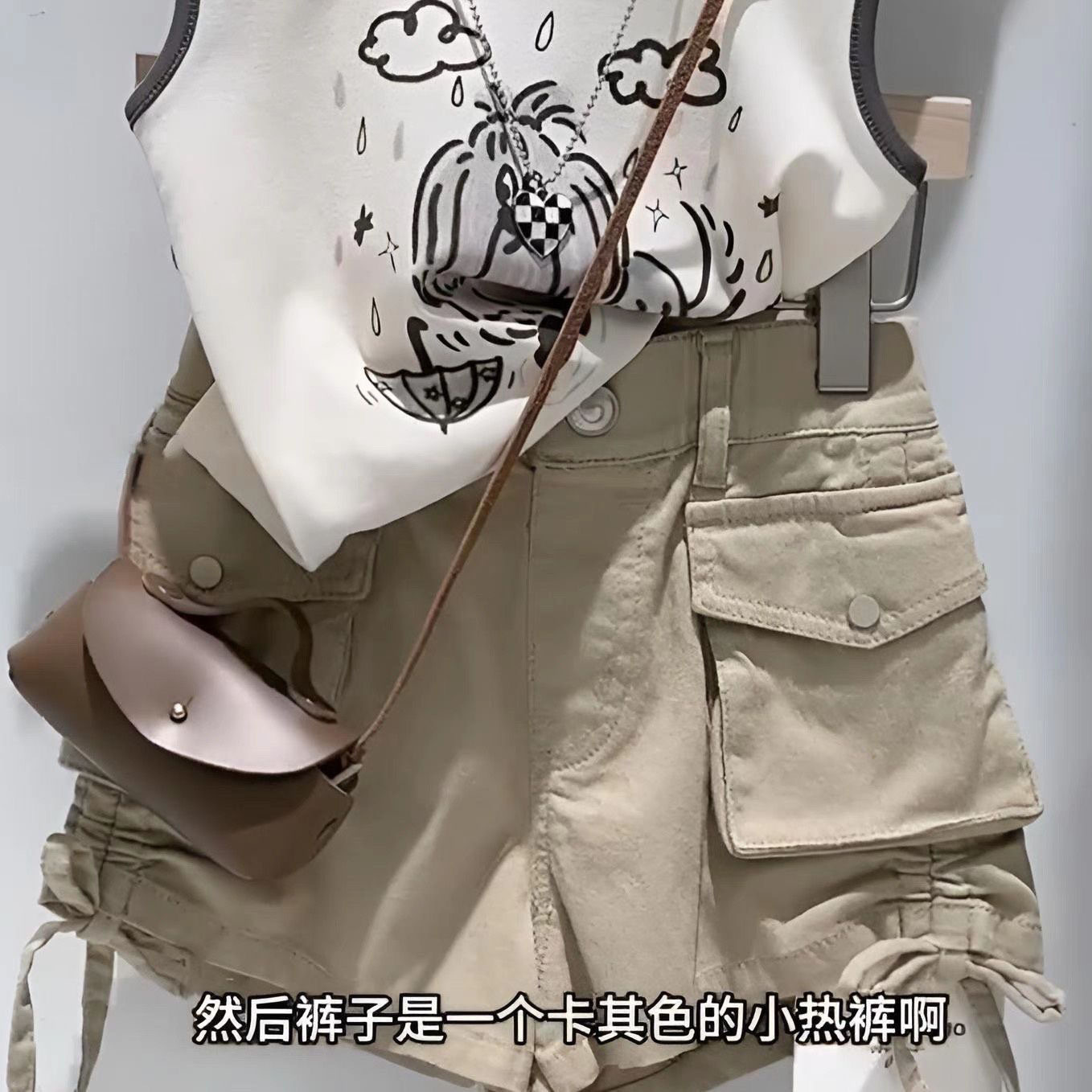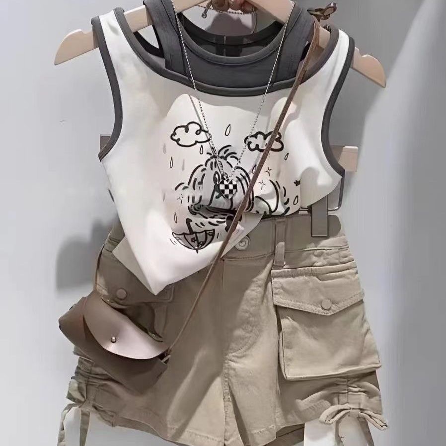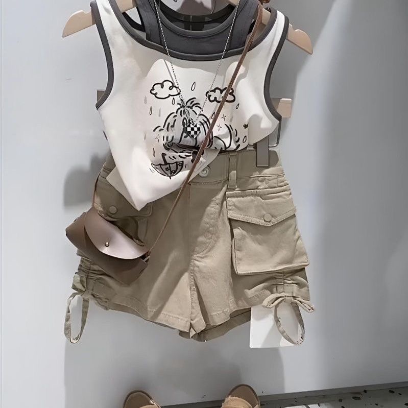 2024 소녀 여름 세트 새로운 세련된 여름 투피스 세트 한국 스타일 가짜 투피스 탑 유행 어린이 반바지스토어 가기