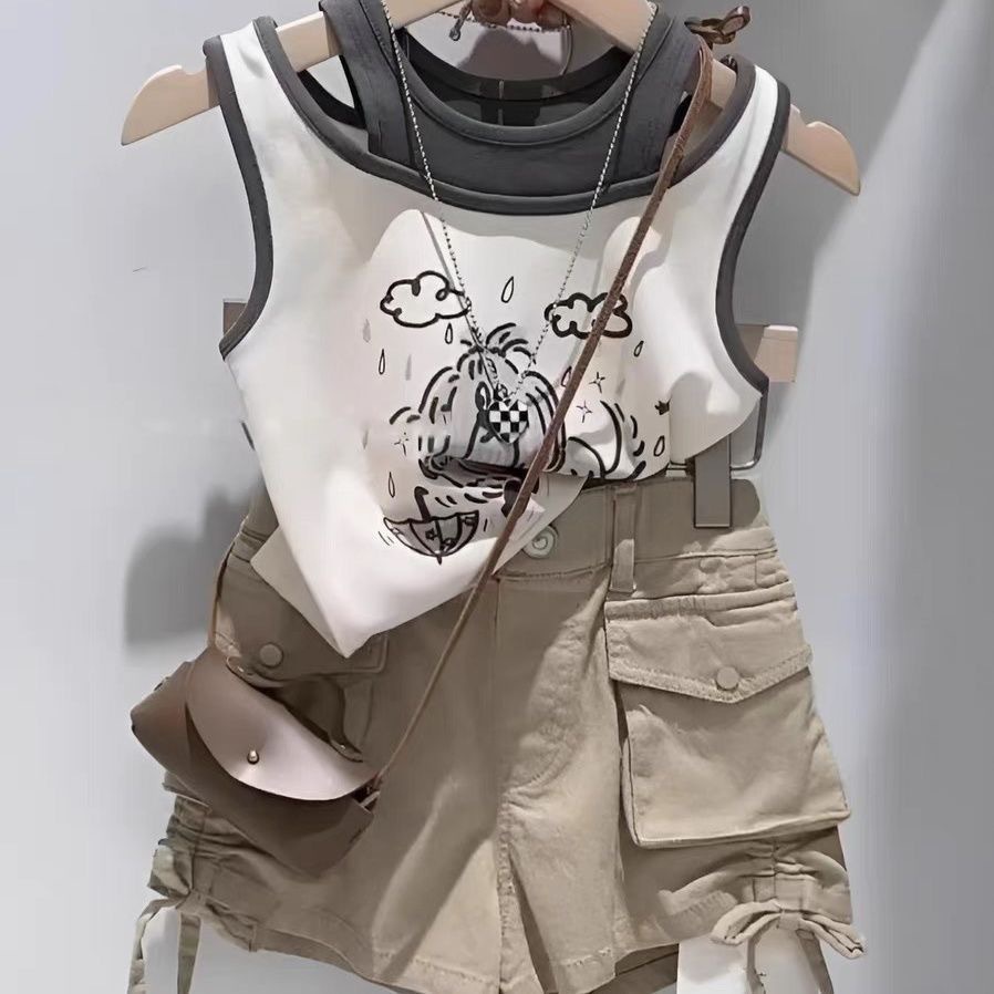 • 대조 가짜 2 피스 조끼 카키 끈 반바지