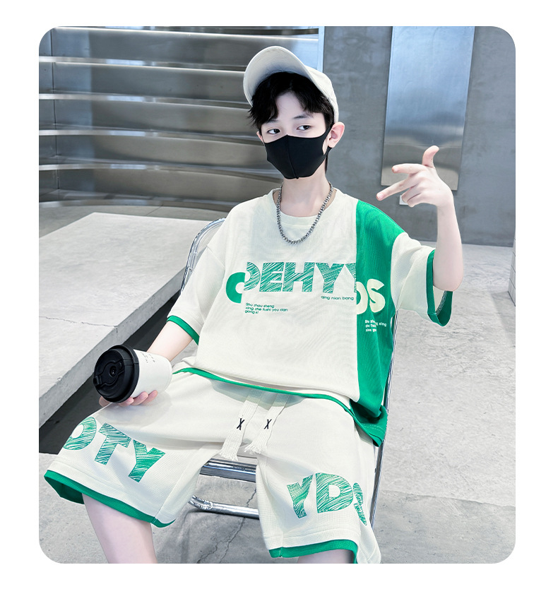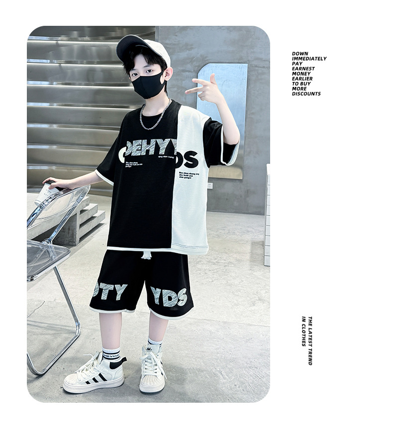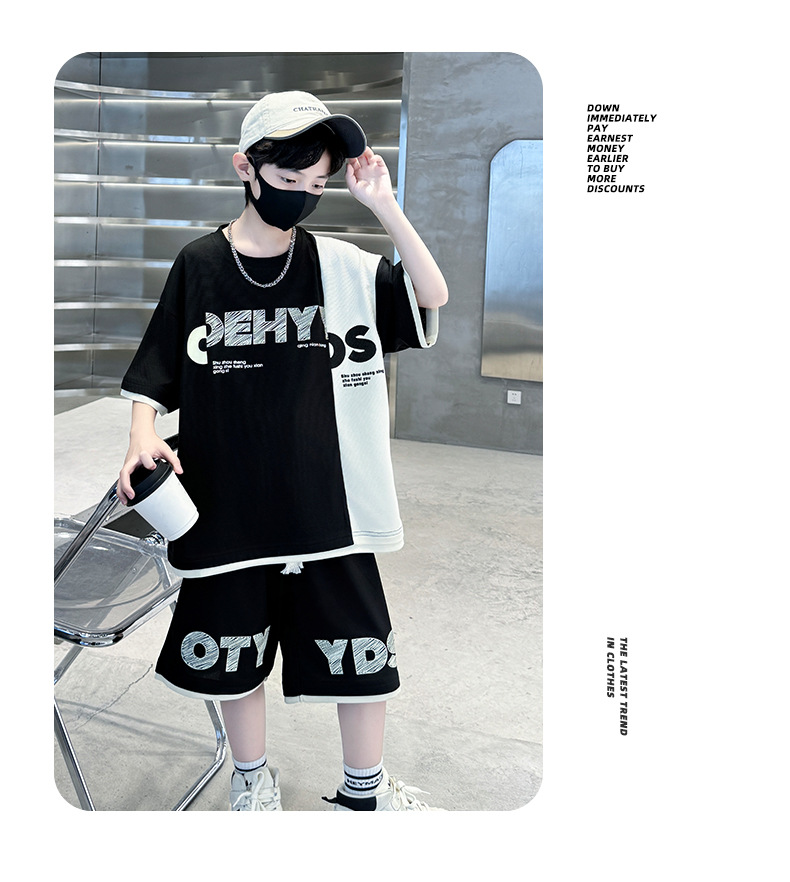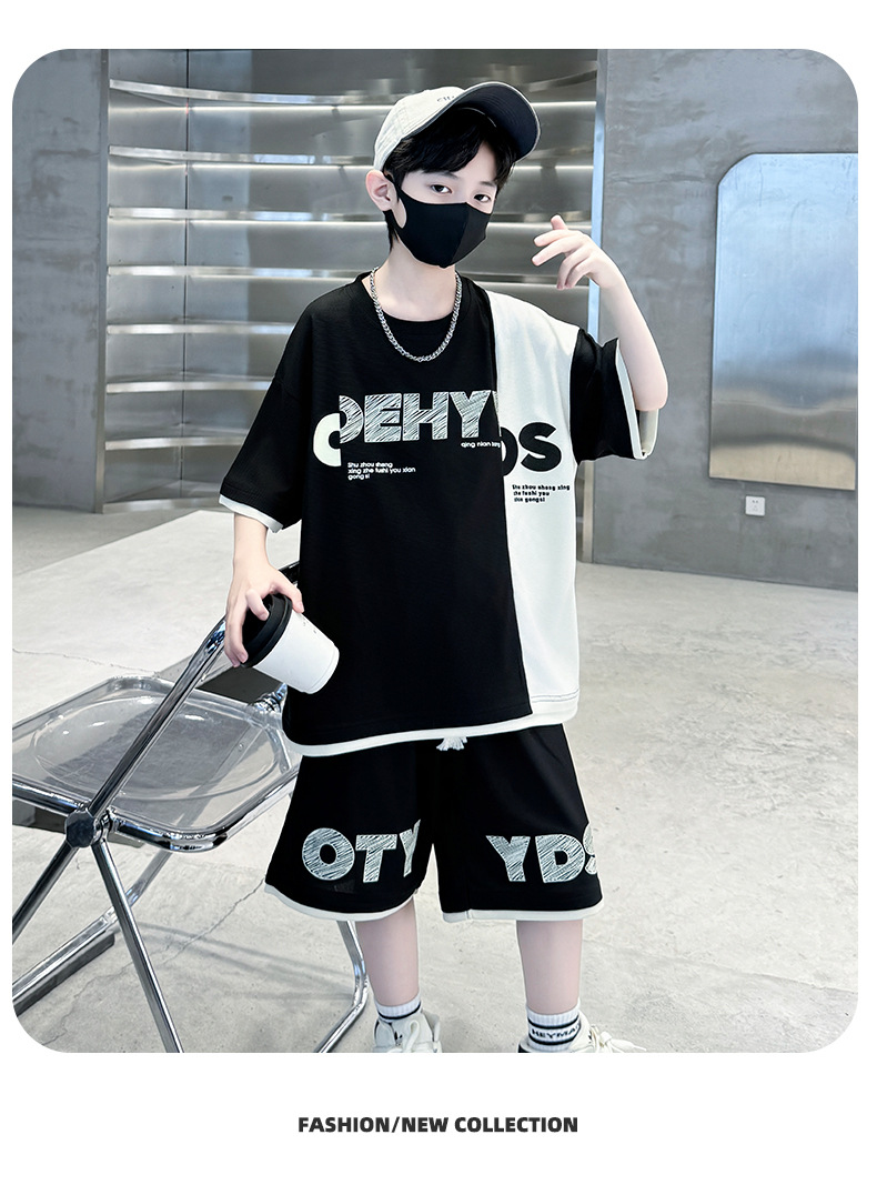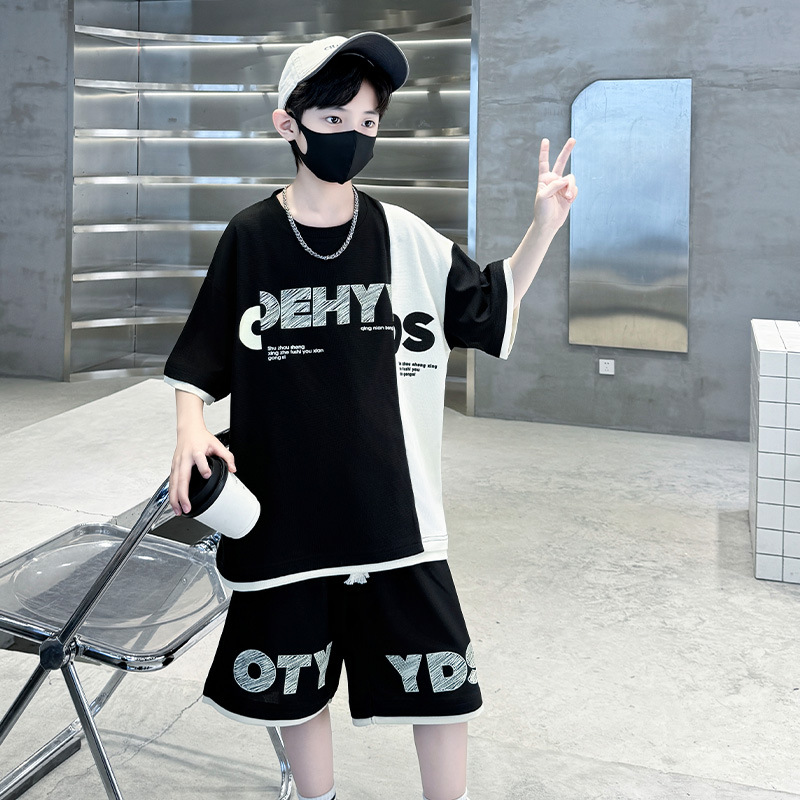 남학생 여름 반팔 티셔츠 편지 세트 2024 새로운 대형 어린이 여름 어린이 여름 바지 투피스 세트