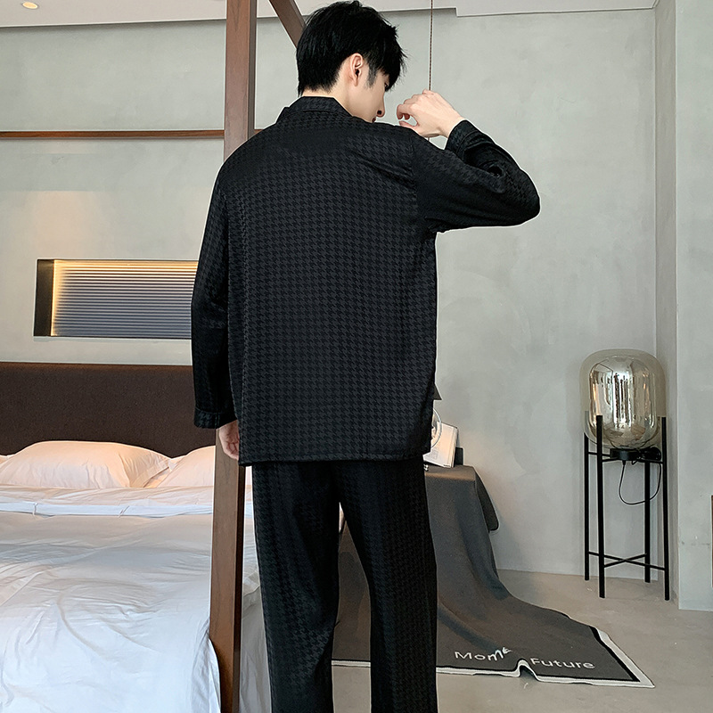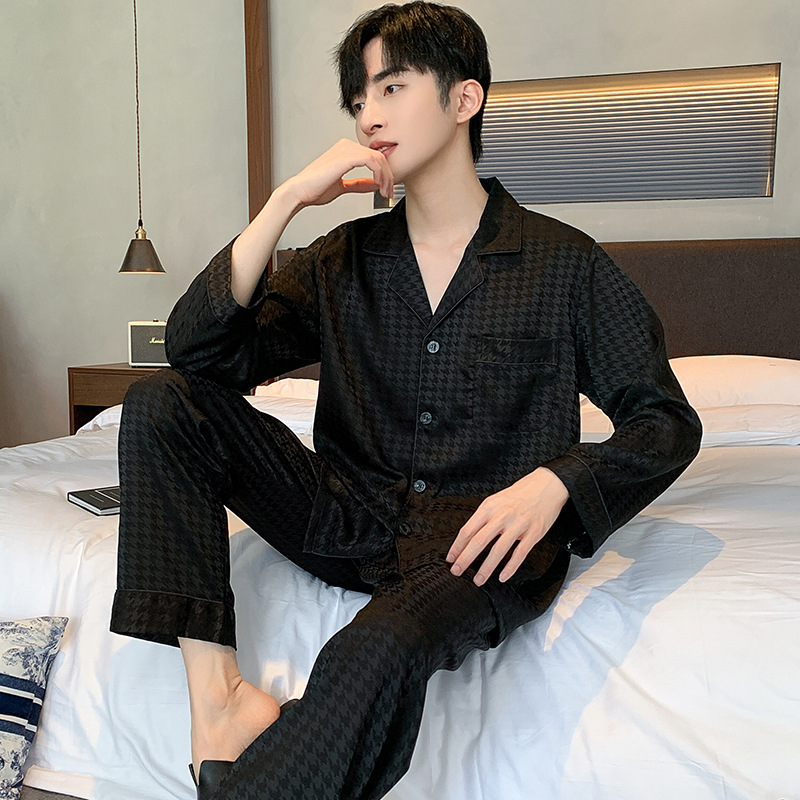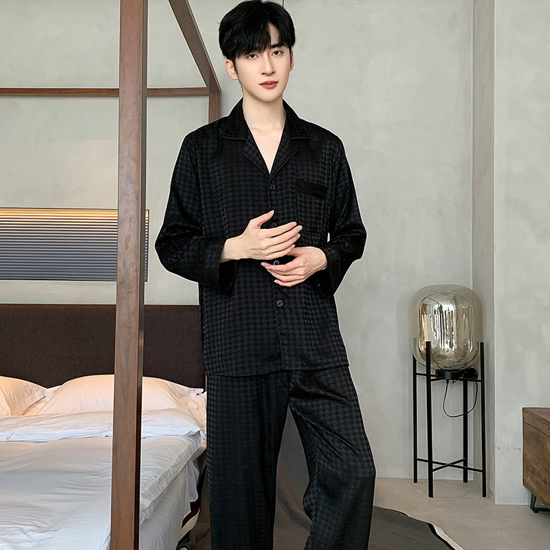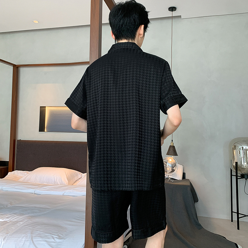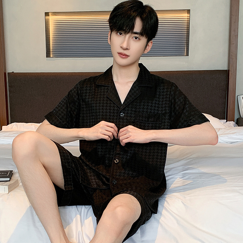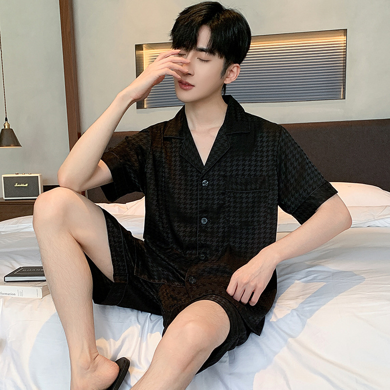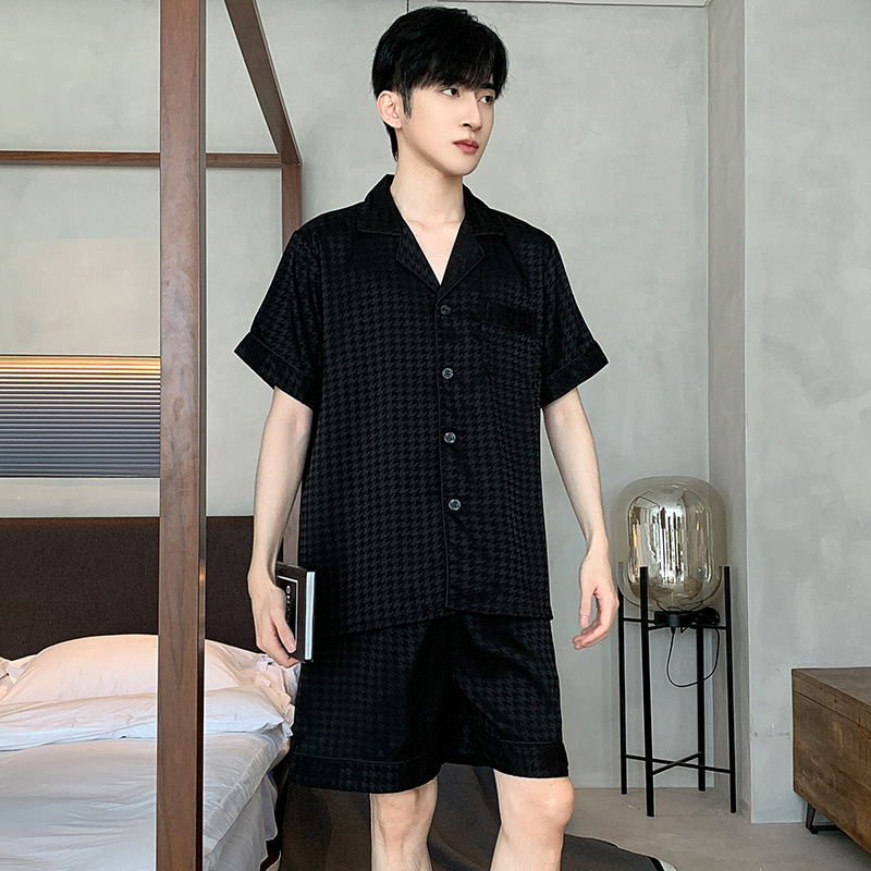 새틴 자카드 하운드 투스 남자 파자마 여름 반팔 카디건 남자 얇은 아이스 실크 아우터 루즈 홈 착용스토어 가기