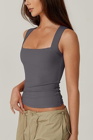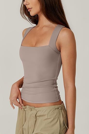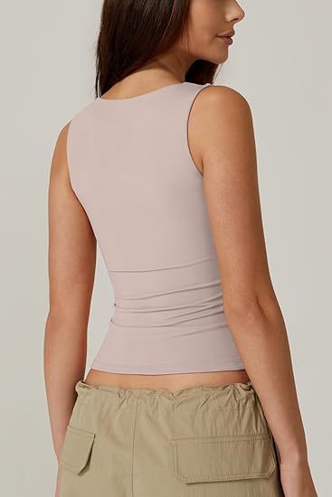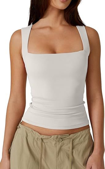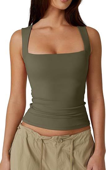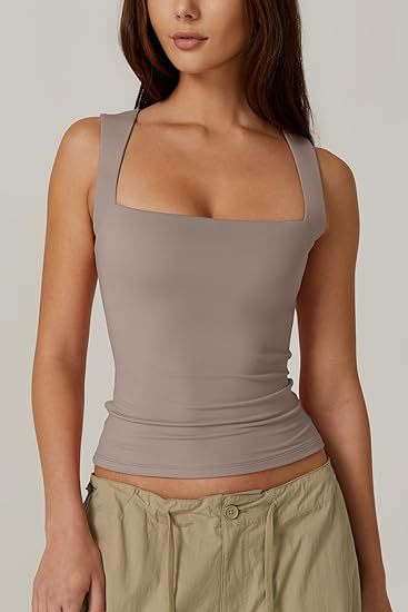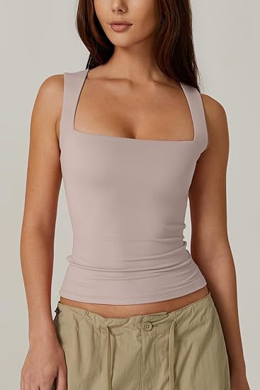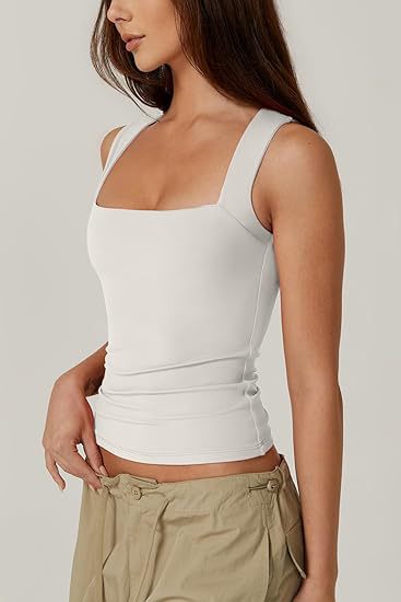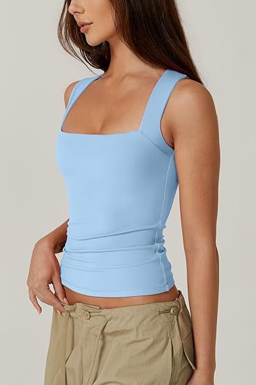 2024 새로운 아마존 여름 새로운 여성 스퀘어 칼라 민소매 더블 레이어 조끼 기본 타이트 티셔츠스토어 가기