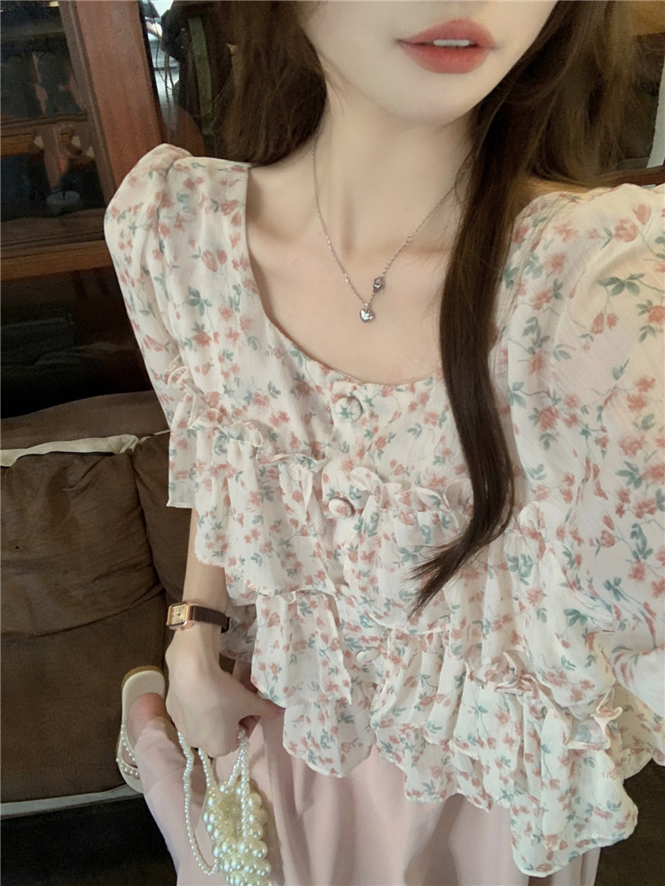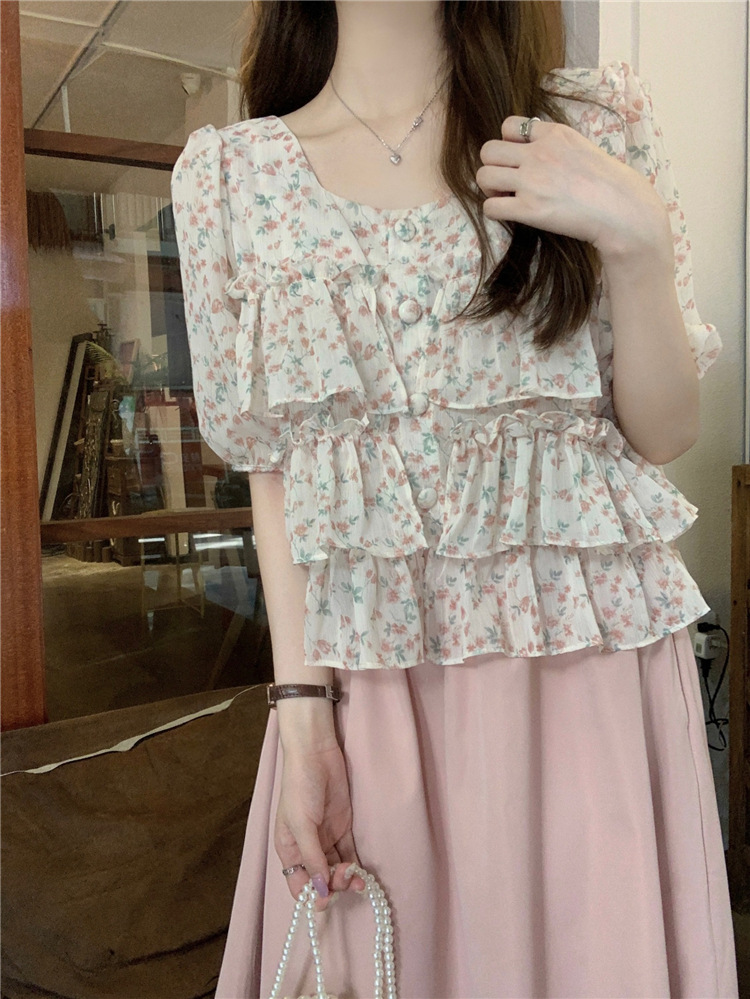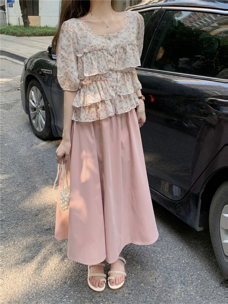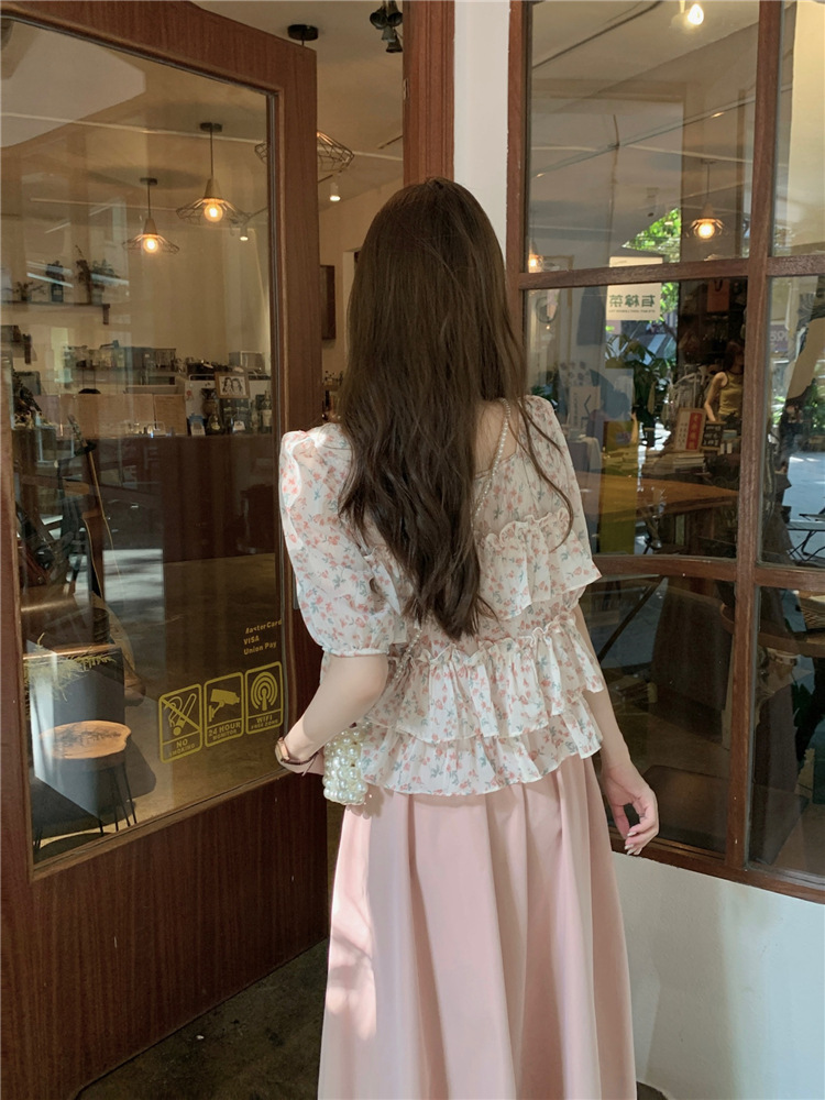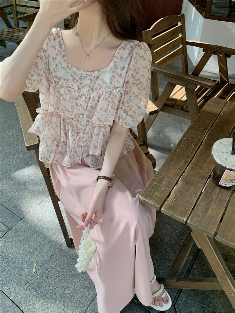 2024 년 여름 새로운 한국 스타일 신선한 스타일 꽃 탑 반팔 쉬폰 셔츠 스커트 A 라인 스커트 투피스 세트