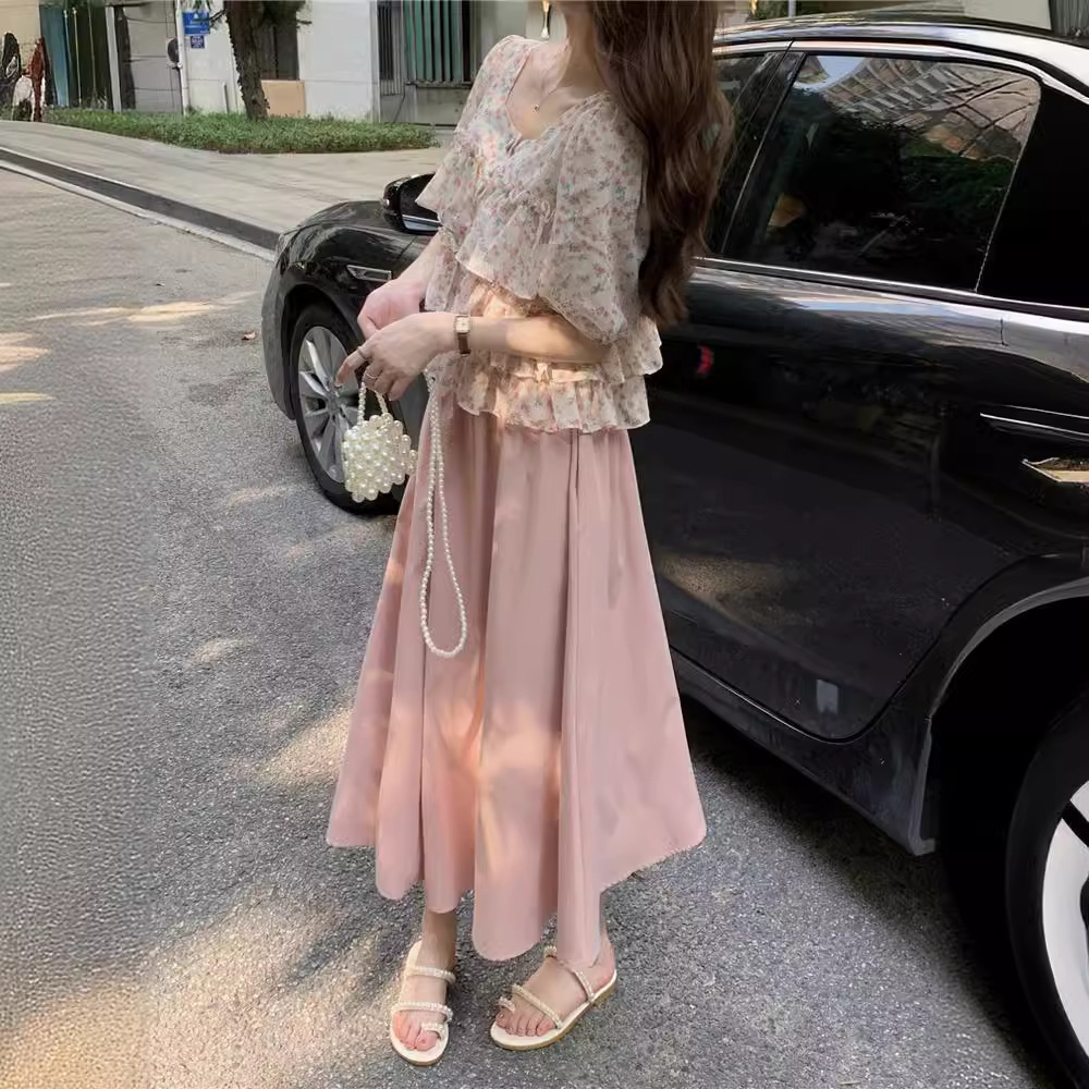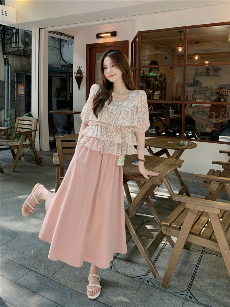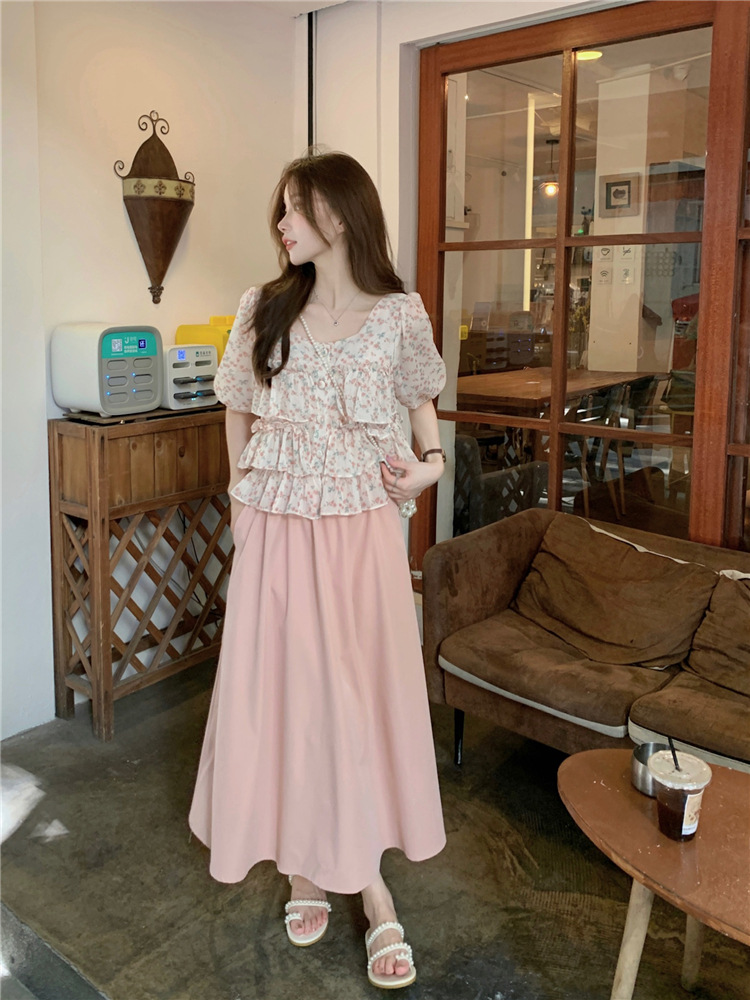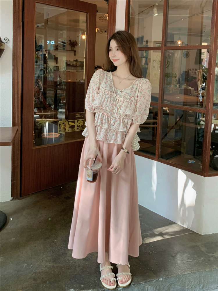 2024 년 여름 새로운 한국 스타일 신선한 스타일 꽃 탑 반팔 쉬폰 셔츠 스커트 A 라인 스커트 투피스 세트스토어 가기