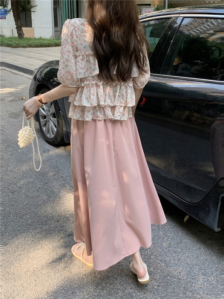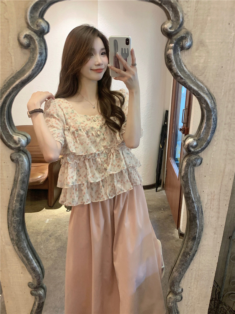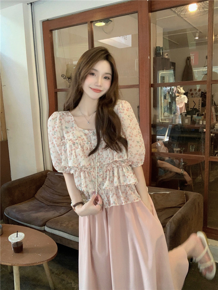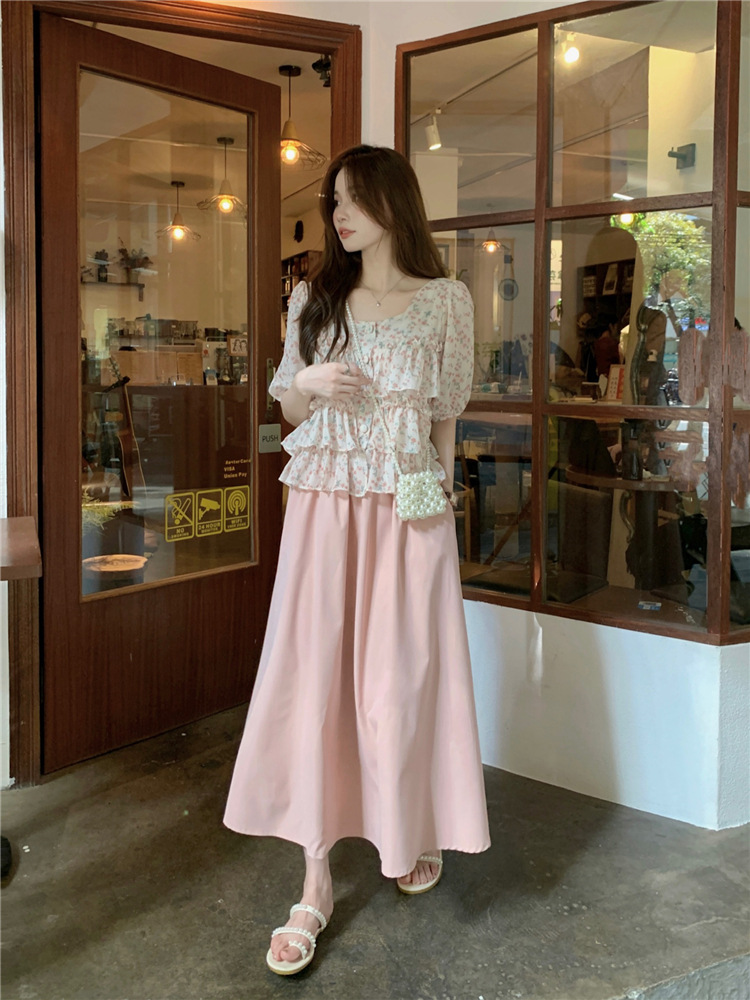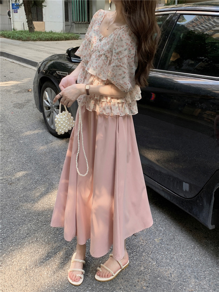 2024 년 여름 새로운 한국 스타일 신선한 스타일 꽃 탑 반팔 쉬폰 셔츠 스커트 A 라인 스커트 투피스 세트스토어 가기