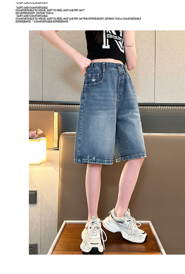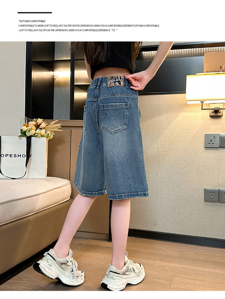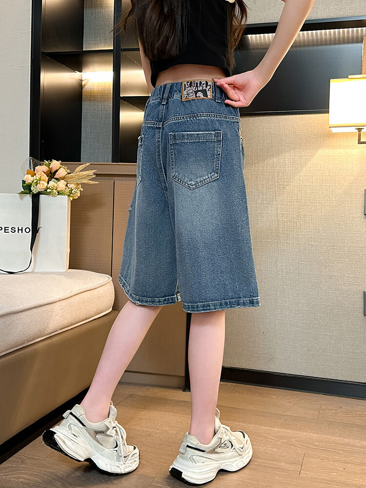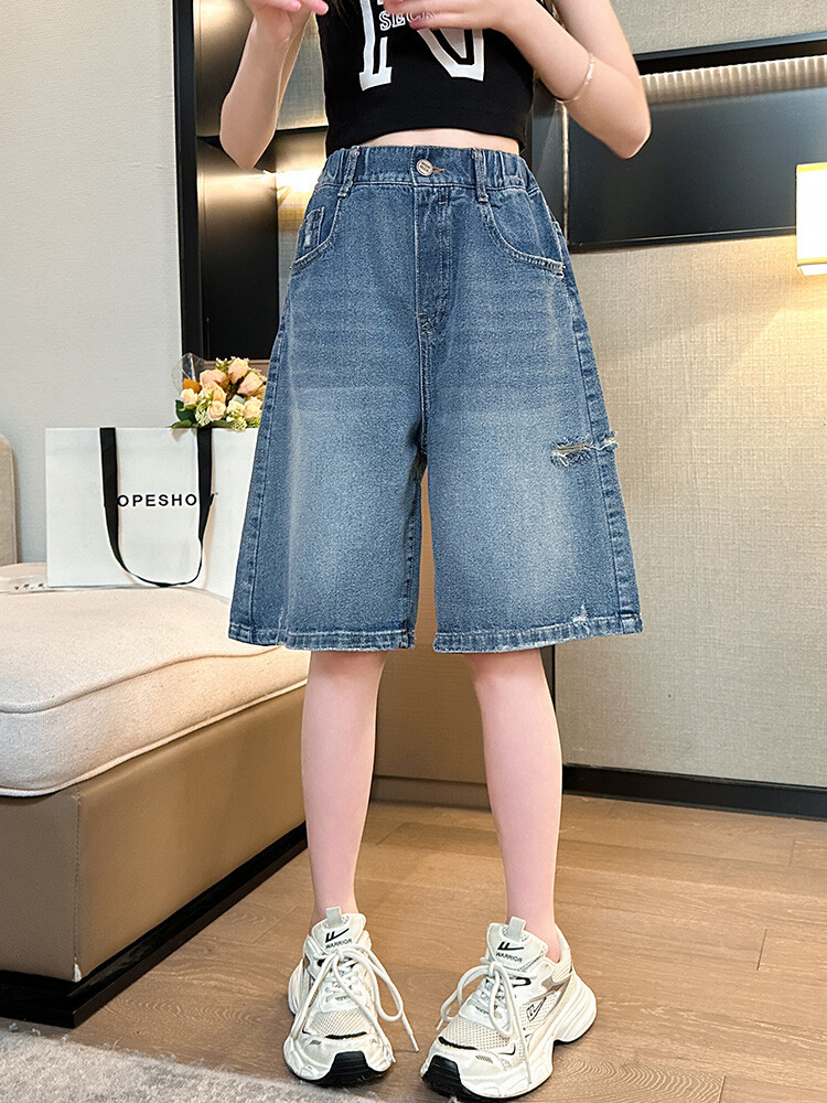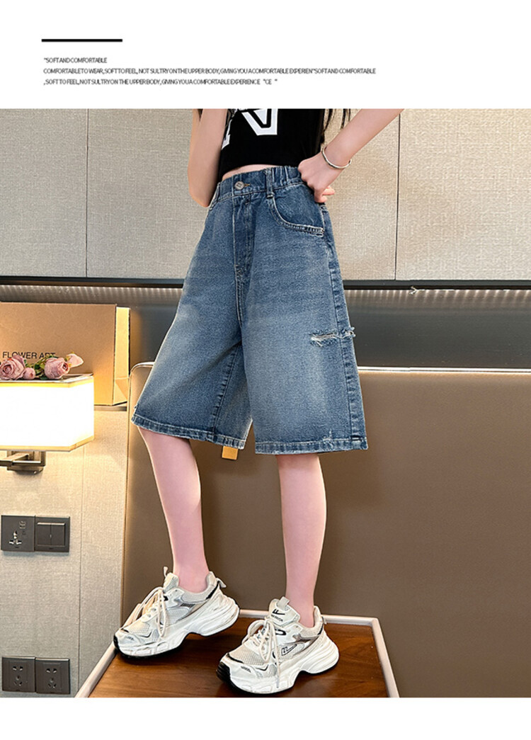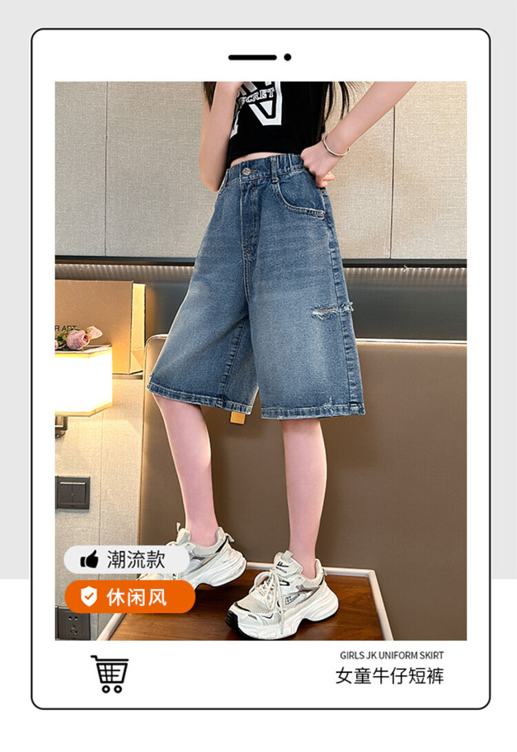 여아 데님 미드팬츠 2025 여름 스타일 찢어진 반바지 루즈한 5부 팬츠 중대형 아동복 여아 바지 트렌디