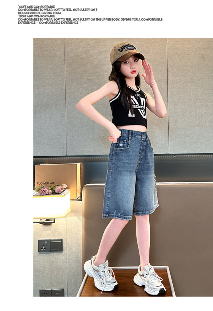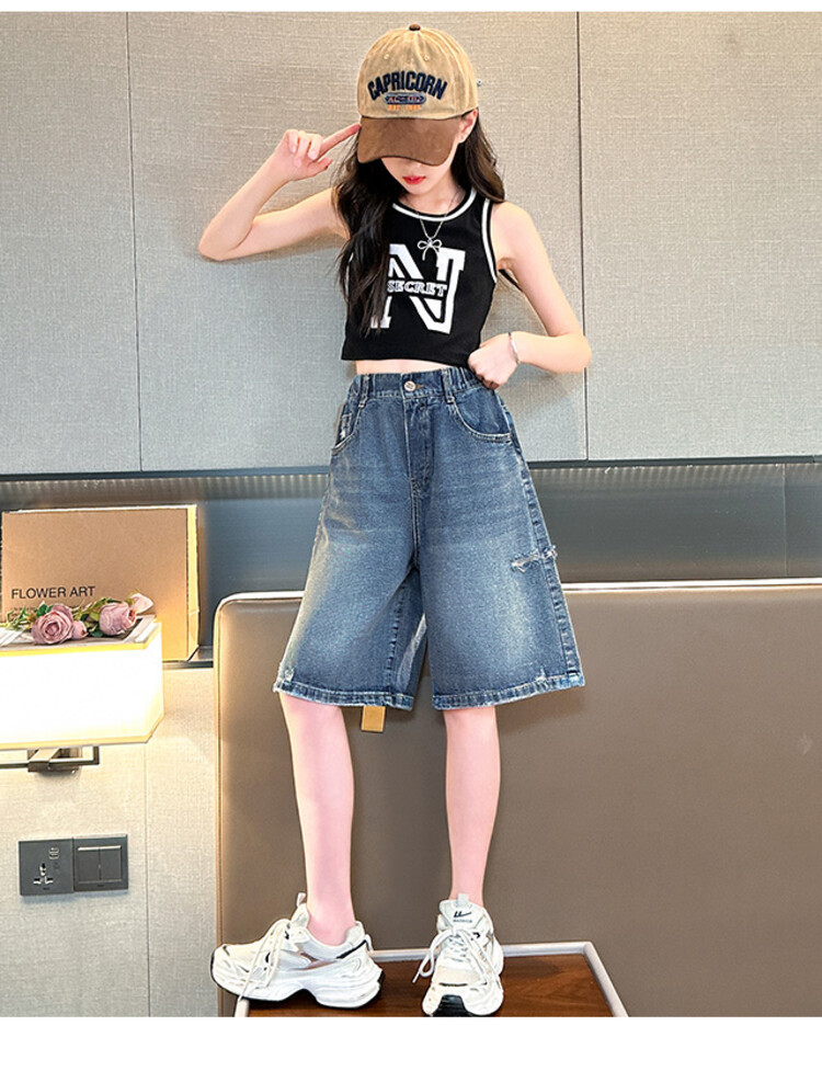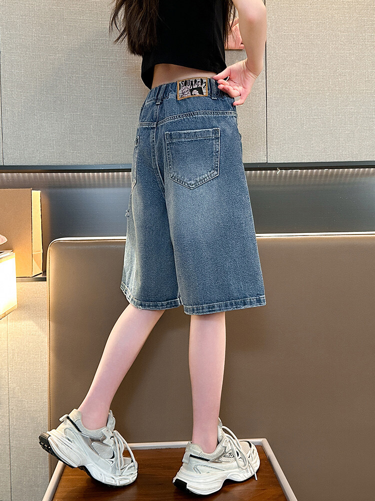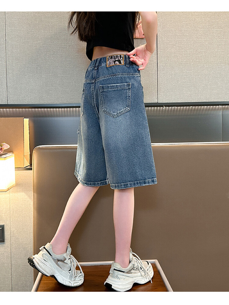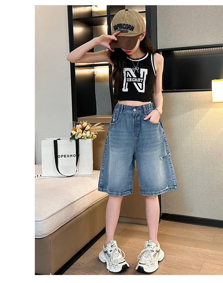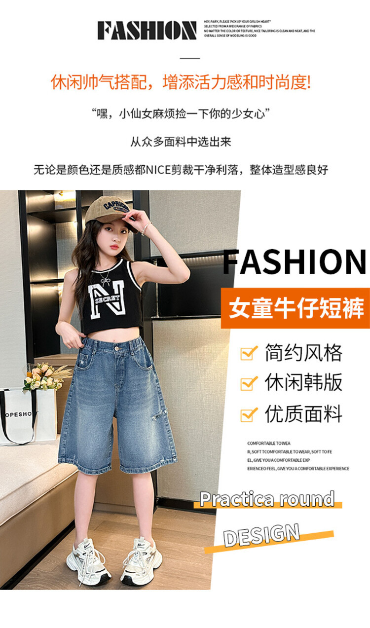 여아 데님 미드팬츠 2025 여름 스타일 찢어진 반바지 루즈한 5부 팬츠 중대형 아동복 여아 바지 트렌디