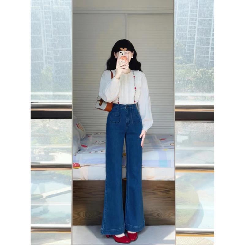 150 짧은 짧은 복고풍 마이크로 혼 스트레이트 청바지 여성의 가을 높은 허리 좁은 버전 넓은 다리 바지 xs 높은 착용스토어 가기