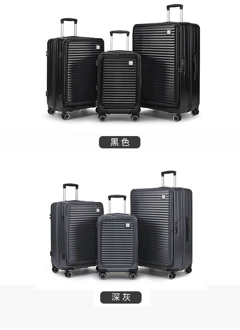 3 피스 전면 오픈 뚜껑 수하물 케이스 ABS PC 신소재 사이드 오프닝 가방 사용자 정의 로고 지퍼 트롤리 케이스스토어 가기