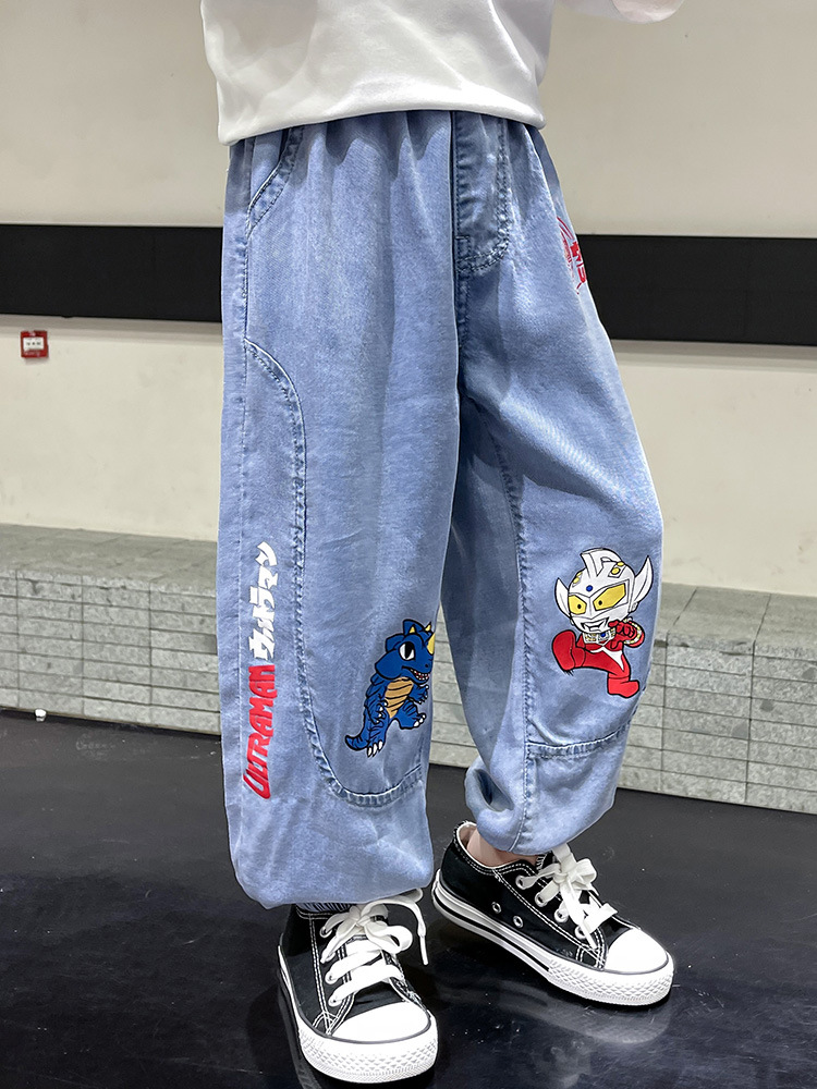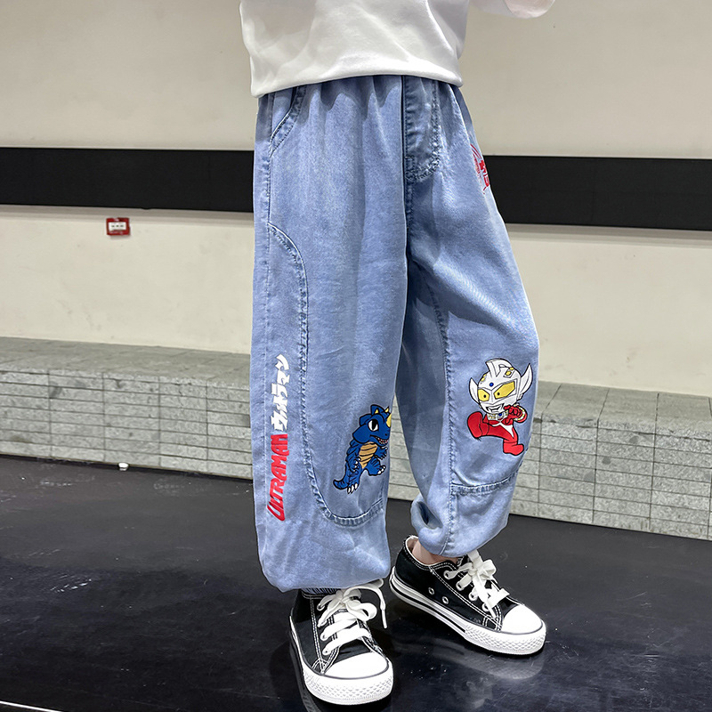 소년 모기 방지 바지 어린이 2024 새 여름 옷 아기 여름 얼음 실크 얇은 데님 바지 울트라 맨 옷 유행스토어 가기