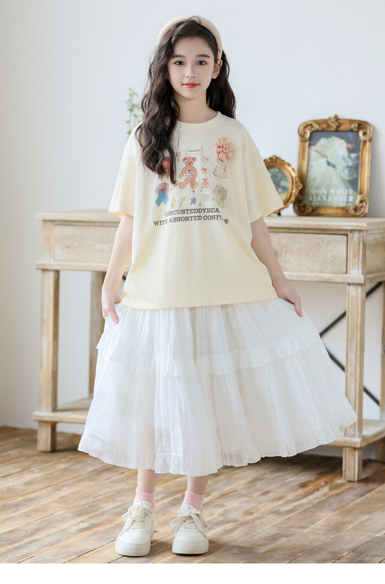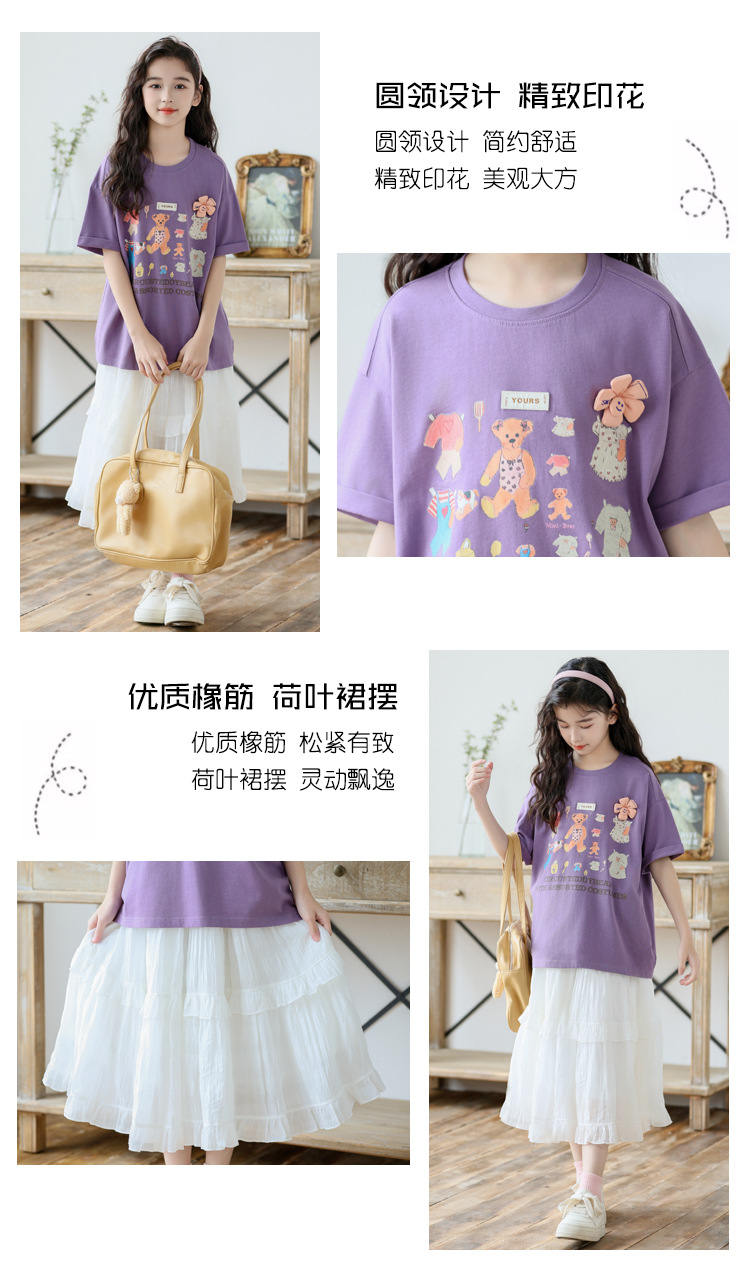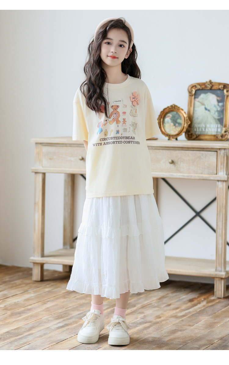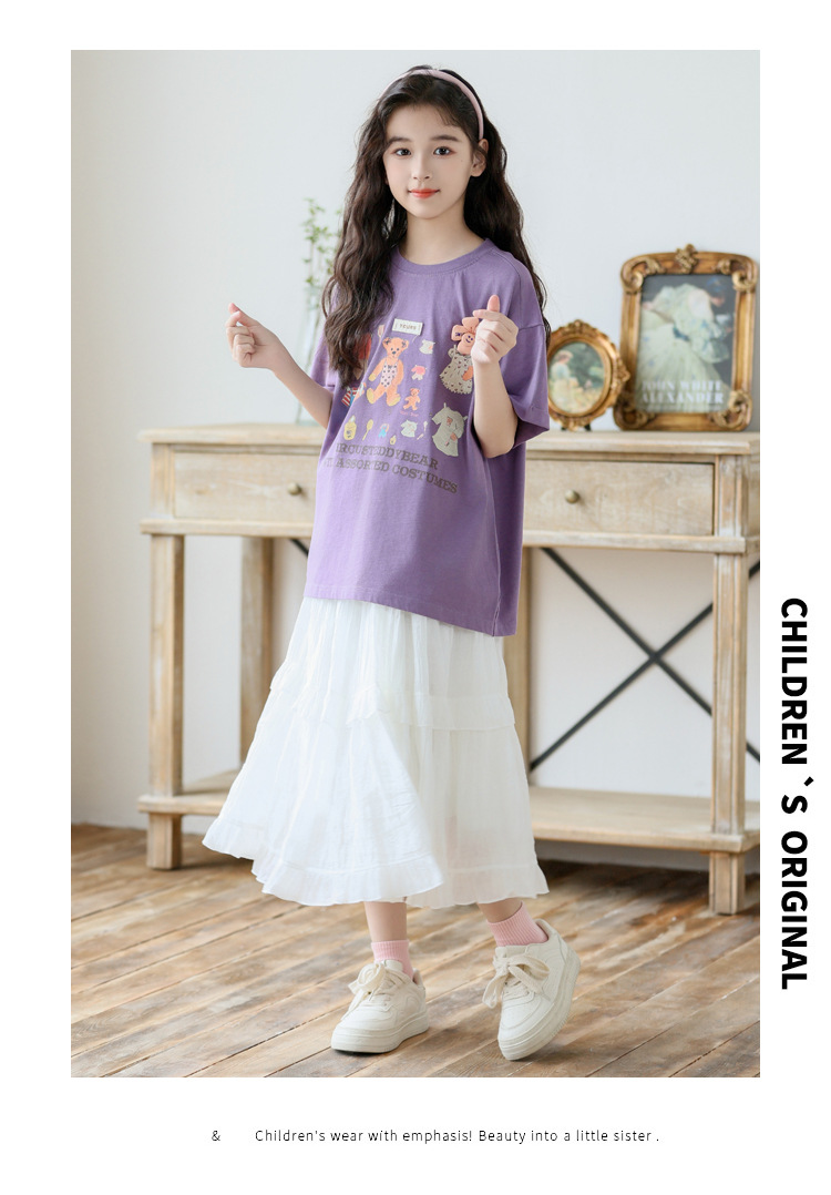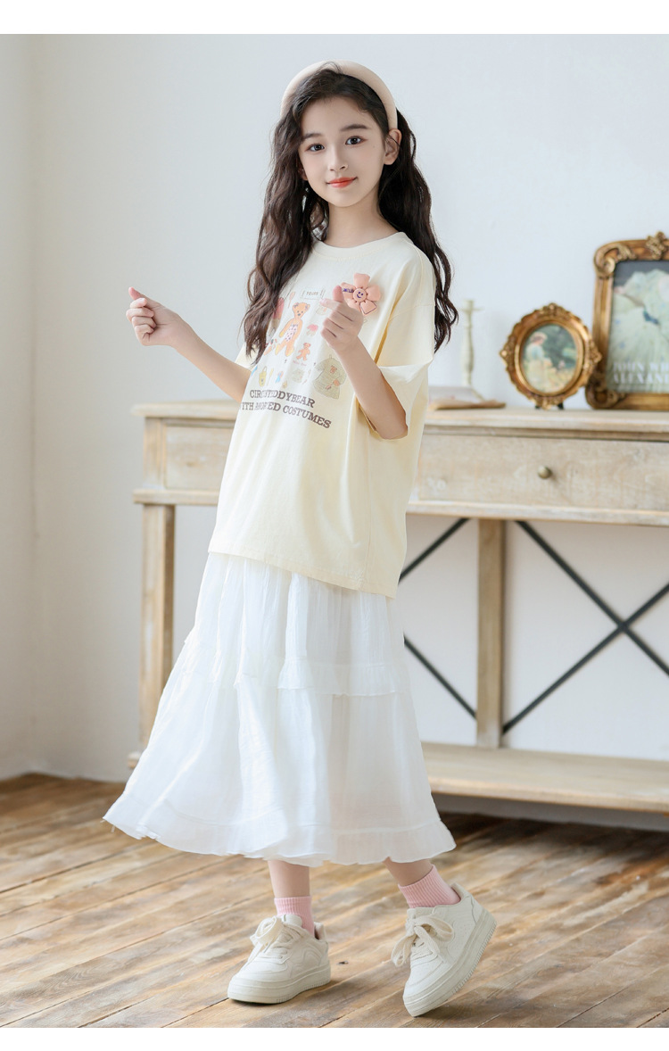 어린이 및 소녀 스커트 여름 세트 2024 새로운 한국 스타일 어린이 프린트 티셔츠 투피스 세트
