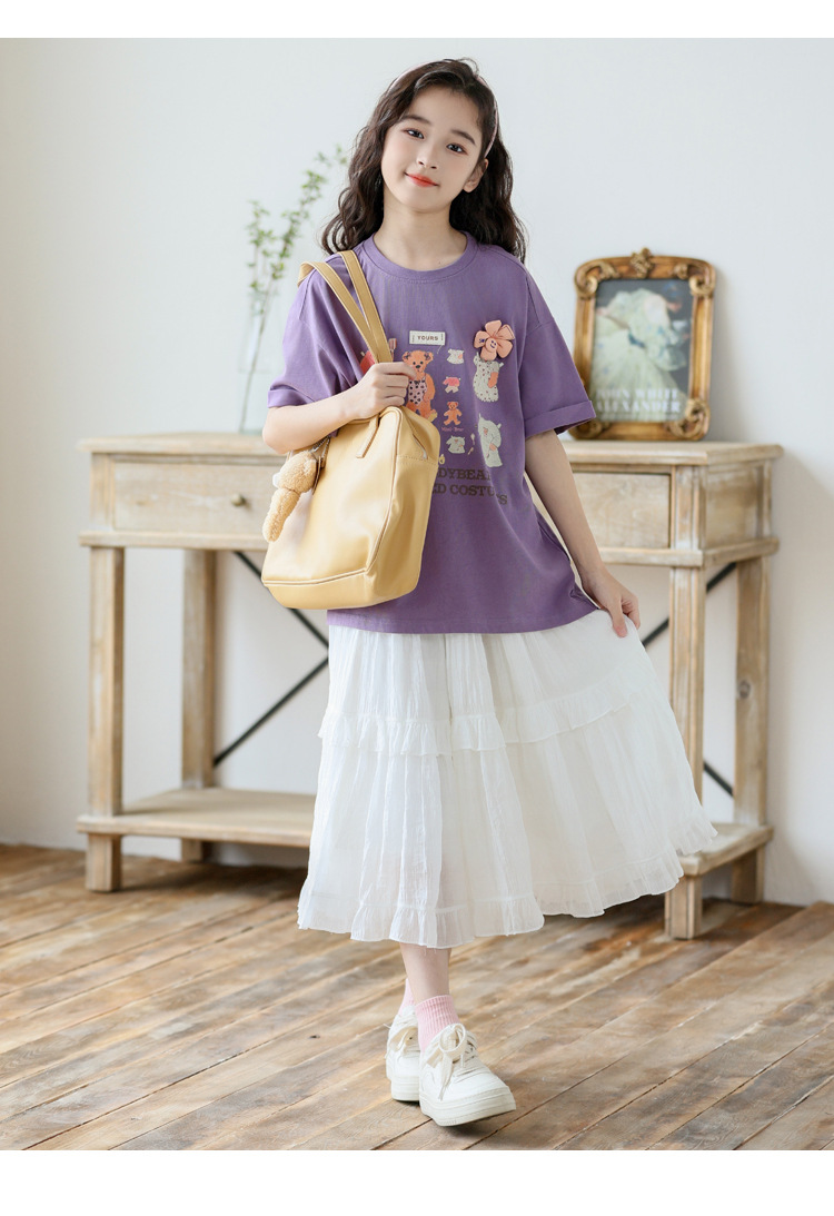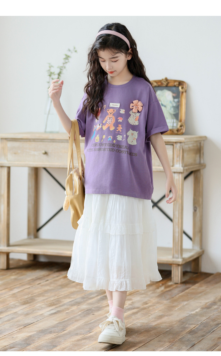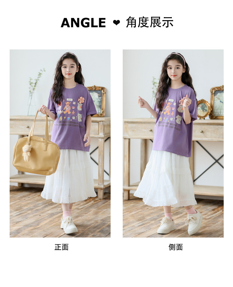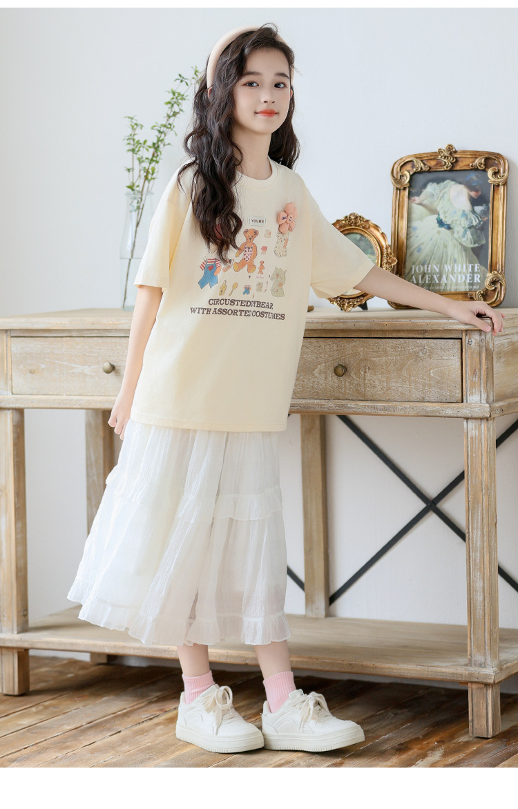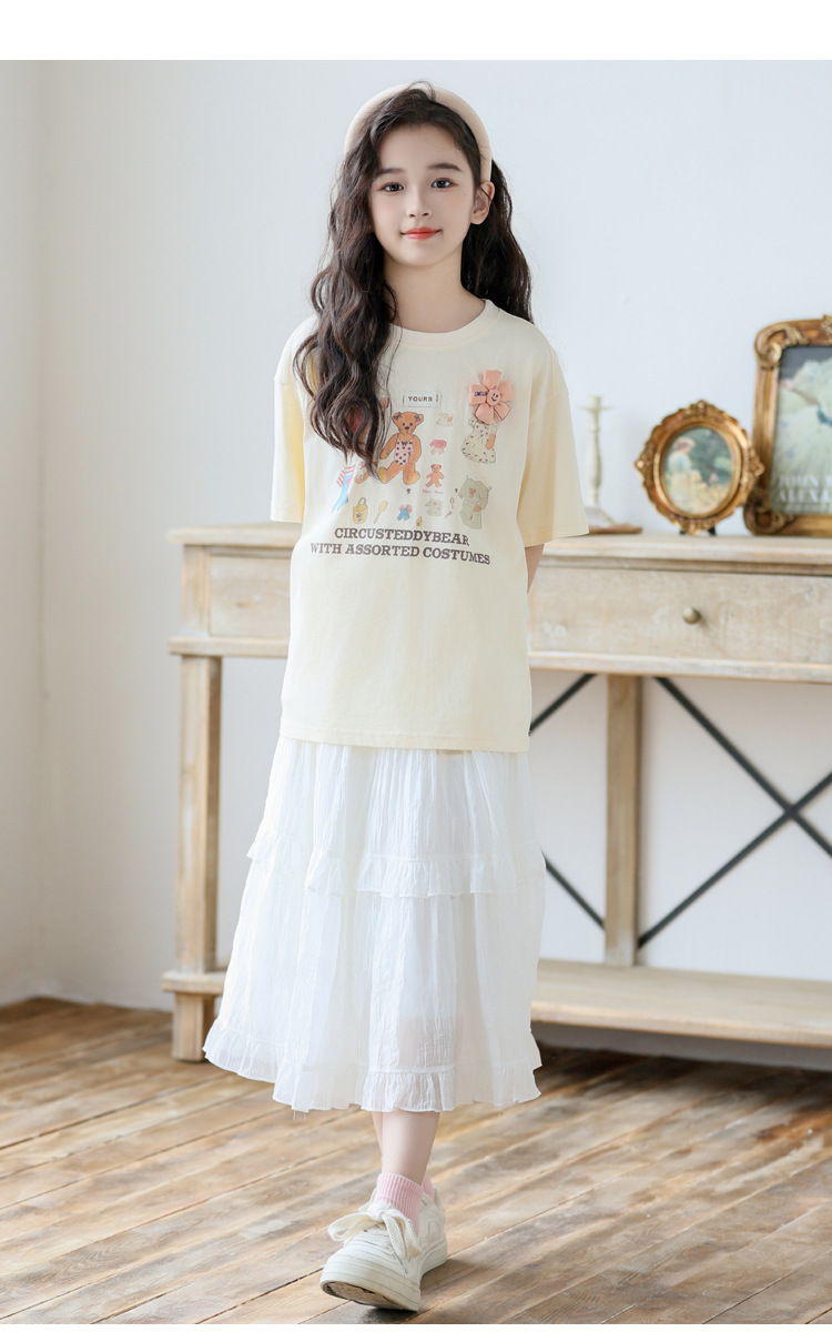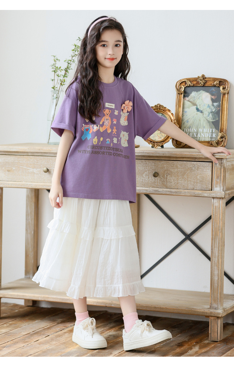 어린이 및 소녀 스커트 여름 세트 2024 새로운 한국 스타일 어린이 프린트 티셔츠 투피스 세트