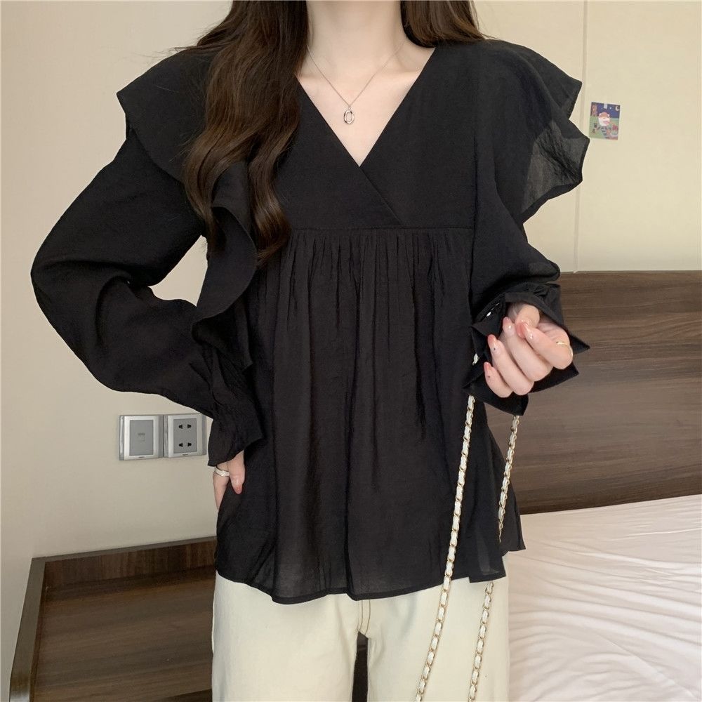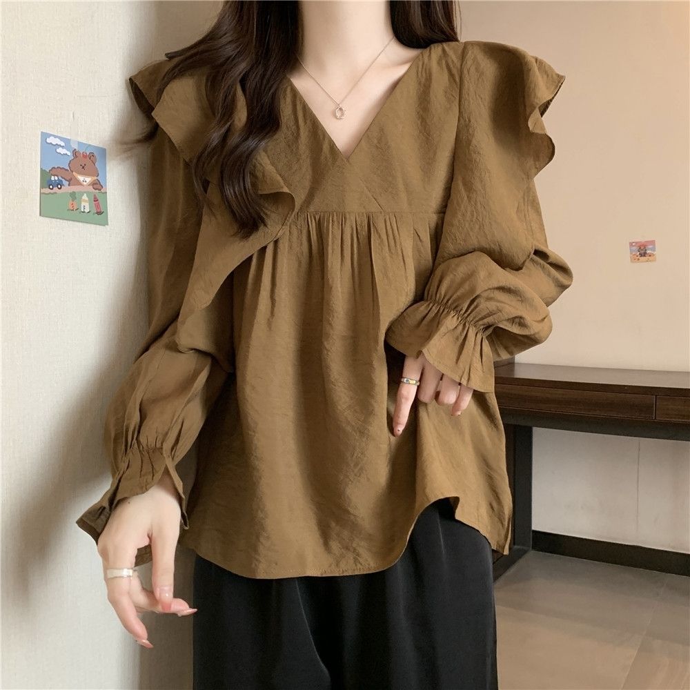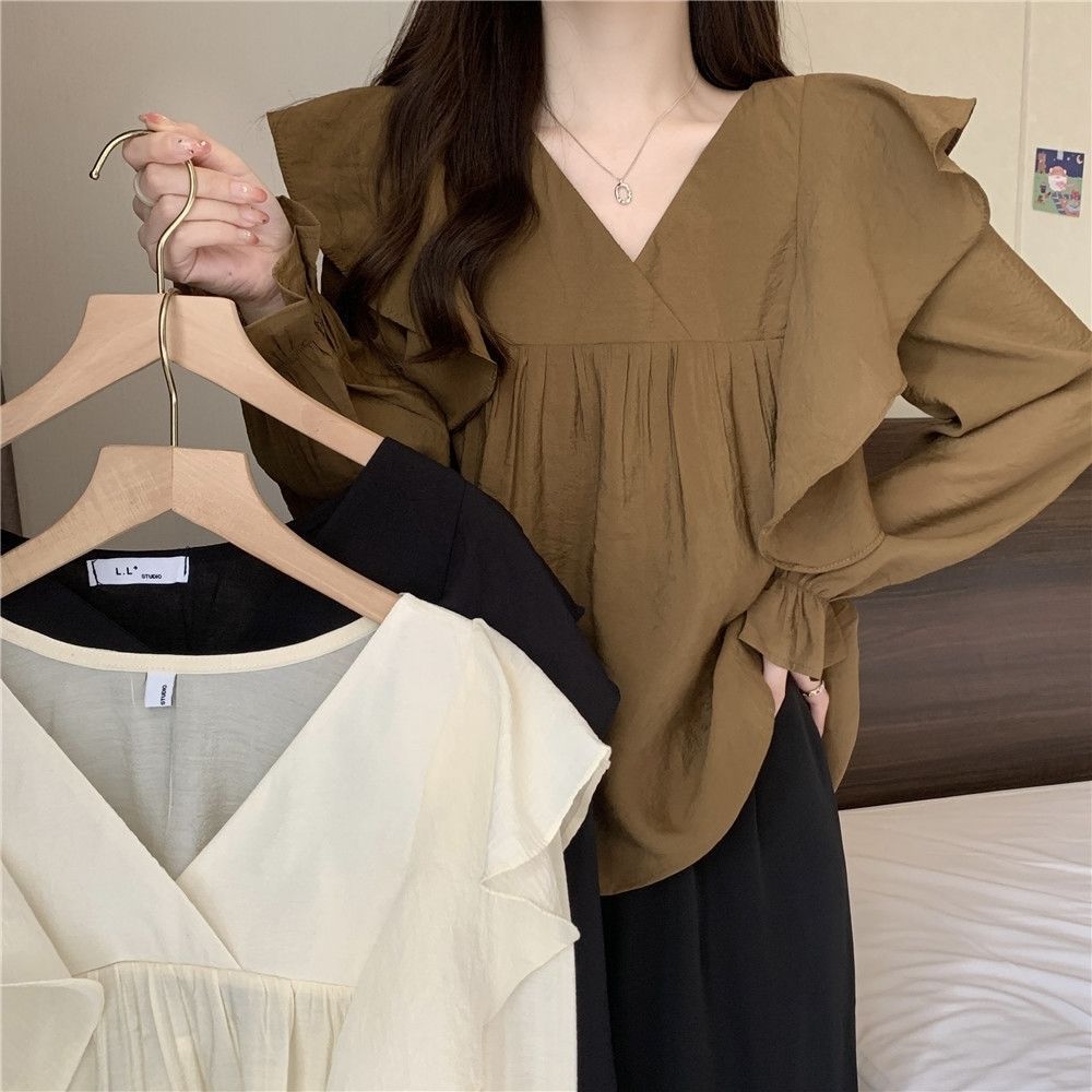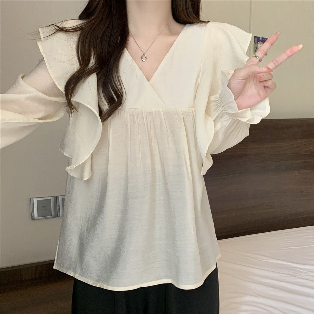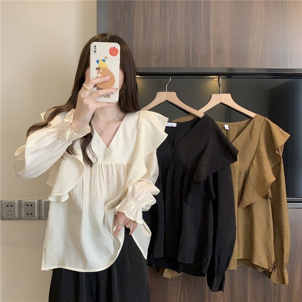 플러스 사이즈 프렌치 스타일 V 칼라 러플 칼라 긴팔 셔츠 여성용 봄 통통녀 느슨한 슬리밍 세련된 배꼽 커버 탑스토어 가기