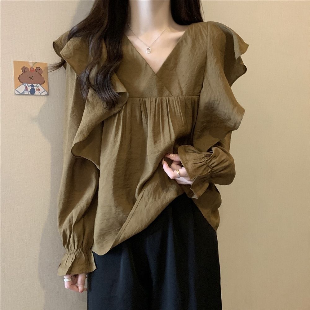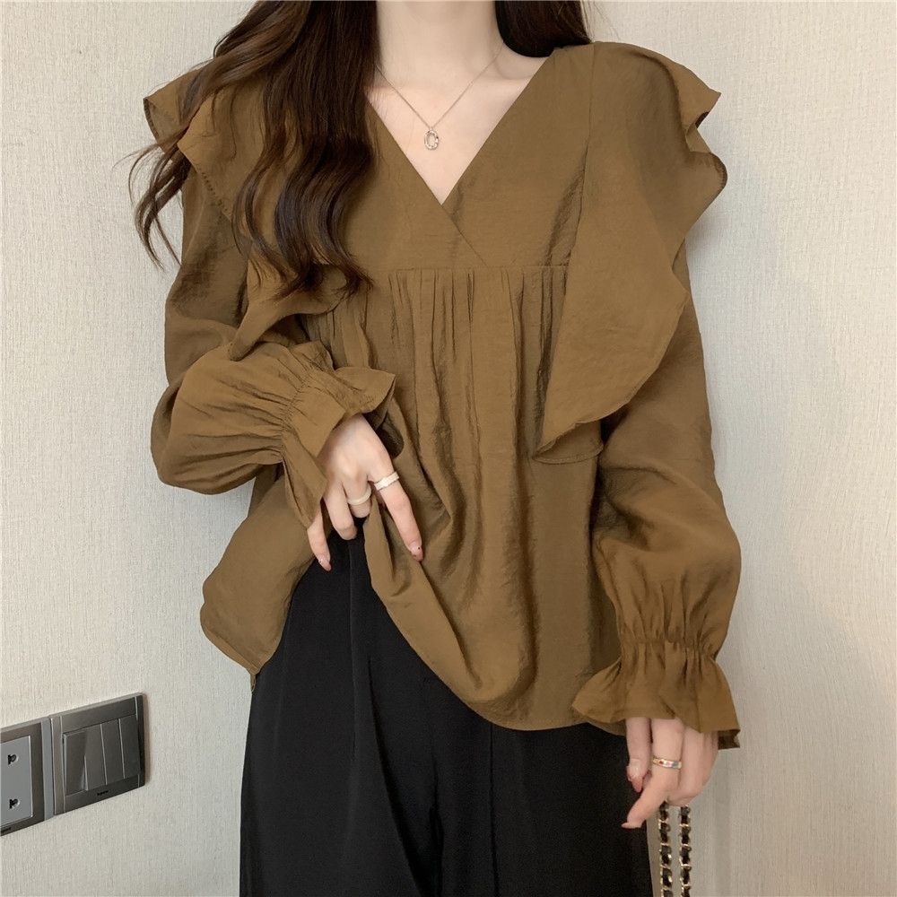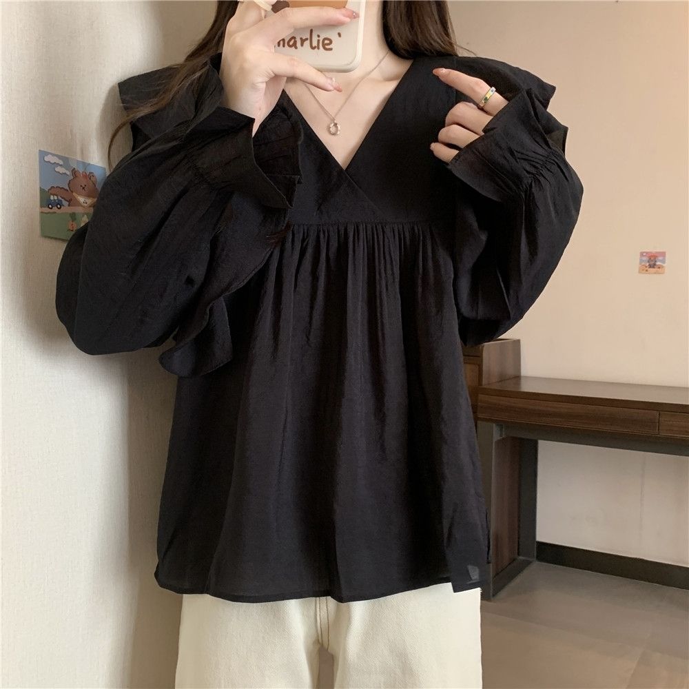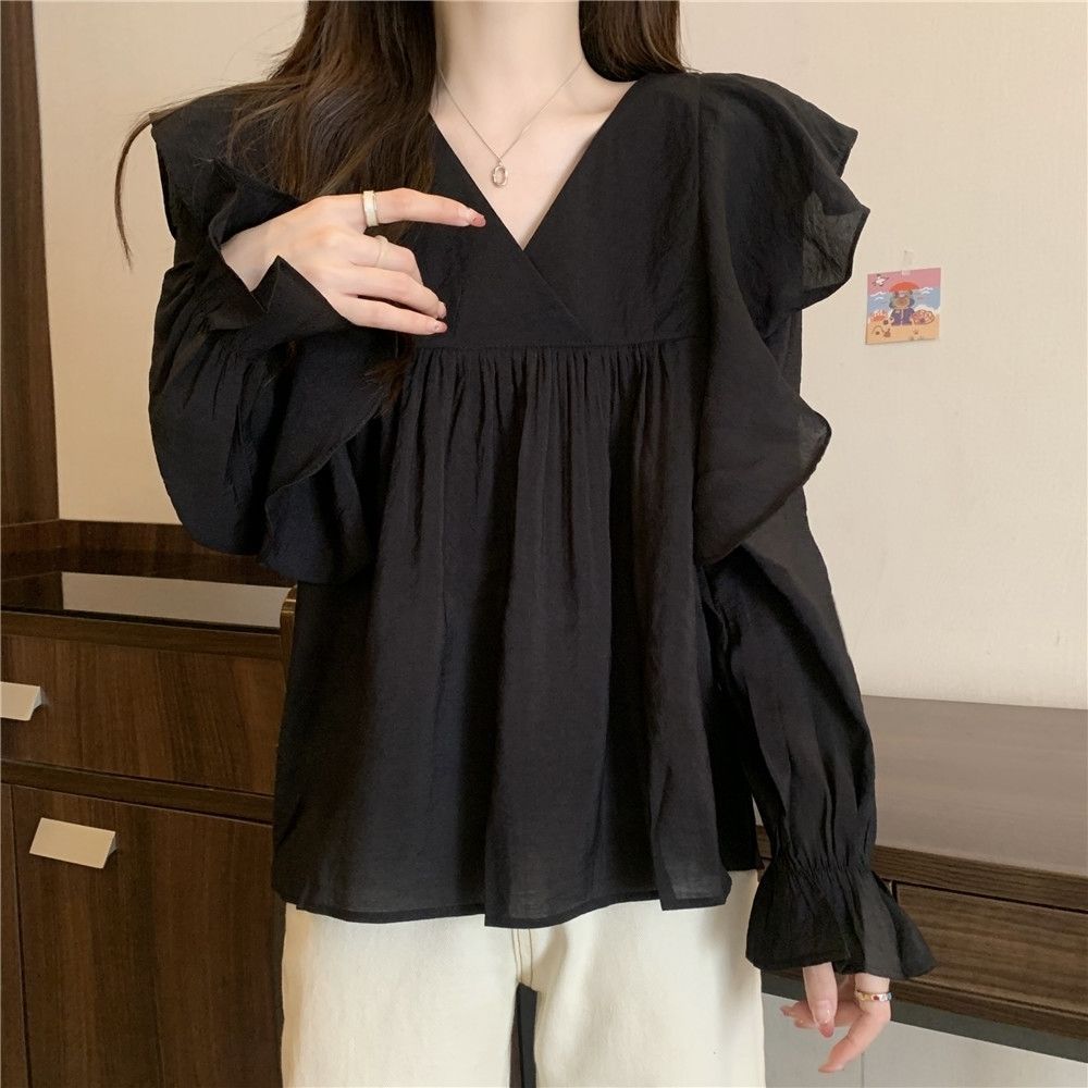 플러스 사이즈 프렌치 스타일 V 칼라 러플 칼라 긴팔 셔츠 여성용 봄 통통녀 느슨한 슬리밍 세련된 배꼽 커버 탑스토어 가기