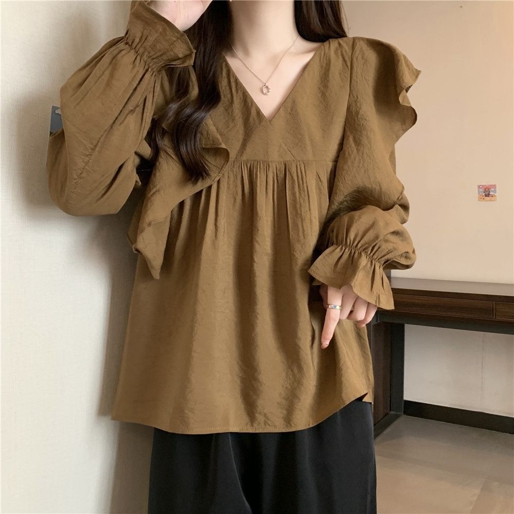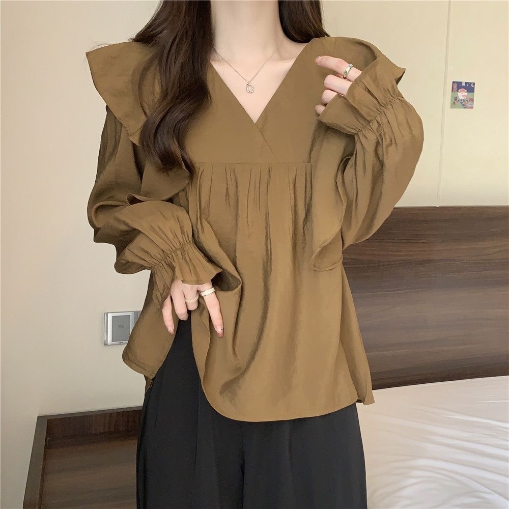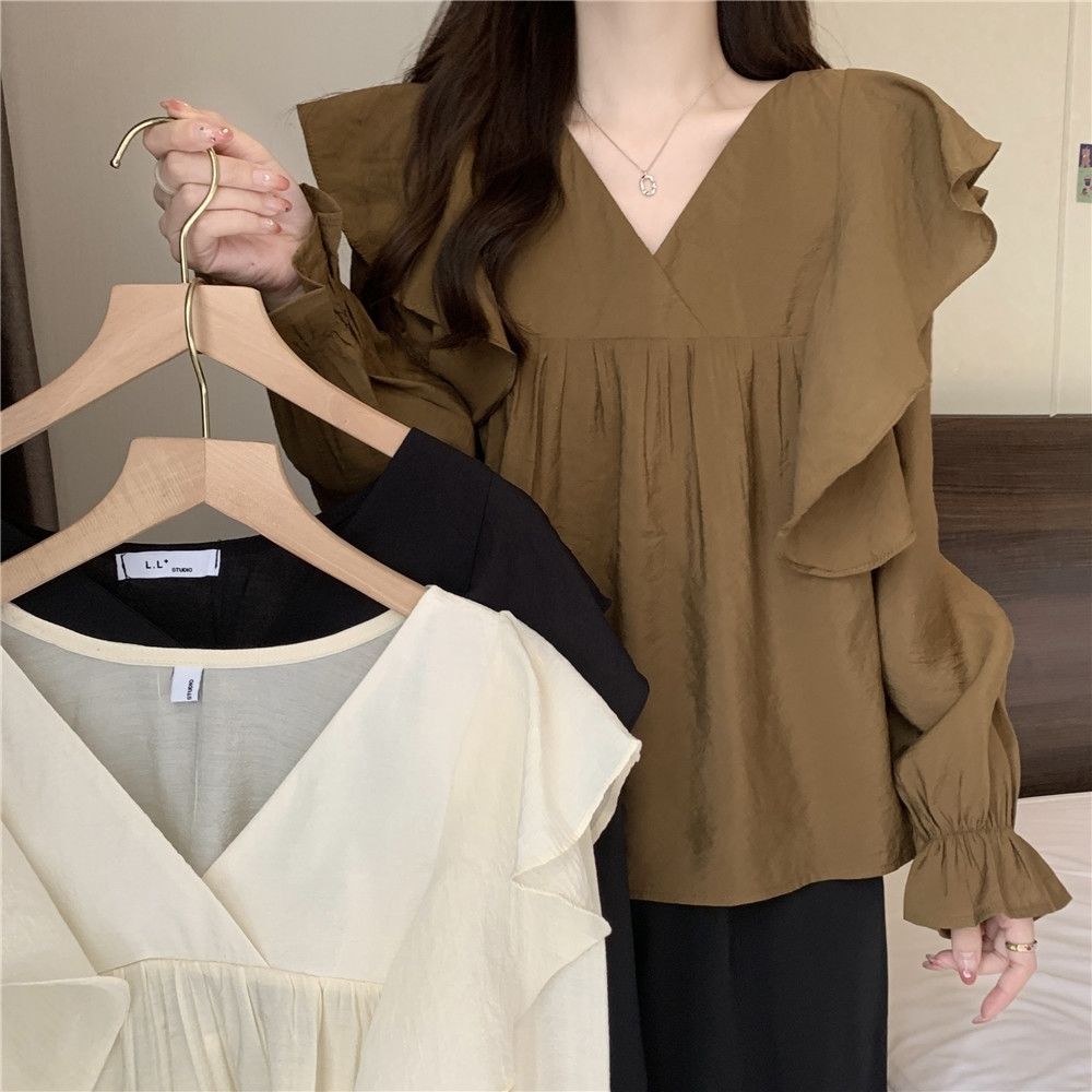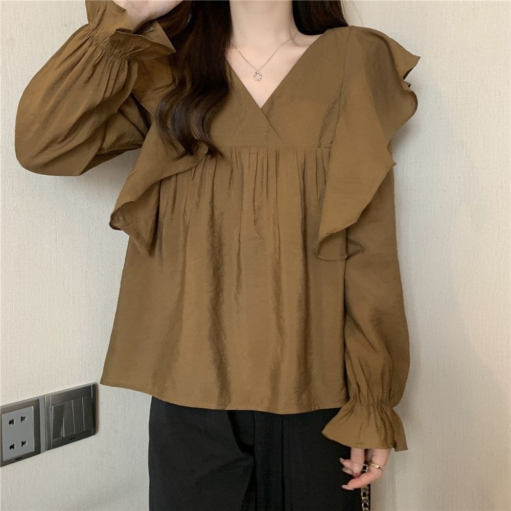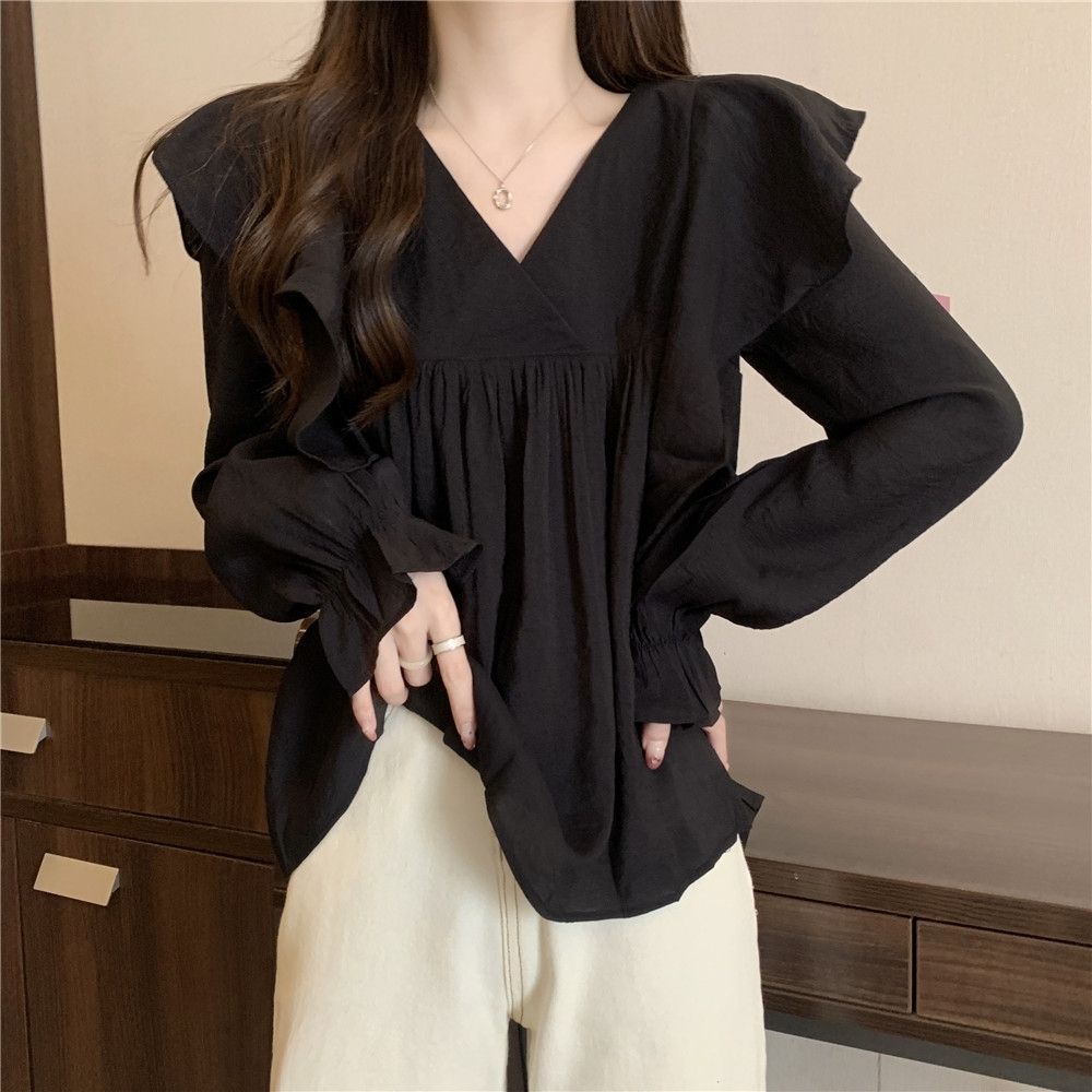 플러스 사이즈 프렌치 스타일 V 칼라 러플 칼라 긴팔 셔츠 여성용 봄 통통녀 느슨한 슬리밍 세련된 배꼽 커버 탑스토어 가기