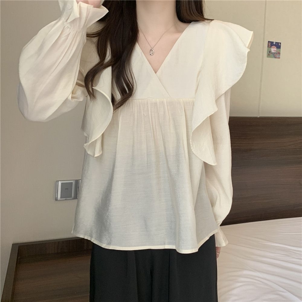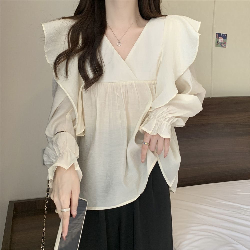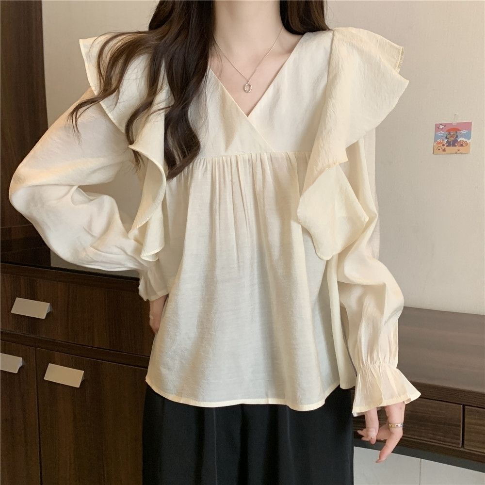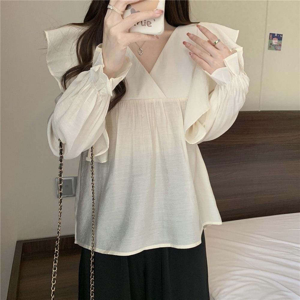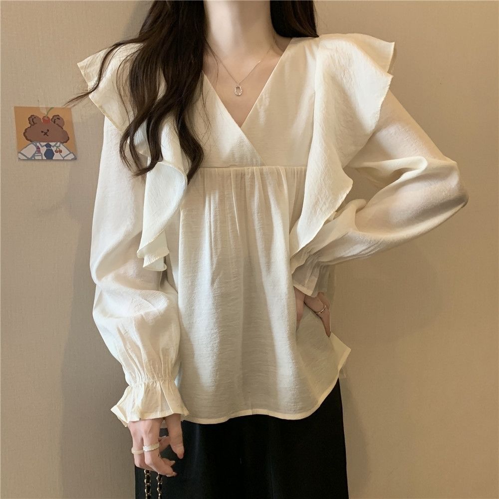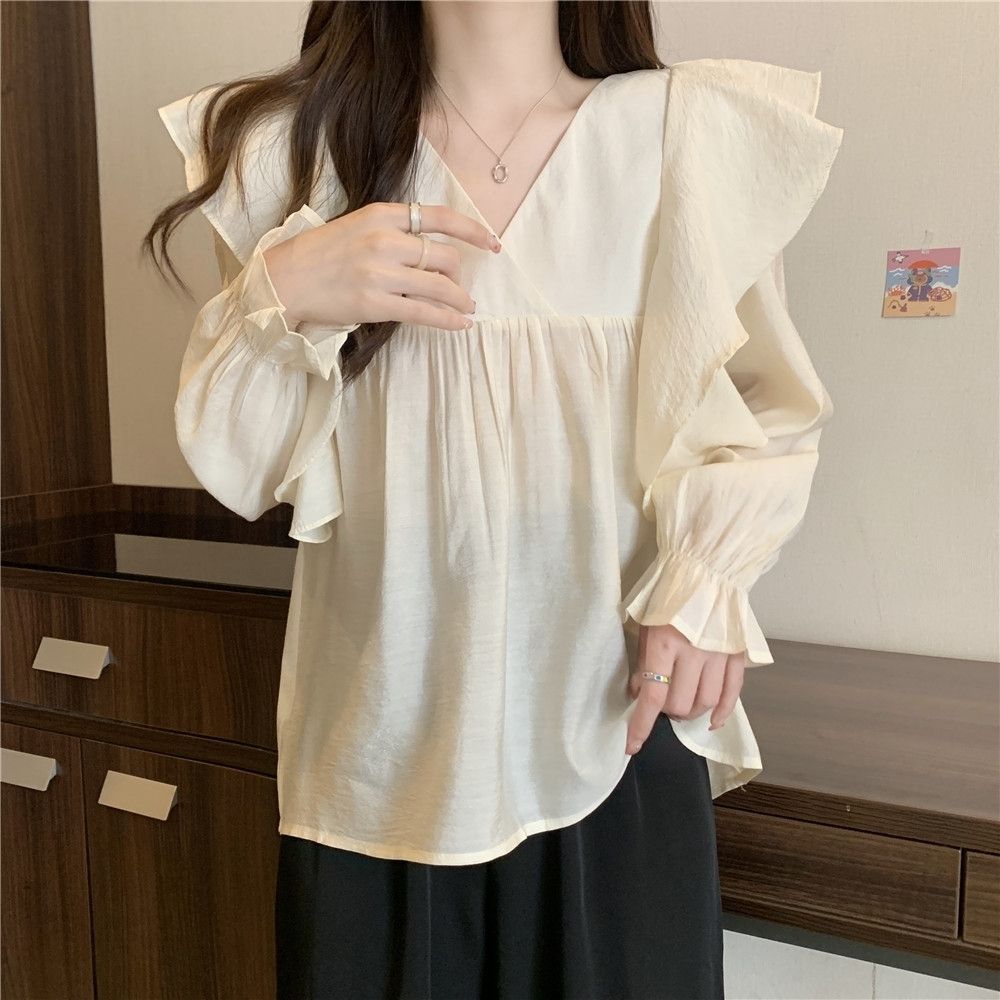 플러스 사이즈 프렌치 스타일 V 칼라 러플 칼라 긴팔 셔츠 여성용 봄 통통녀 느슨한 슬리밍 세련된 배꼽 커버 탑