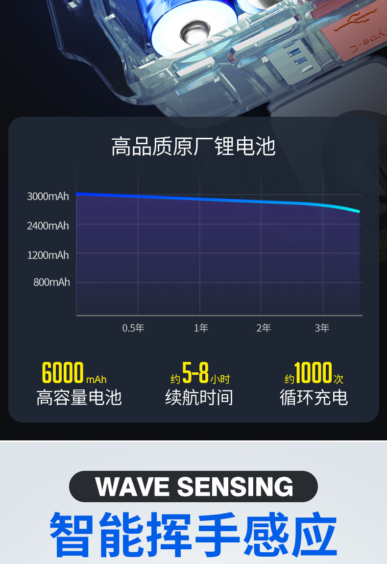 供电:内置18650锂电池*2,总容量2400mAh,