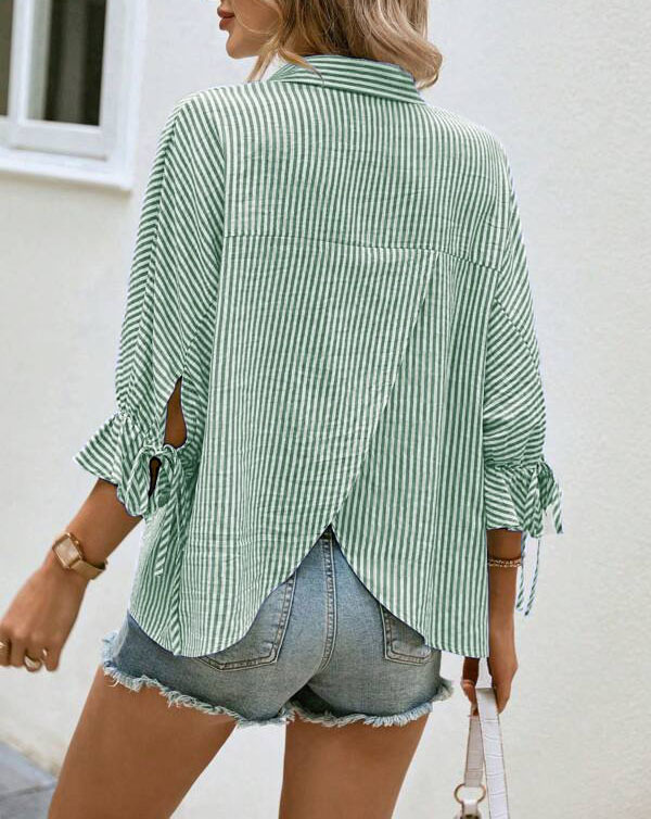 2024 유럽과 미국의 국경 봄과 여름 새로운 줄무늬 뿔 박쥐 소매 7 점 슬리브 백 스플릿 V 넥 캐주얼 셔츠