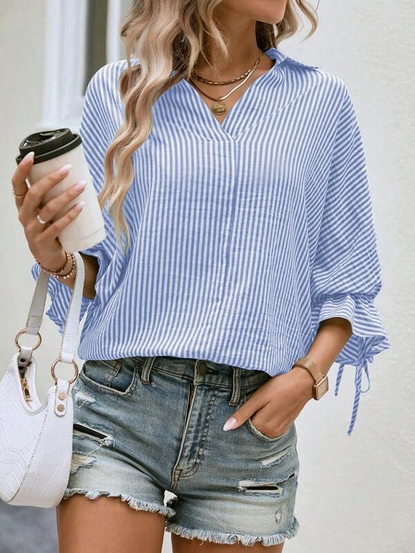 2024 유럽과 미국의 국경 봄과 여름 새로운 줄무늬 뿔 박쥐 소매 7 점 슬리브 백 스플릿 V 넥 캐주얼 셔츠스토어 가기