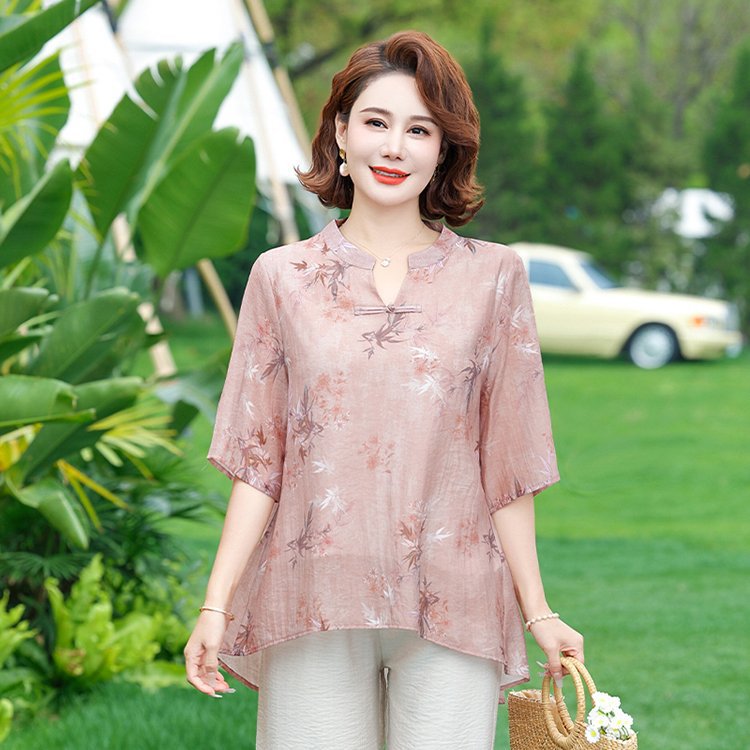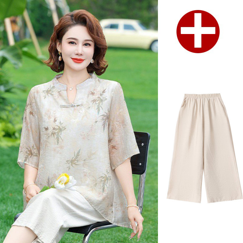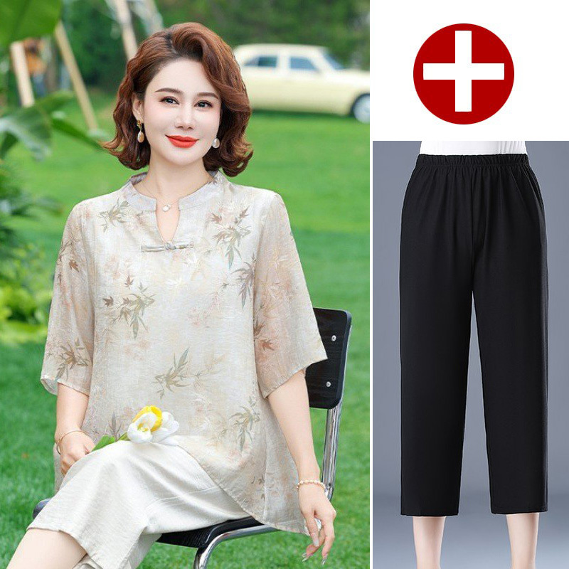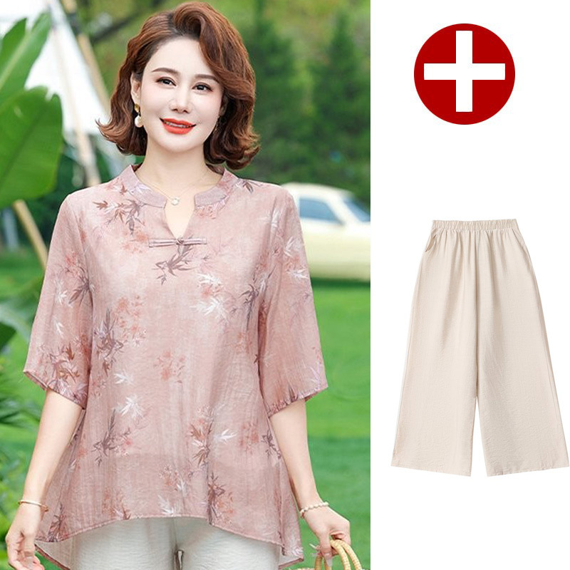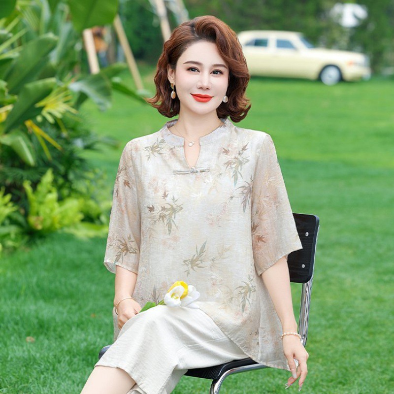 어머니의 여름 원피스 서양식 반팔 최고 중년 여성 느슨한 작은 셔츠 중년 우아한 얇은 배 커버 티셔츠 세트