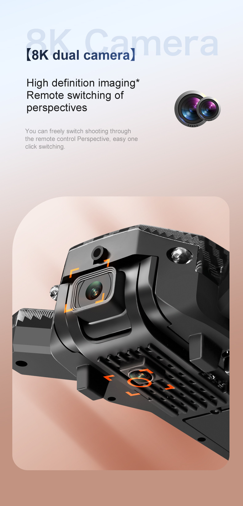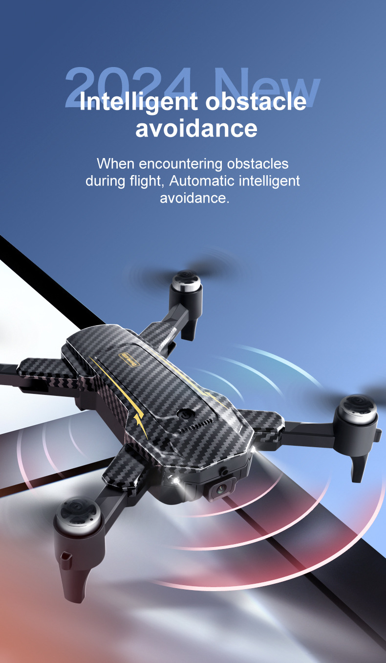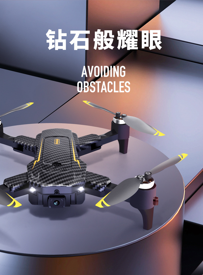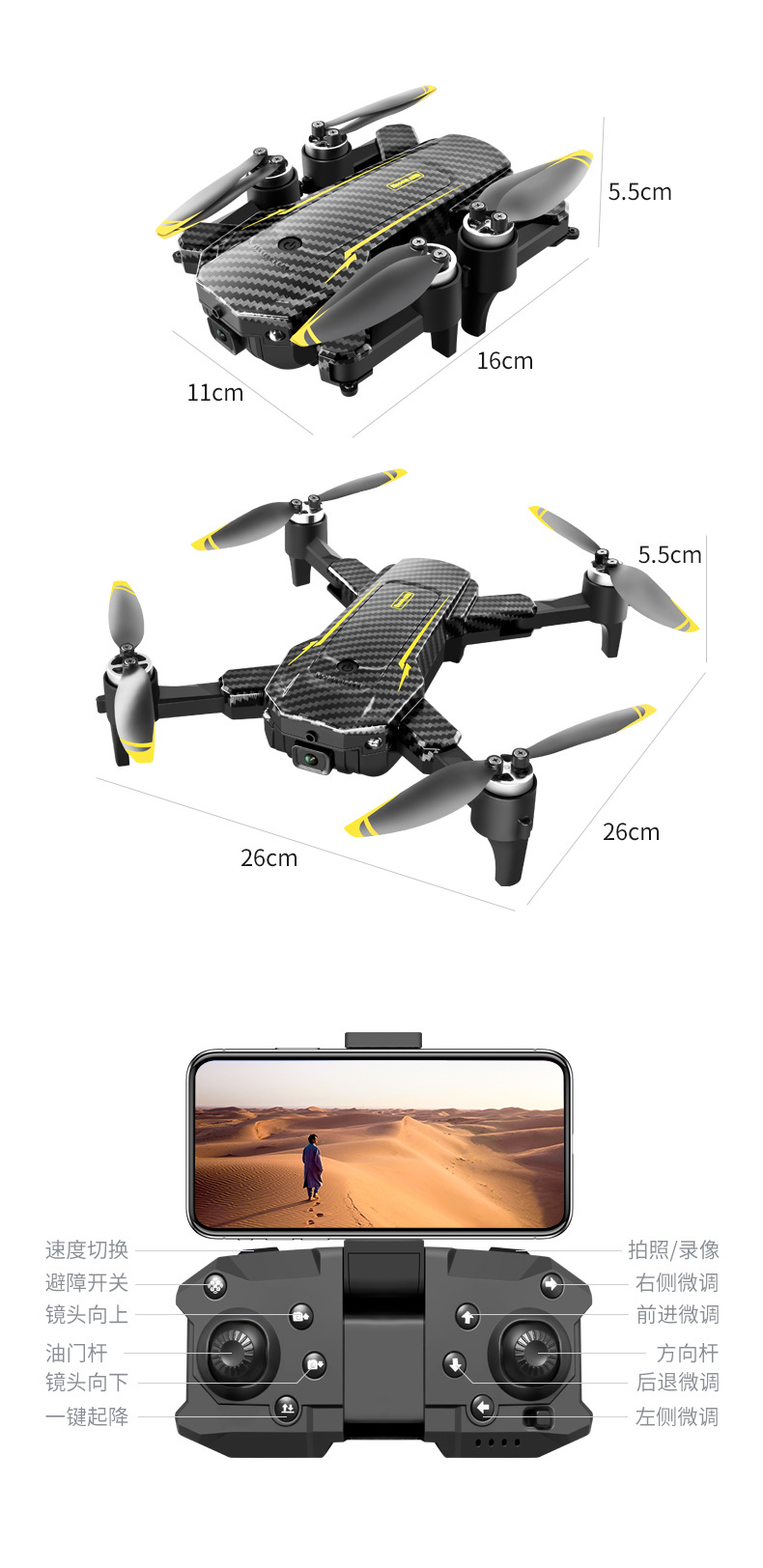 内置避障+光流定位 ,可电动调节镜头,智能跟随飞机可折叠,六通陀螺仪,一键起飞,一键降落,前进后退,左右侧飞,转向,无头模式,360°翻滚