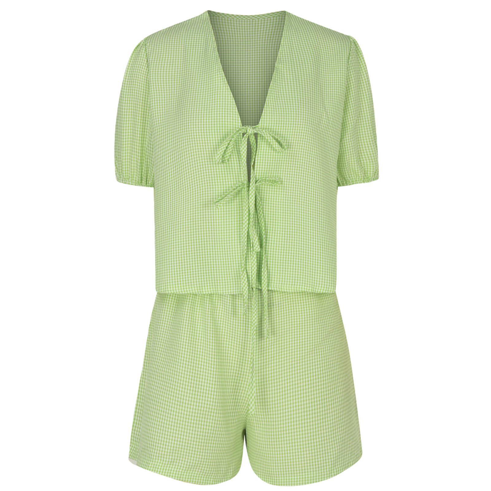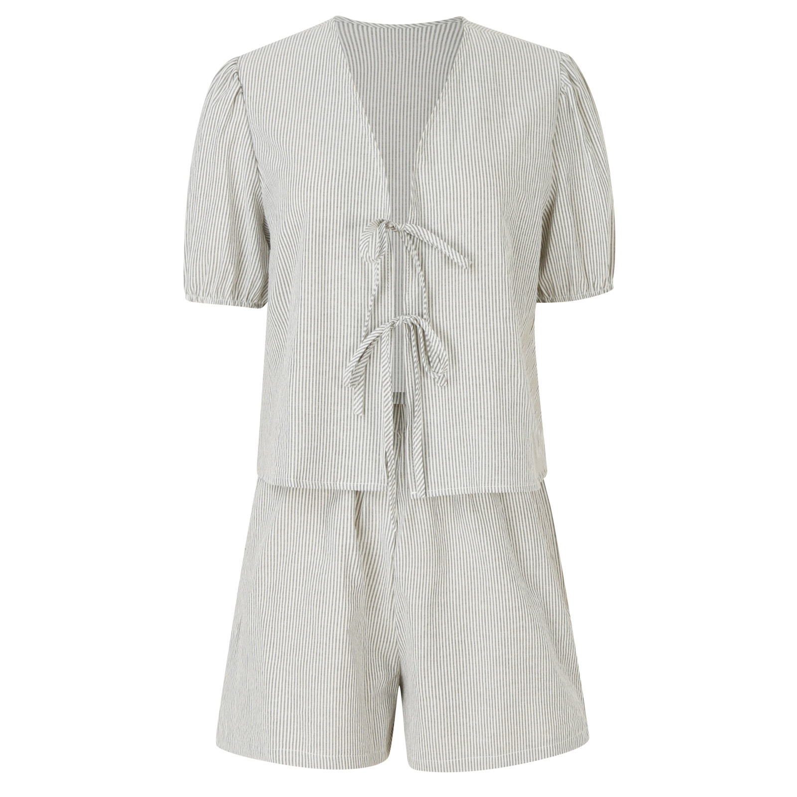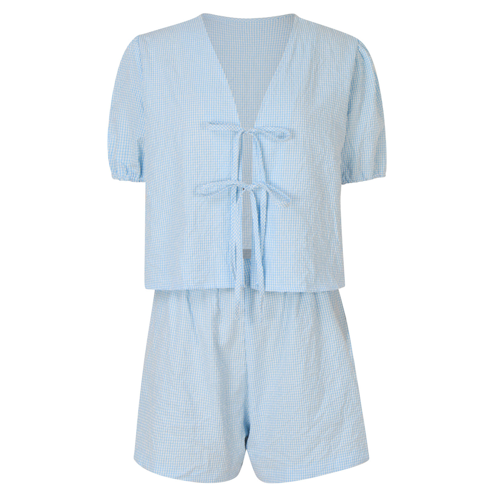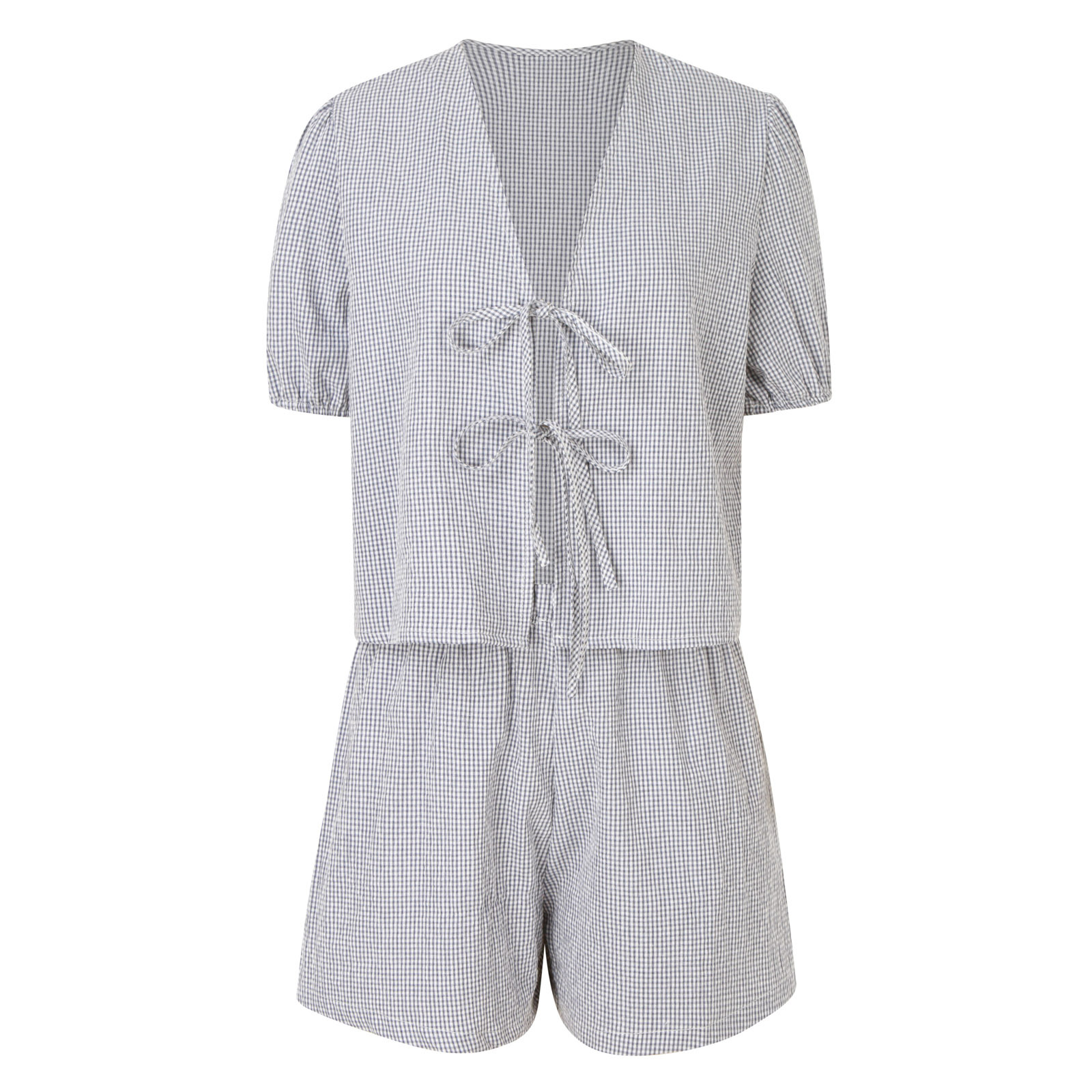 2024 새로운 유럽과 미국의 여성 격자 무늬 스트라이프 고무 커프 캐주얼 패션 테더 탄성 허리 반바지 세트