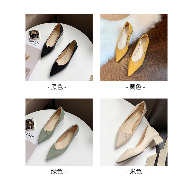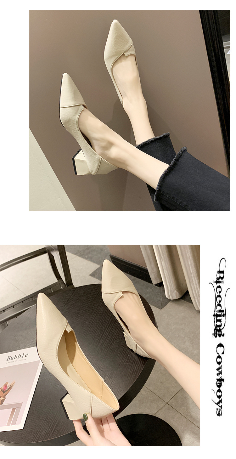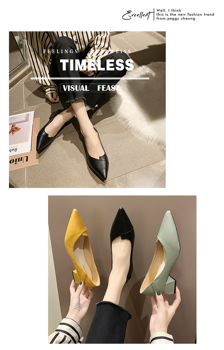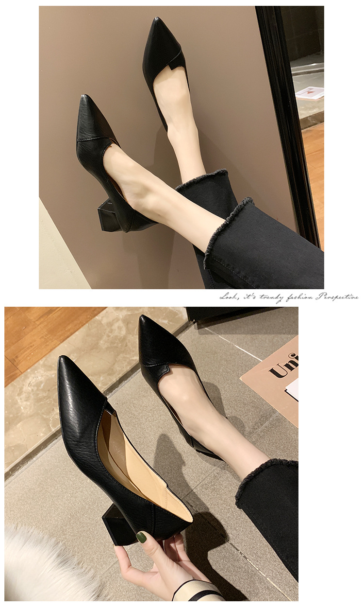 2021 한국 스타일 두꺼운 굽 얕은 입 하이힐 신발 여성의 뾰족한 전문 작업 신발 검은 중엽 가죽 신발스토어 가기