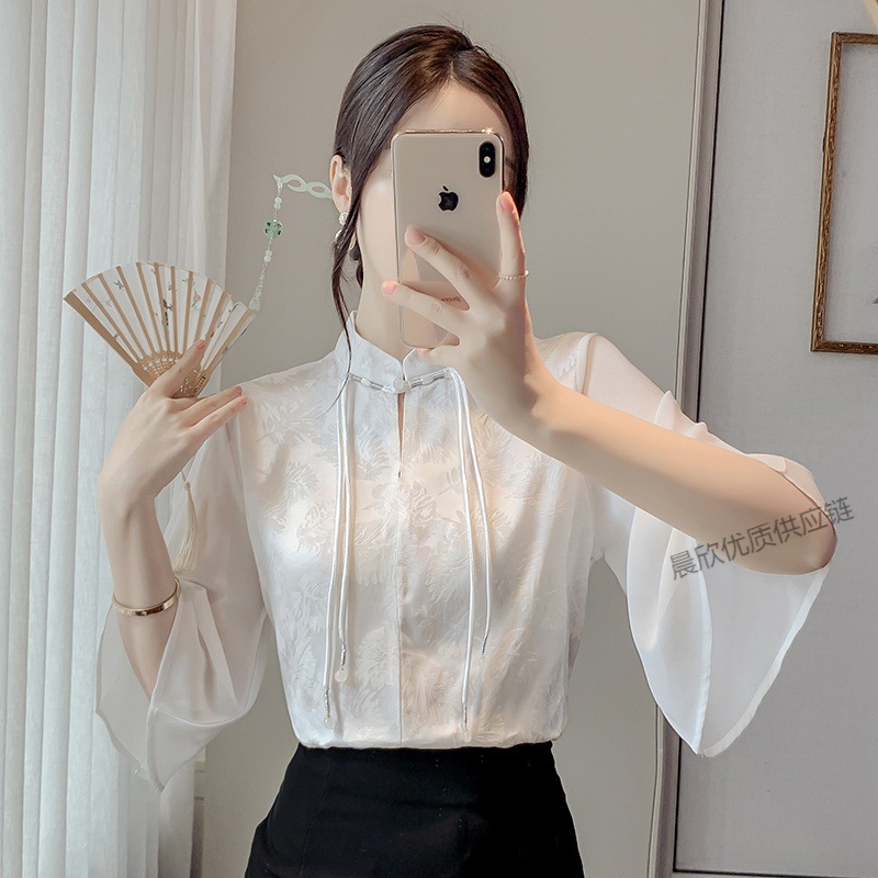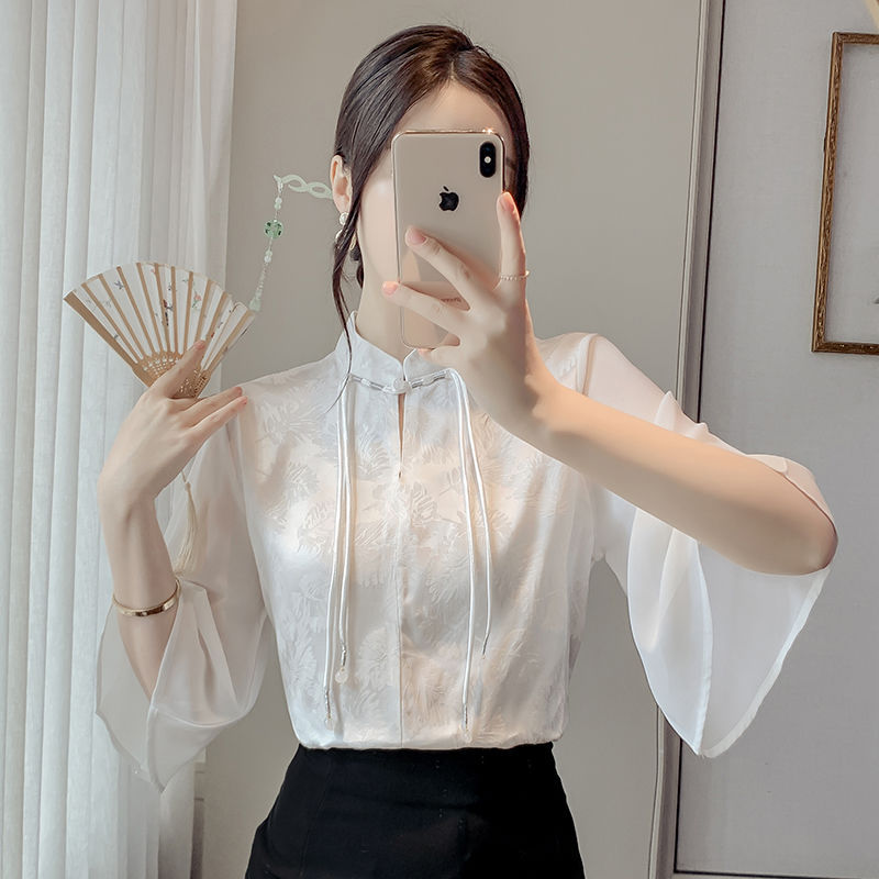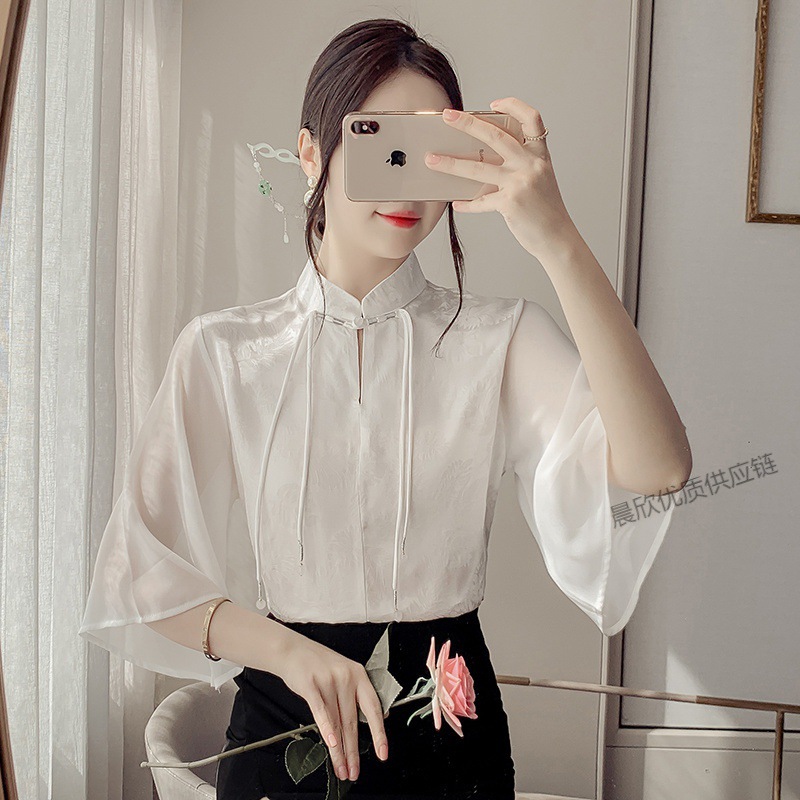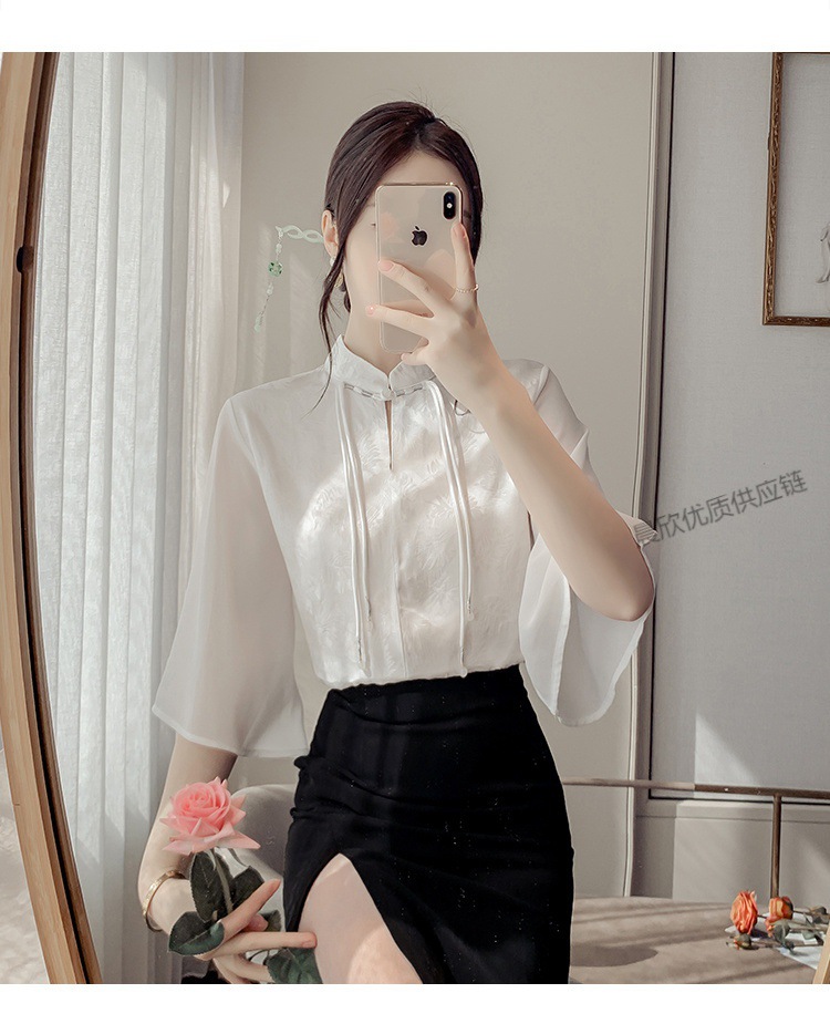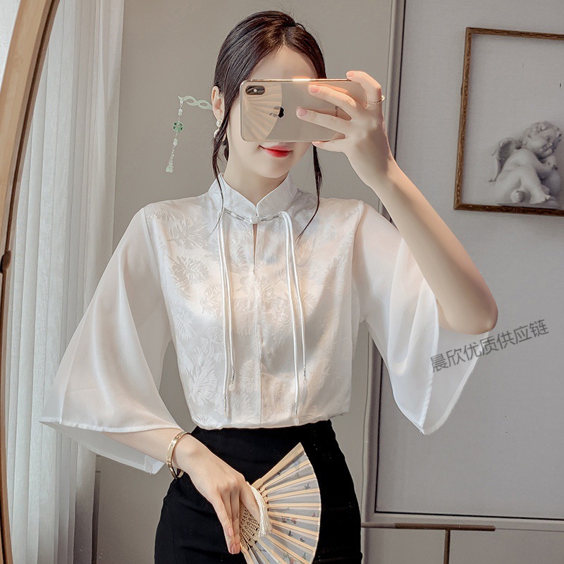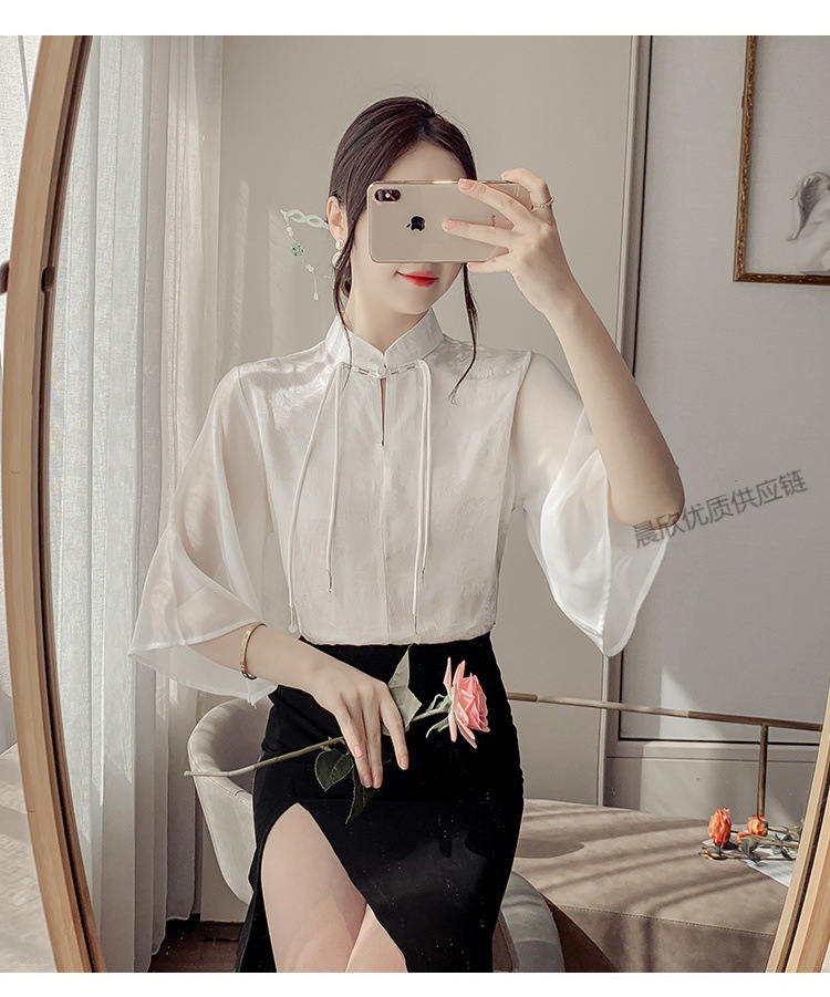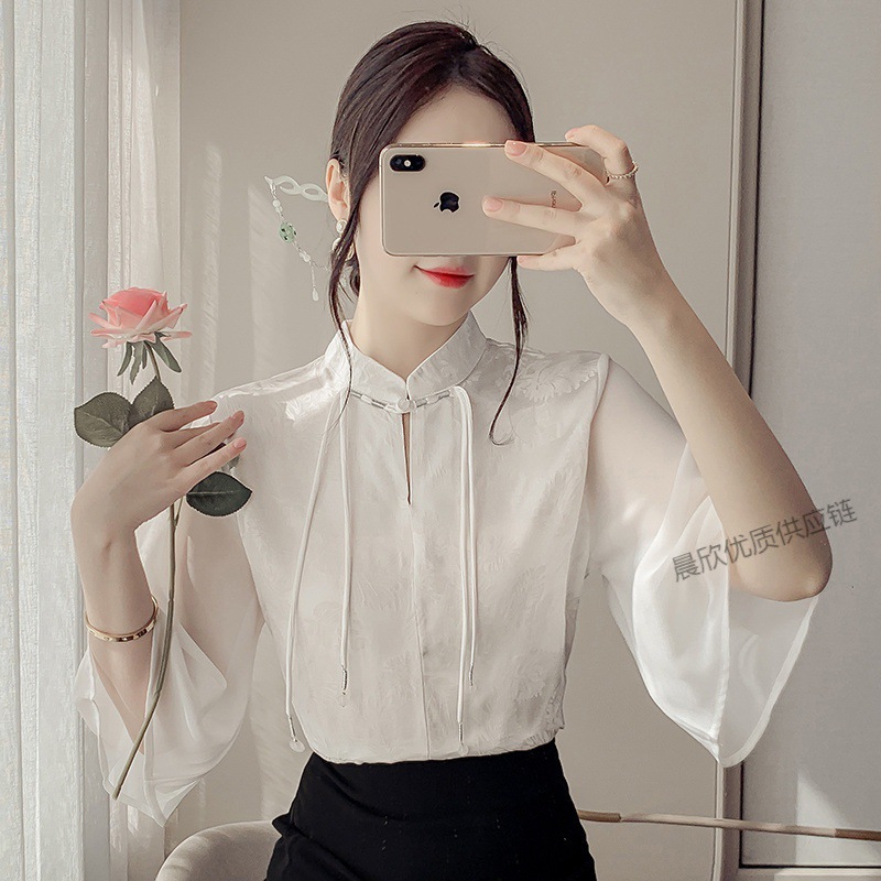 말 얼굴 스커트가있는 반팔 셔츠 새로운 중국 스타일 국가 스타일 화이트 기타 비행 소매 중국 요소 개선 된 한푸 탑