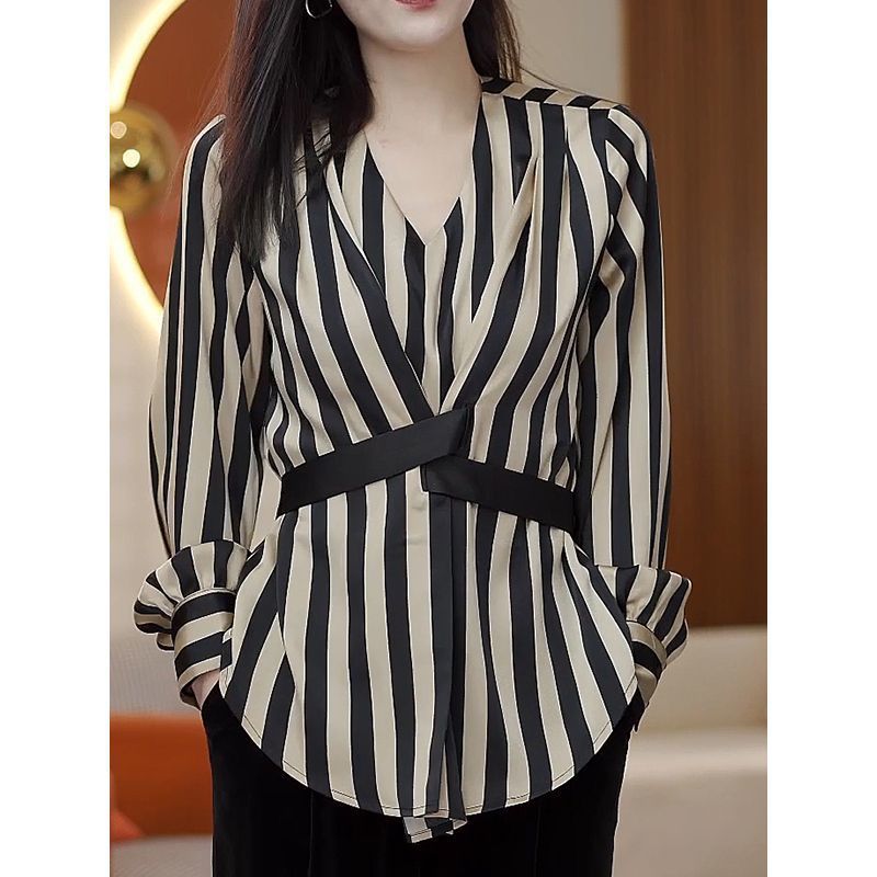 패션 라이트 럭셔리 우아한 여성 스트라이프 컬러 칼라 V 넥 봄 새로운 긴 소매 도시 스타일 슬림 셔츠스토어 가기