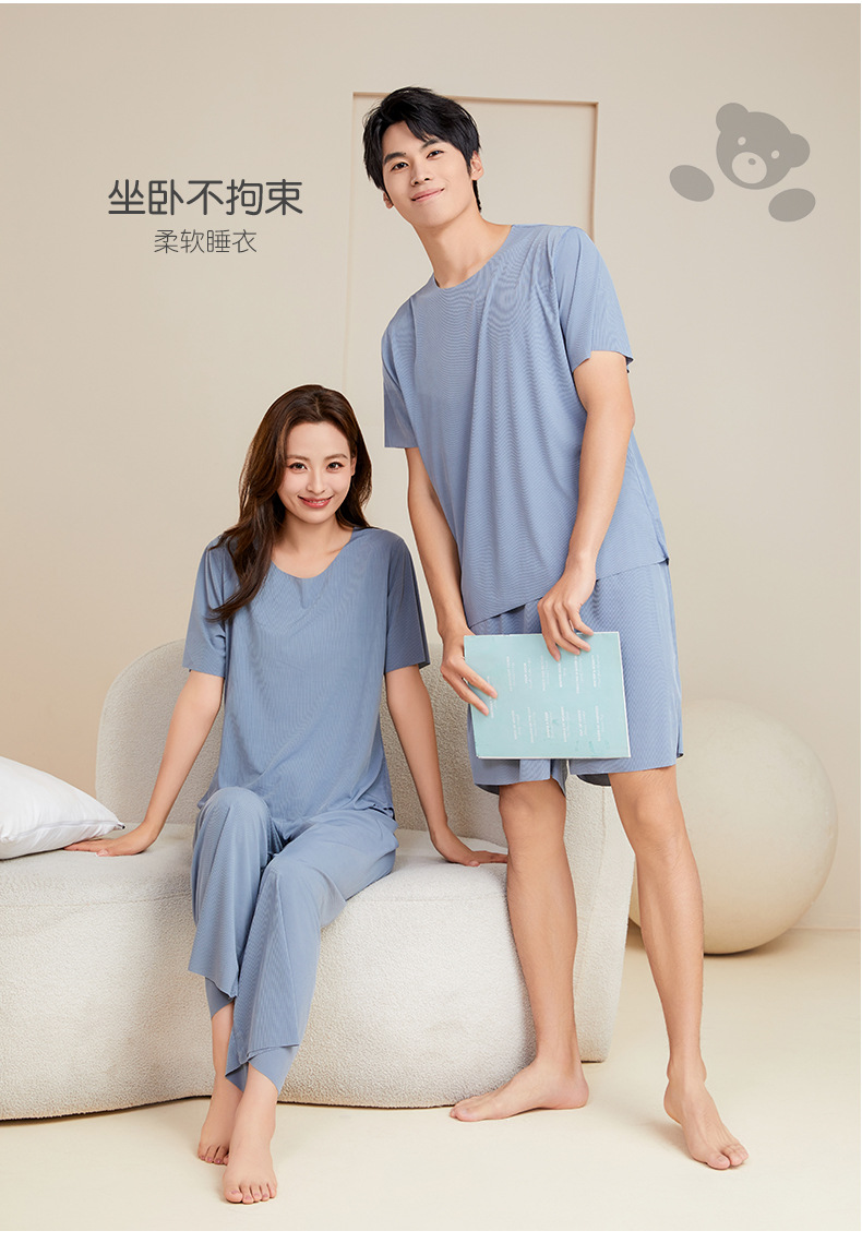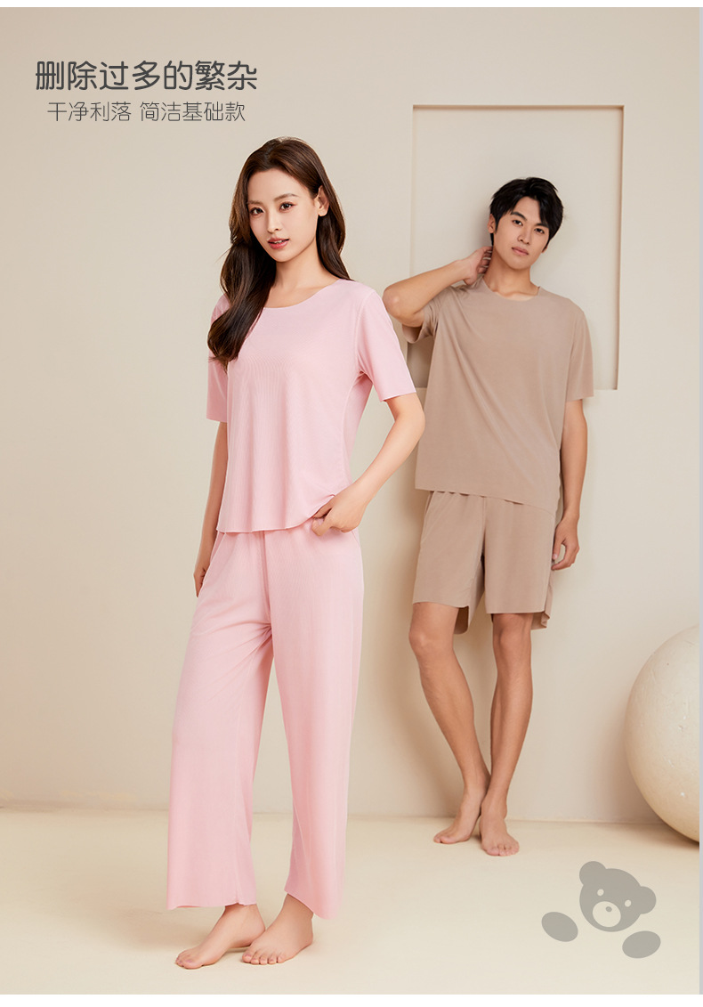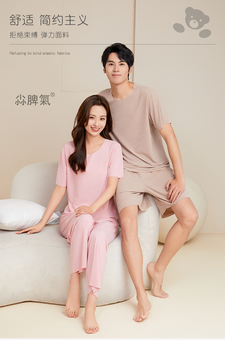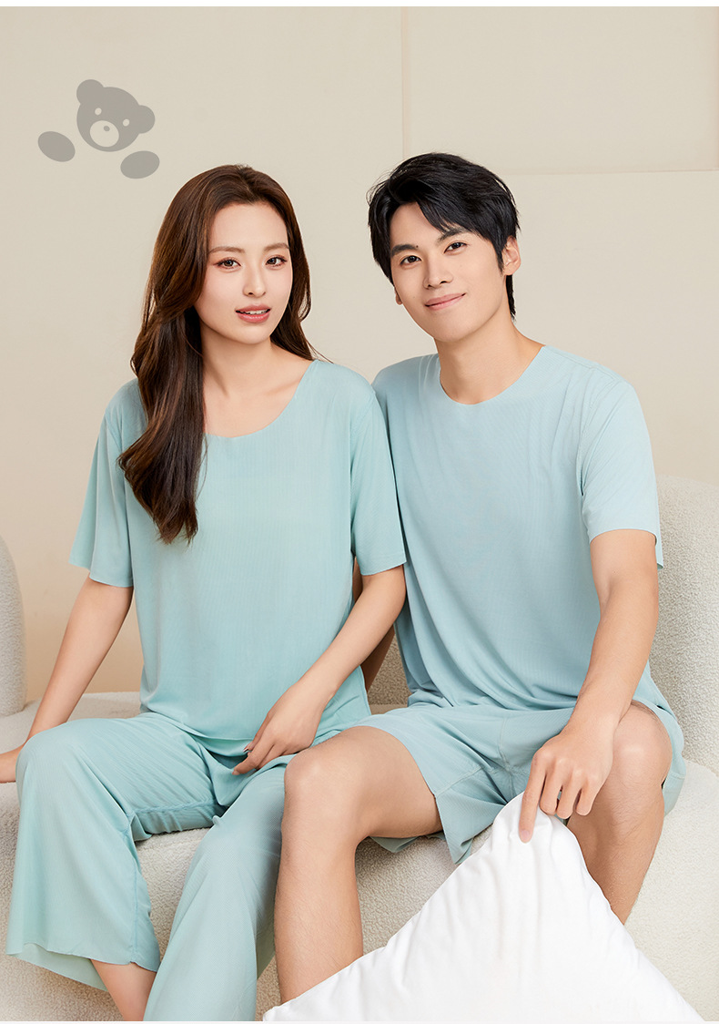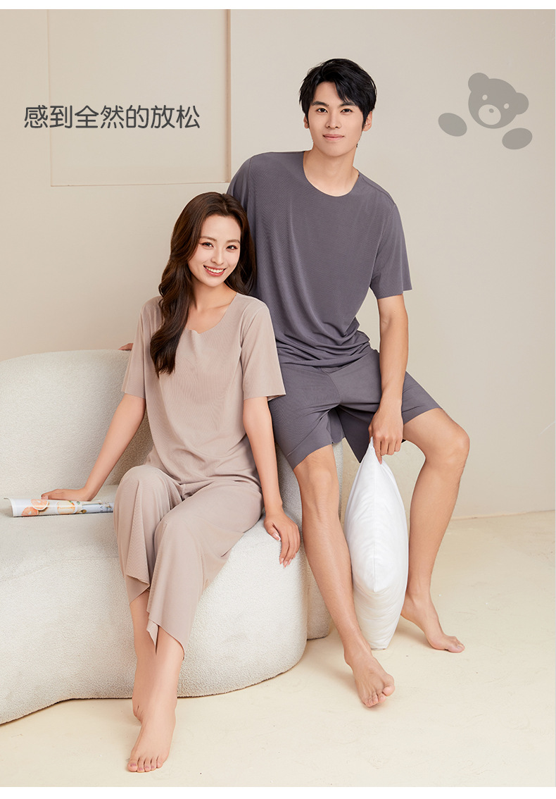 남성용 아이스 실크 잠옷 홈웨어 세트 커플용 얇은 라운드넥 반팔 대형 사이즈 캐주얼 여성용 무봉제 단색 도매스토어 가기