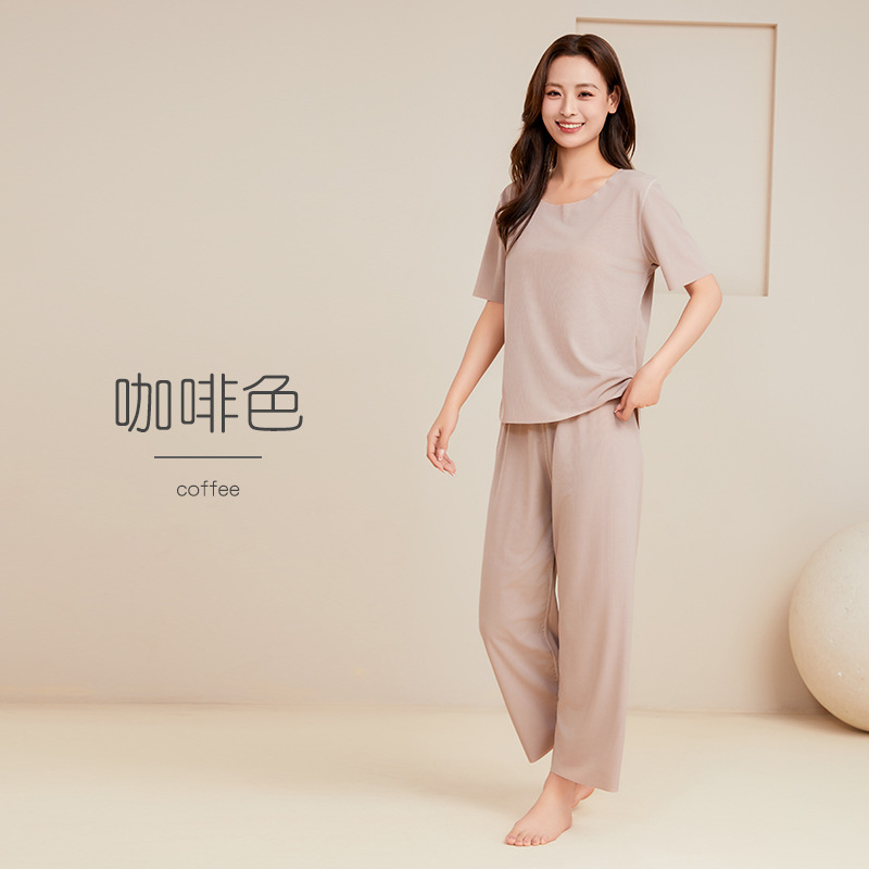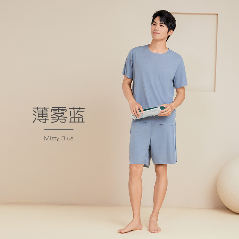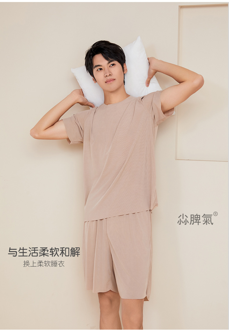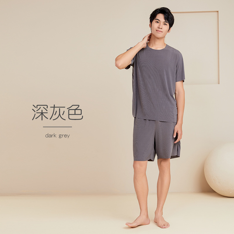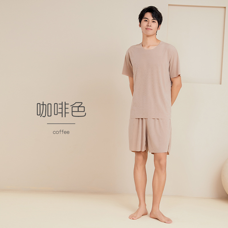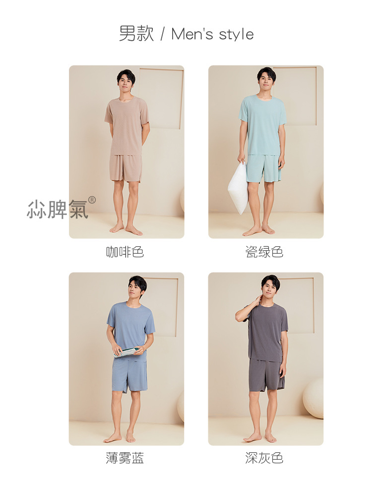 남성용 아이스 실크 잠옷 홈웨어 세트 커플용 얇은 라운드넥 반팔 대형 사이즈 캐주얼 여성용 무봉제 단색 도매스토어 가기