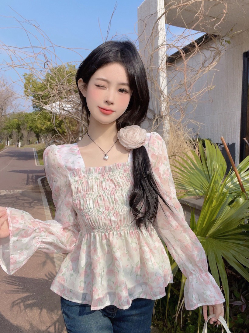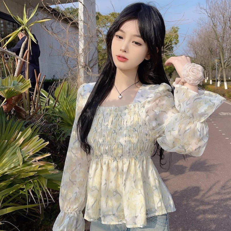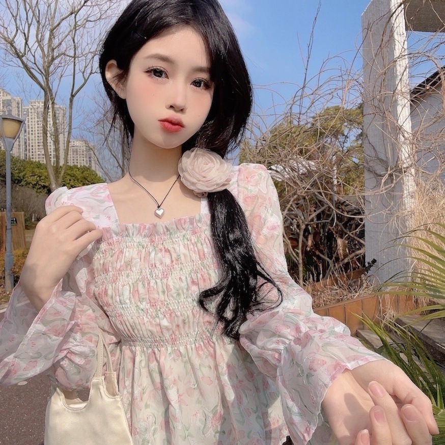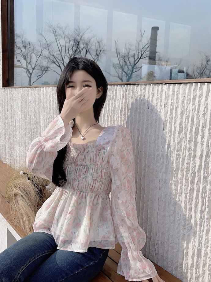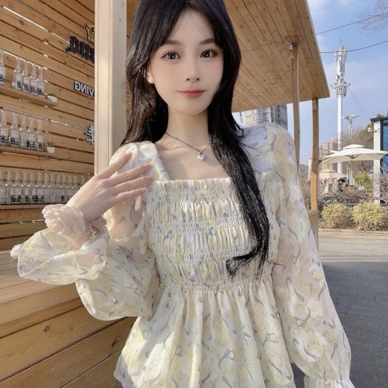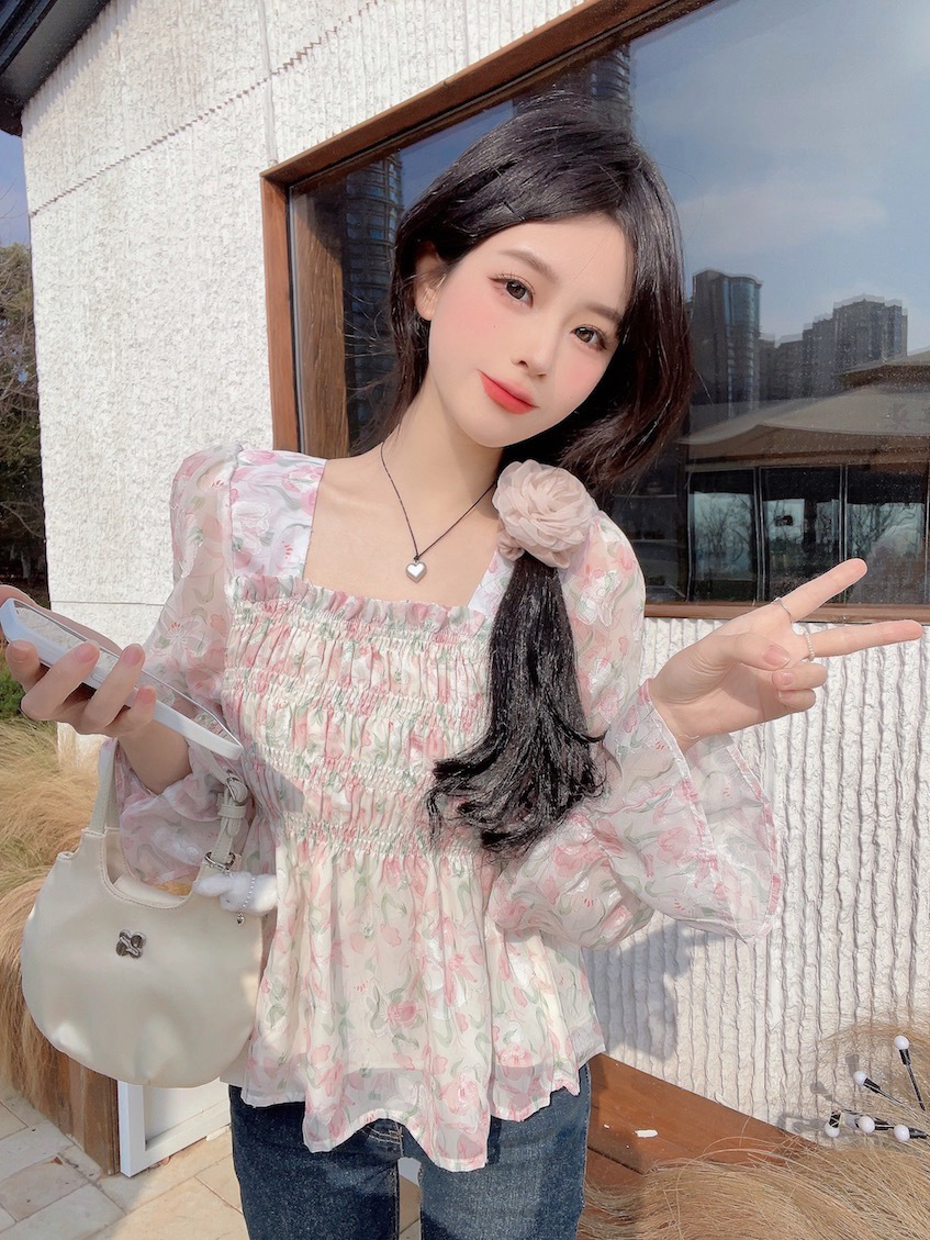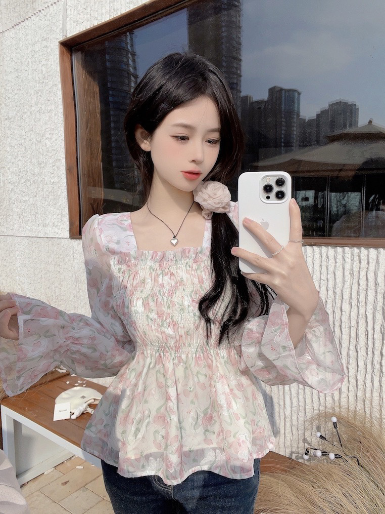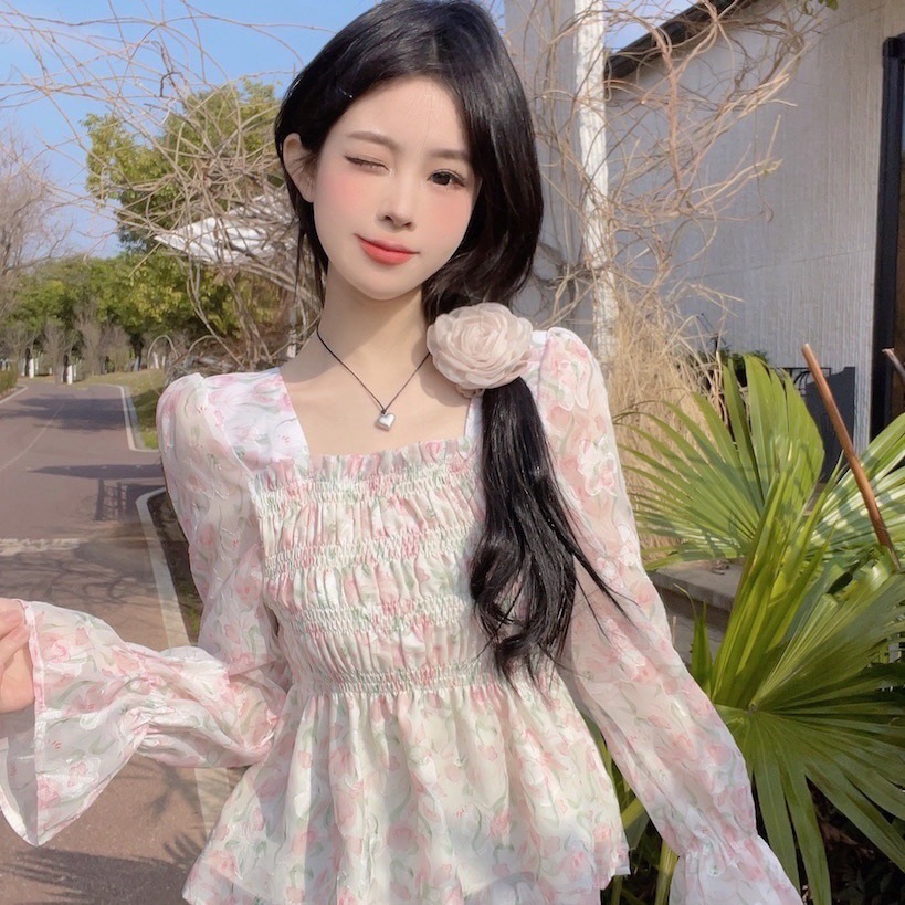 프렌치 스퀘어 칼라 칼라 본 웨스턴 스타일 예쁜 셔츠 여성의 봄과 여름 디자인 센스 플로랄 쉬폰 셔츠 웨이스트 쇼트 탑스토어 가기