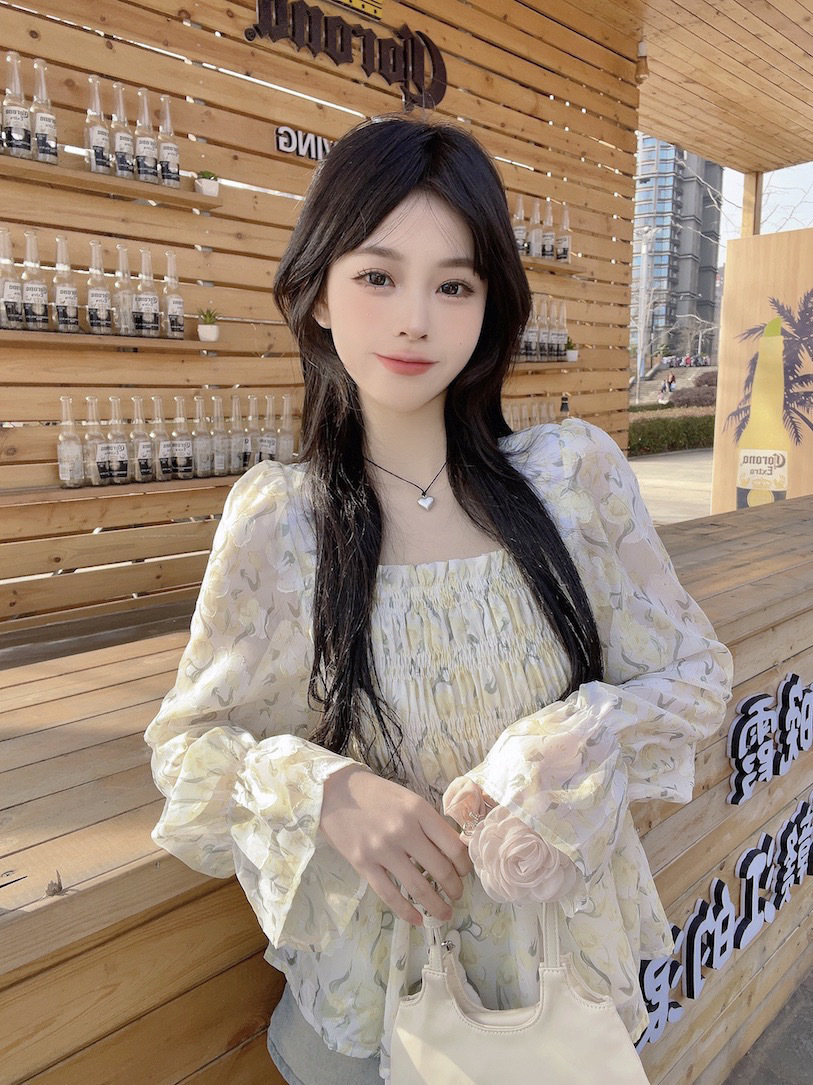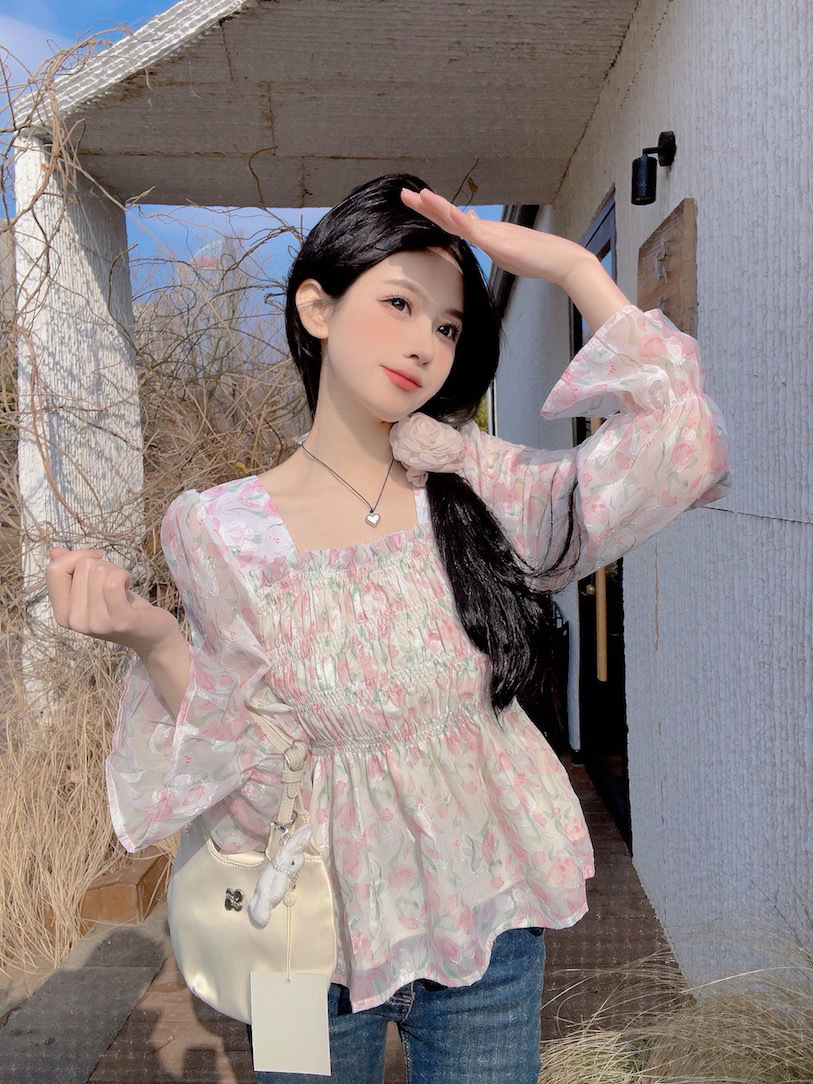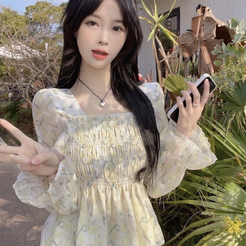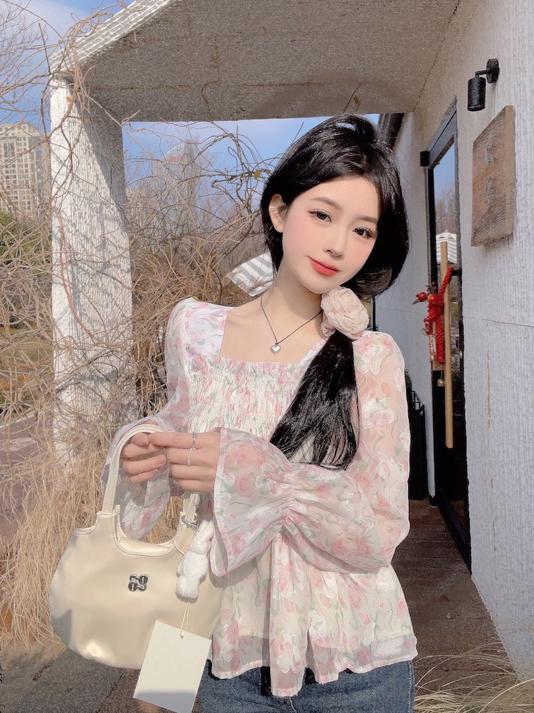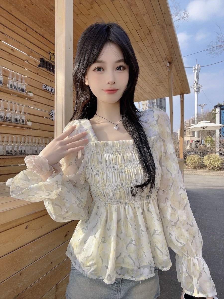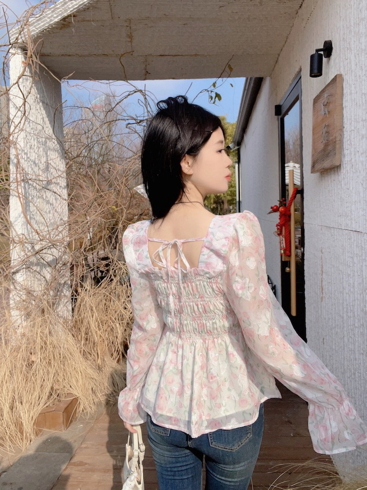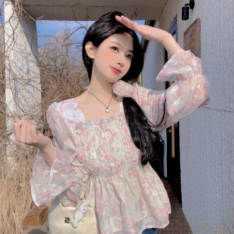 프렌치 스퀘어 칼라 칼라 본 웨스턴 스타일 예쁜 셔츠 여성의 봄과 여름 디자인 센스 플로랄 쉬폰 셔츠 웨이스트 쇼트 탑스토어 가기