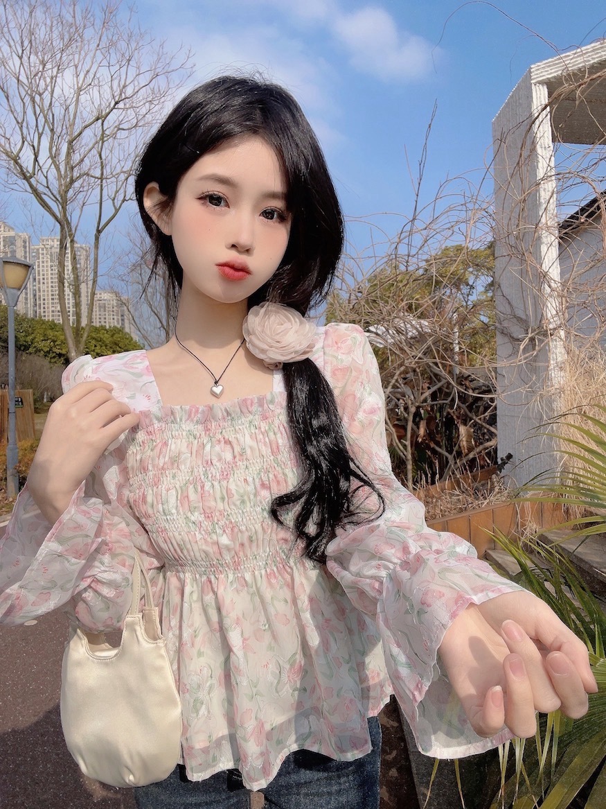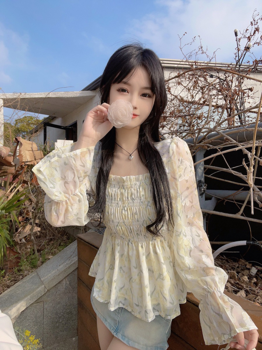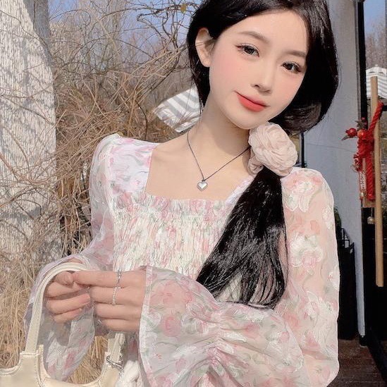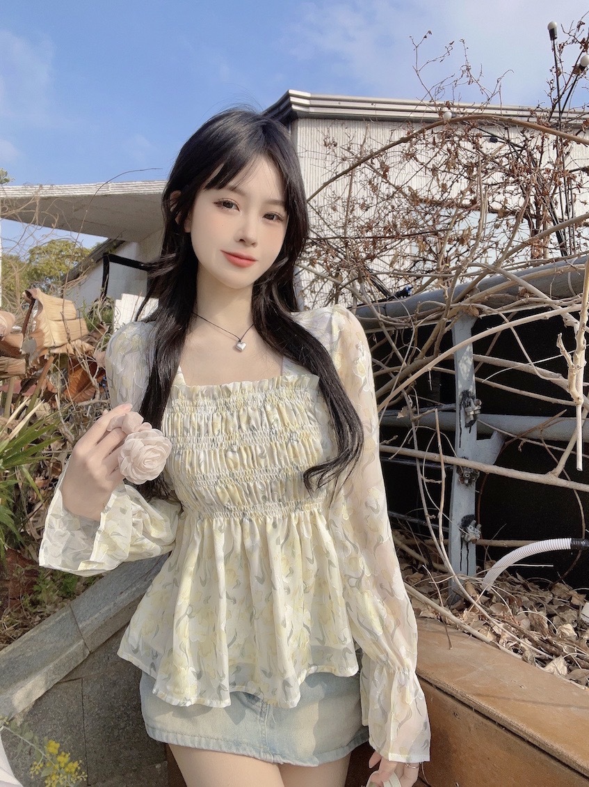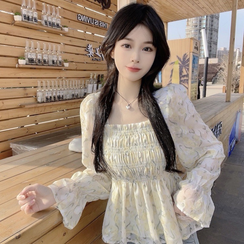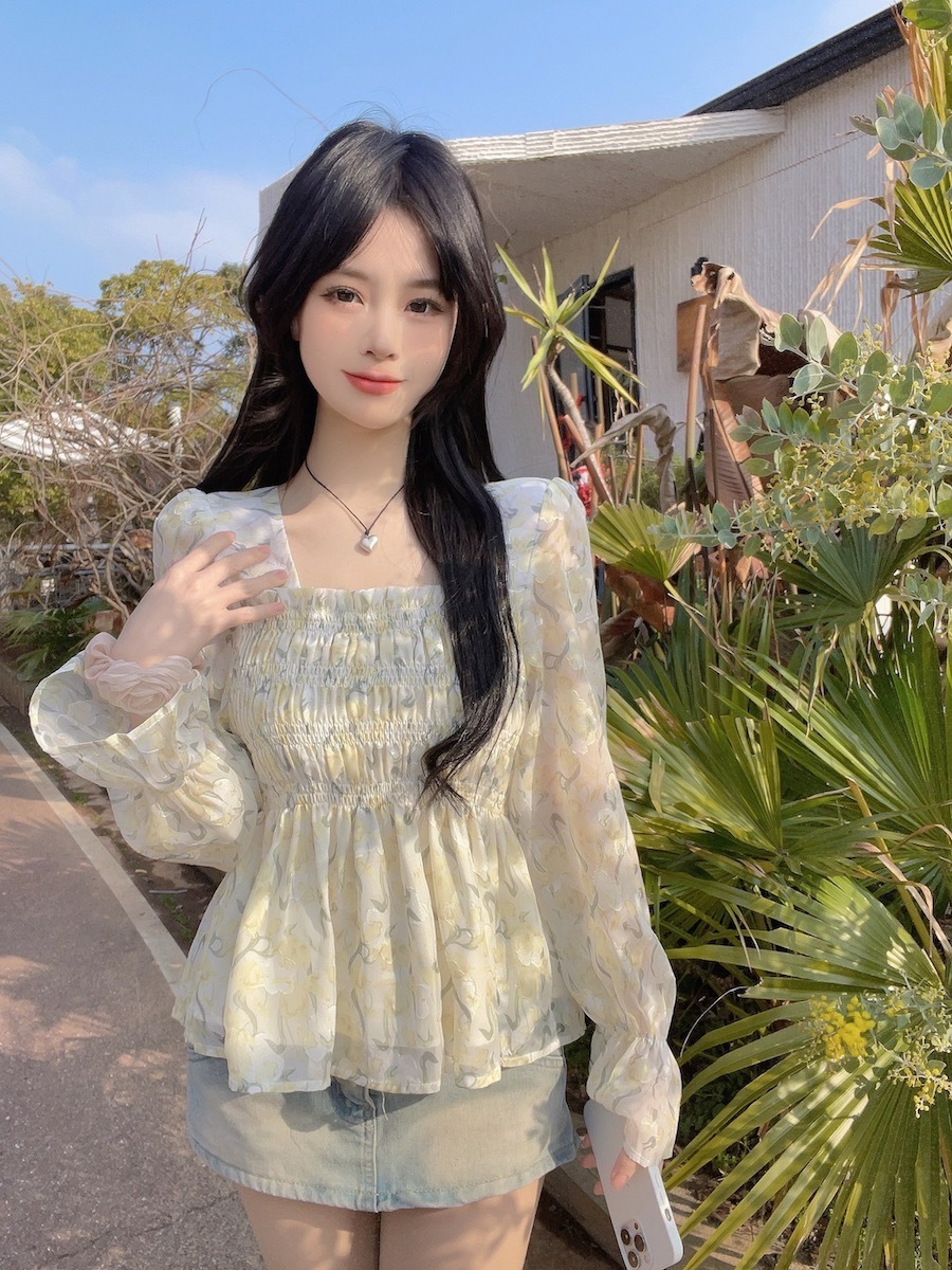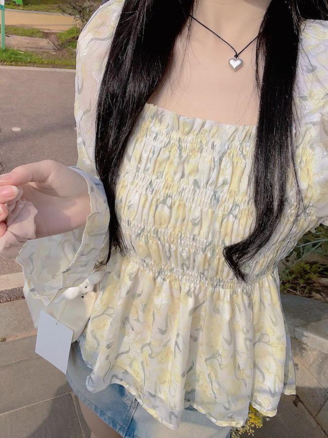 프렌치 스퀘어 칼라 칼라 본 웨스턴 스타일 예쁜 셔츠 여성의 봄과 여름 디자인 센스 플로랄 쉬폰 셔츠 웨이스트 쇼트 탑스토어 가기
