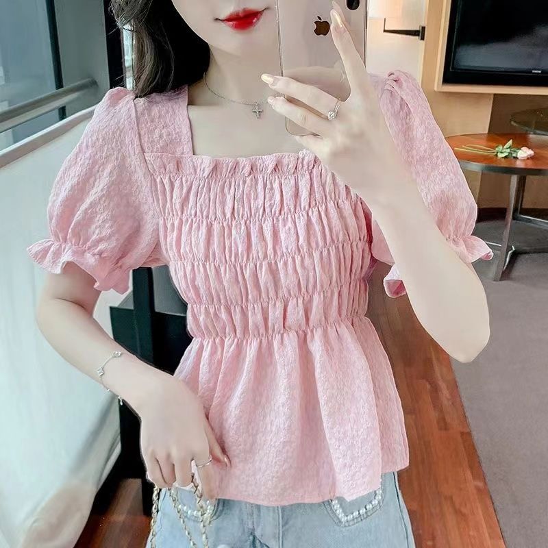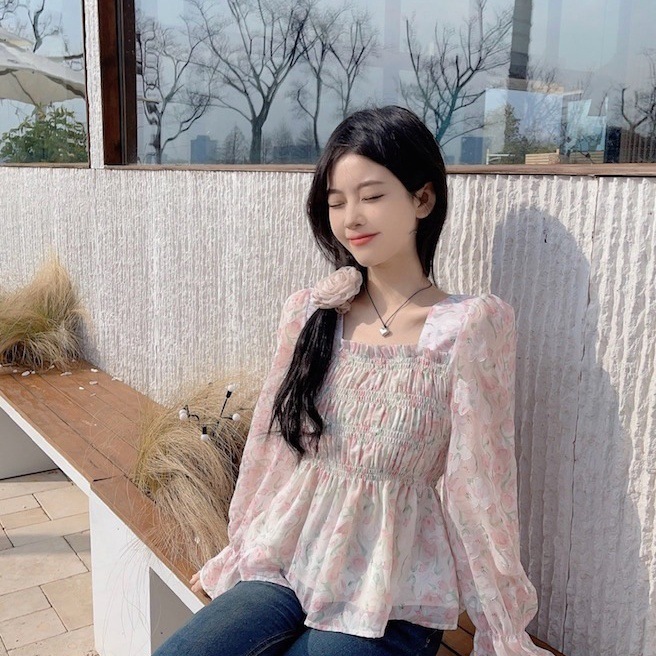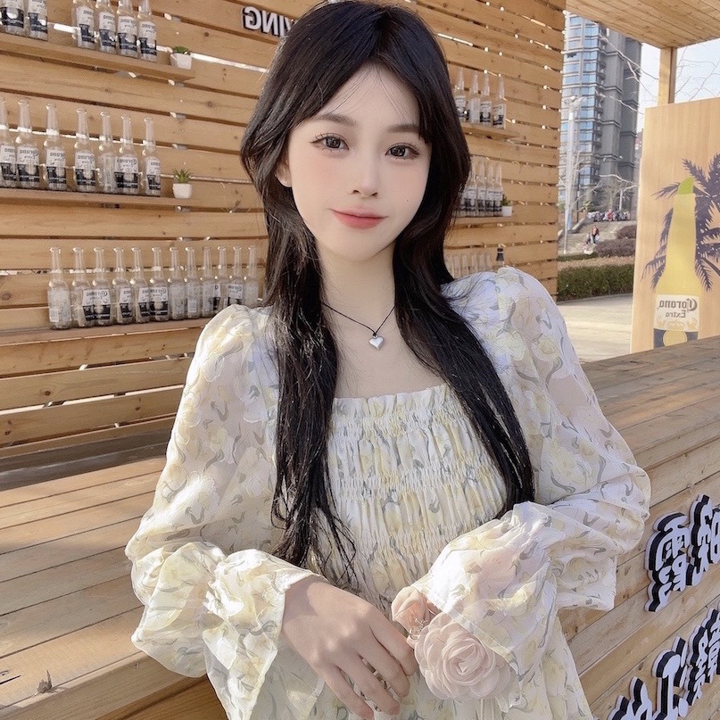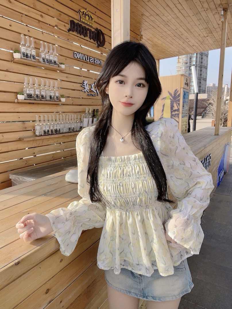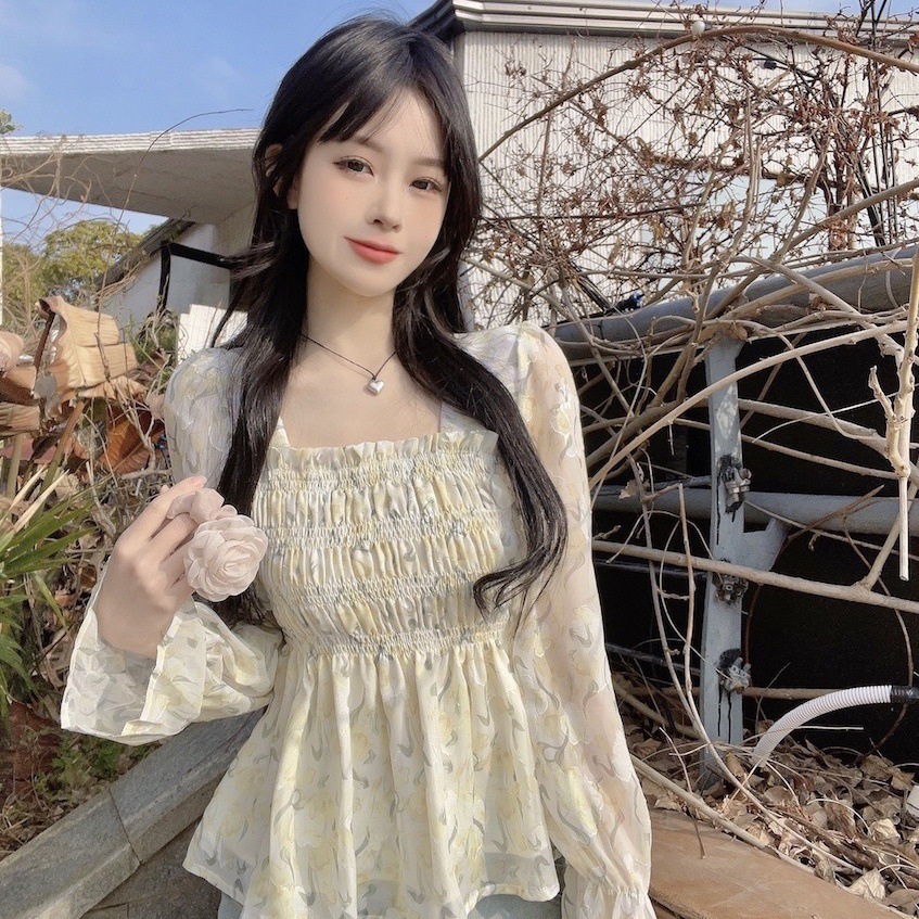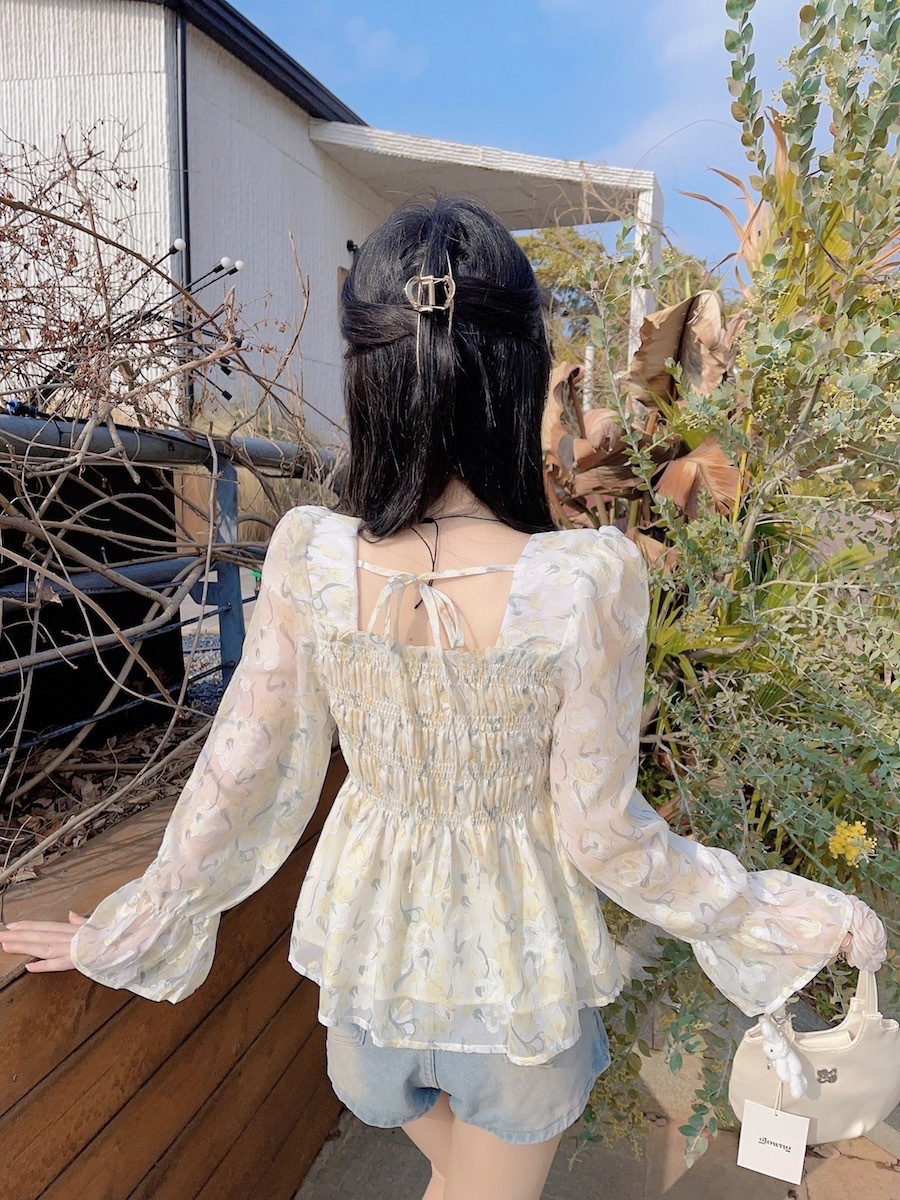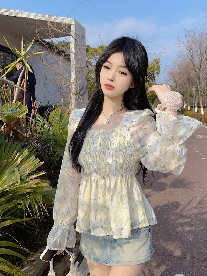 프렌치 스퀘어 칼라 칼라 본 웨스턴 스타일 예쁜 셔츠 여성의 봄과 여름 디자인 센스 플로랄 쉬폰 셔츠 웨이스트 쇼트 탑스토어 가기