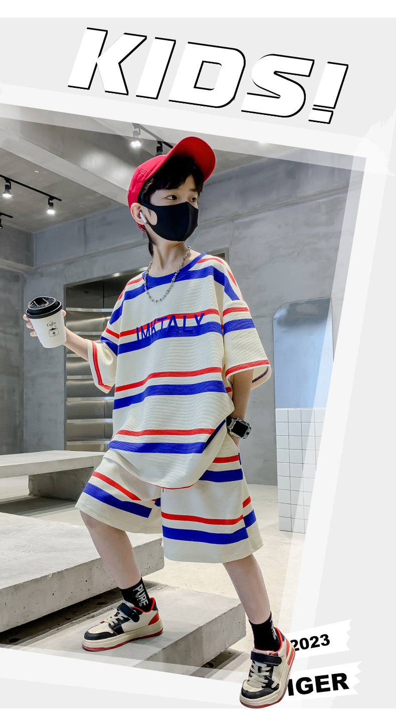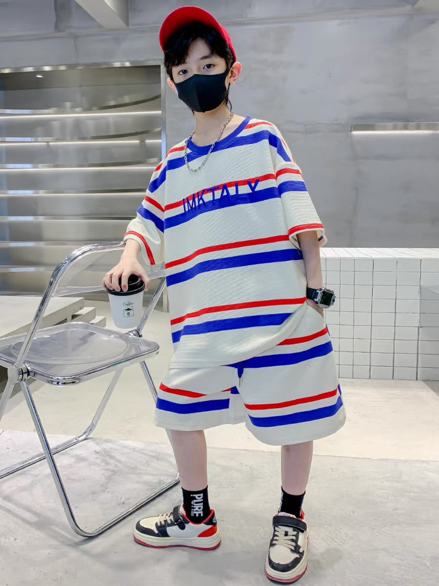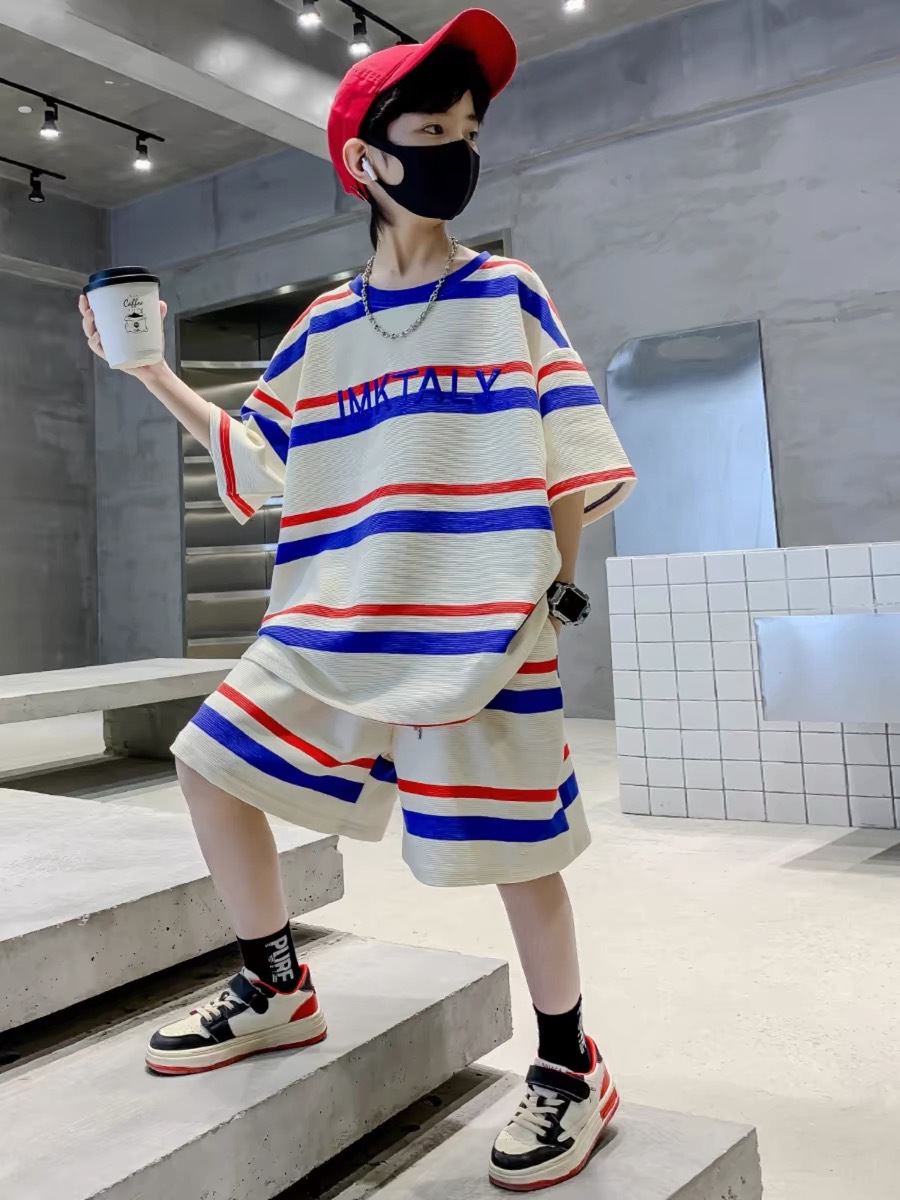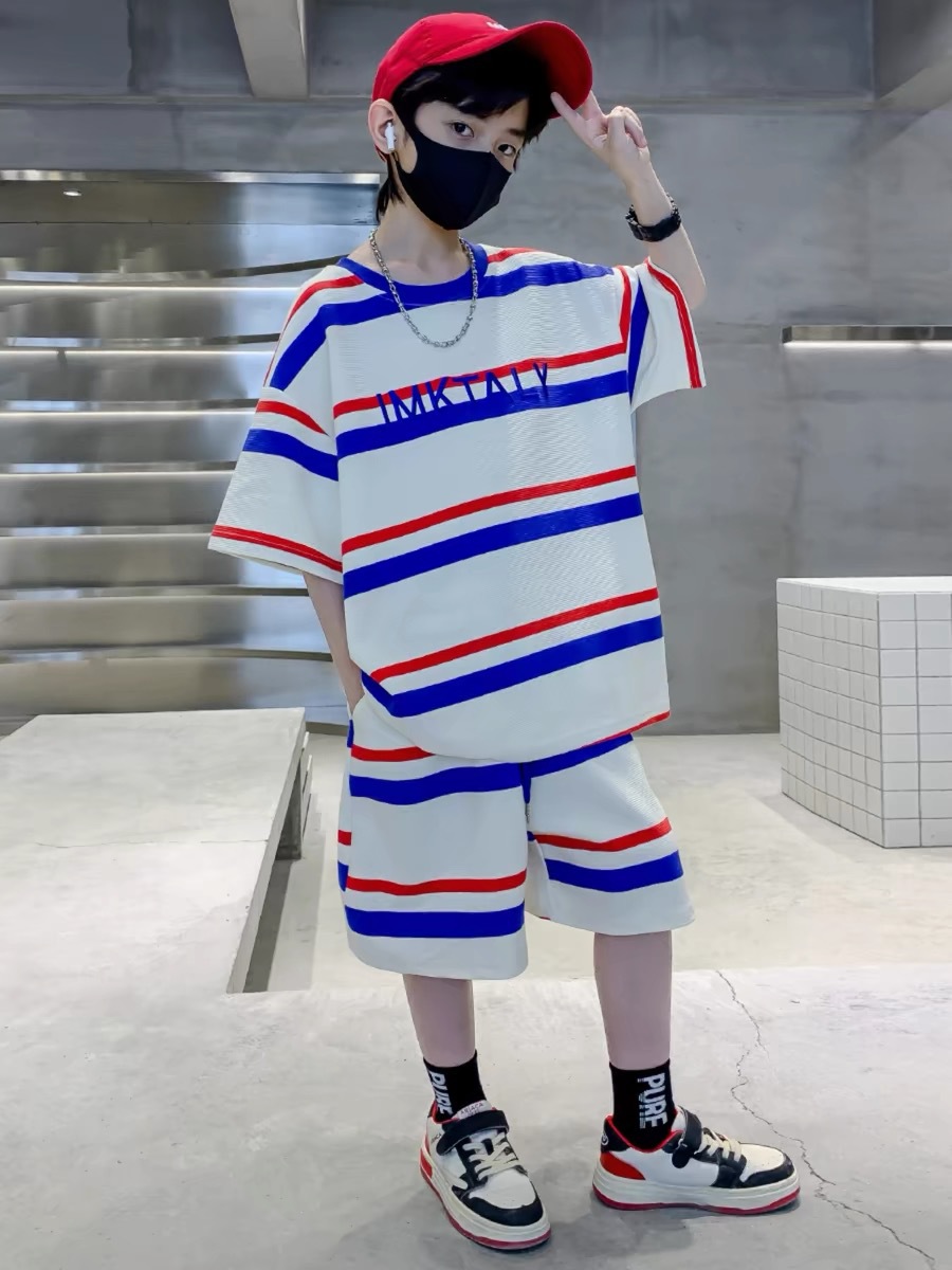 • 빨간색과 파란색 스트립이있는 반팔 세트