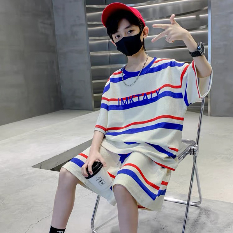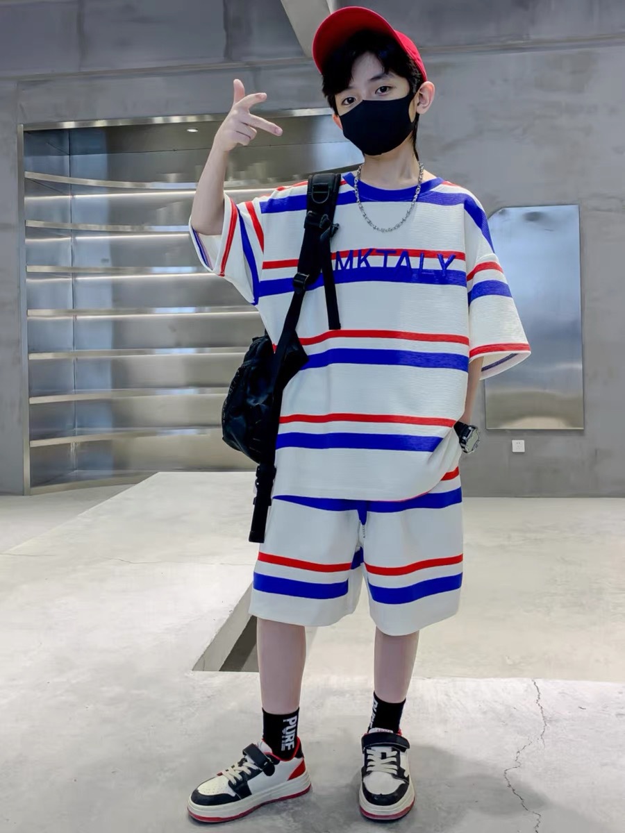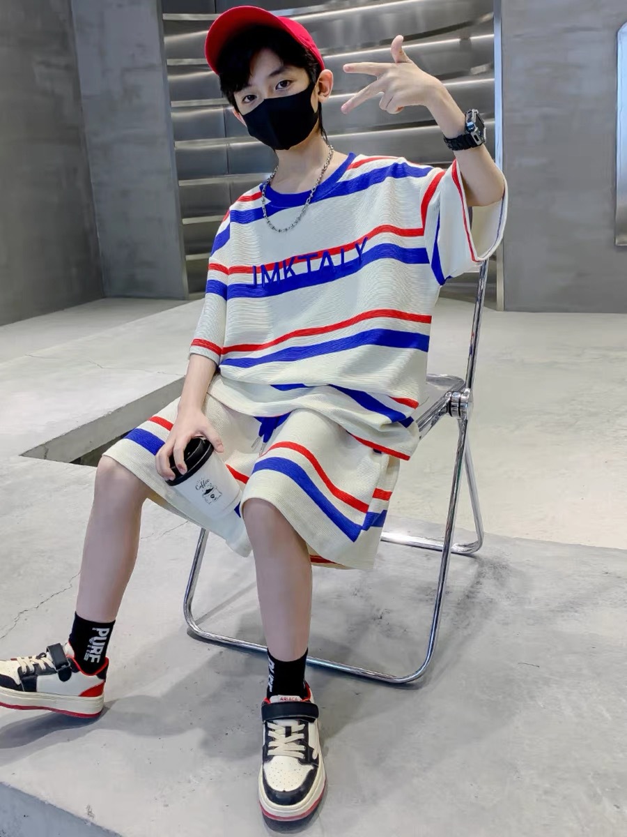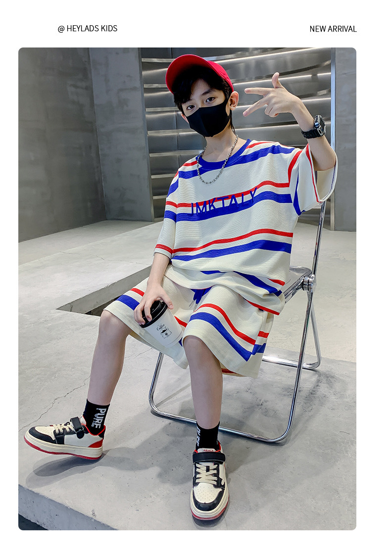 • 빨간색과 파란색 스트립이있는 반팔 세트