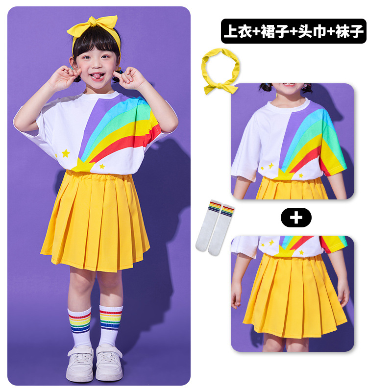 • 세트 [568D 무지개 짧은 소매 591D 무지개 줄무늬 스커트] 밝은 노란색 스카프 무지개 양말