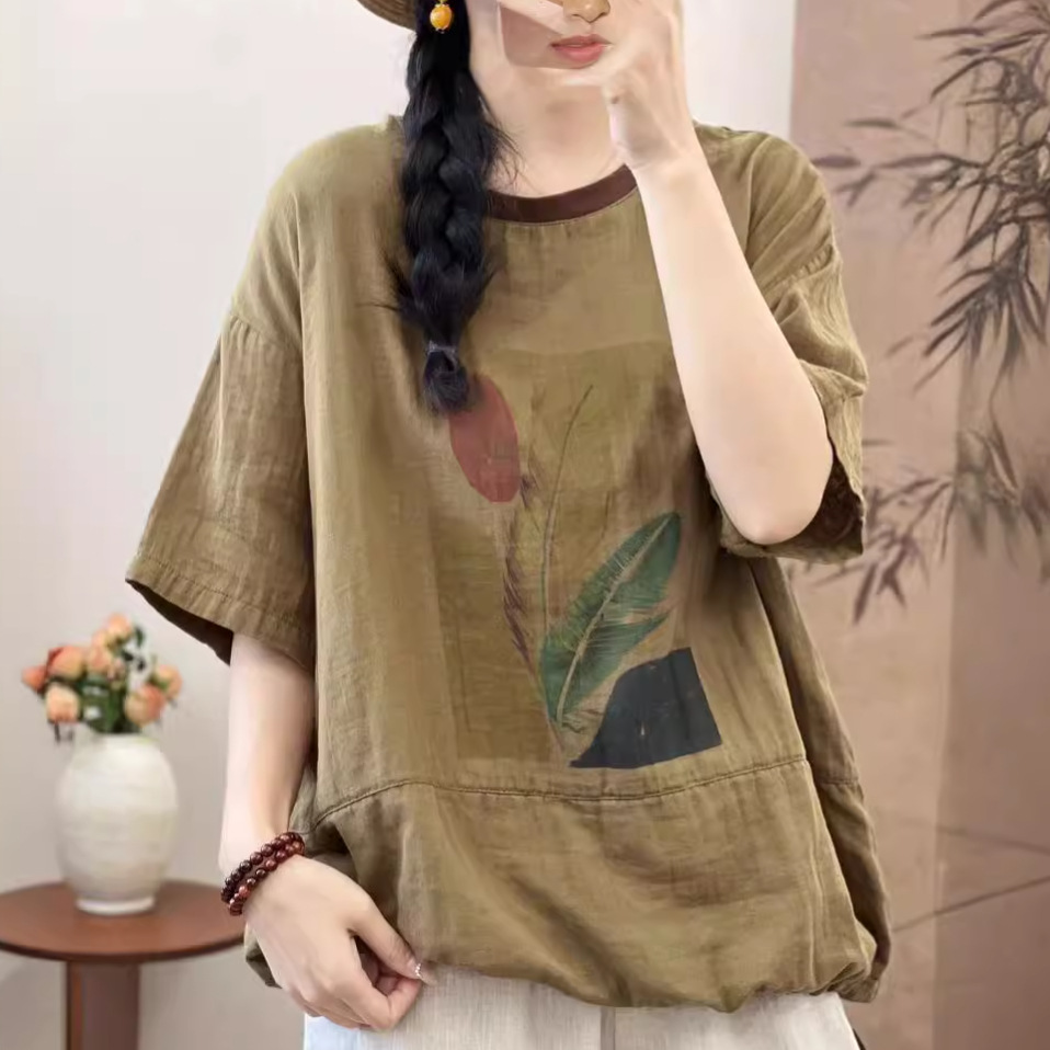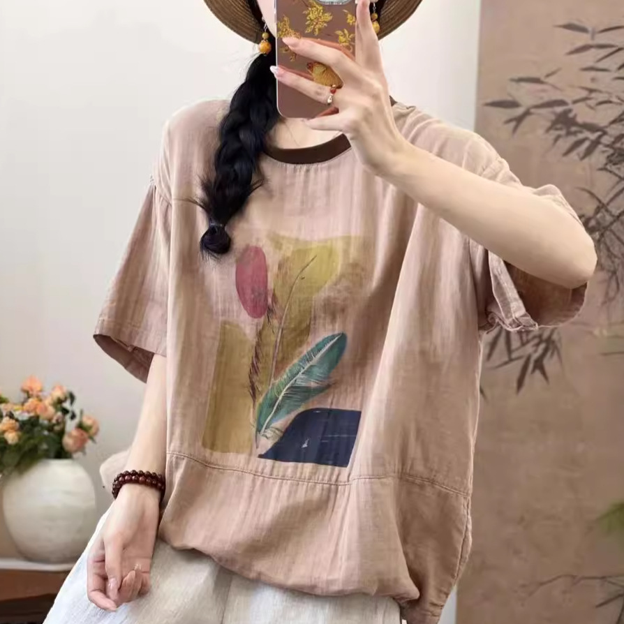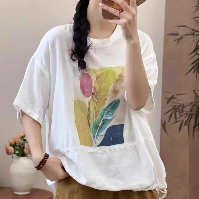 24 여름 새로운 아티스트 스타일 느슨한 대형 더블 레이어 면 인쇄 짧은 소매 티셔츠 여성용