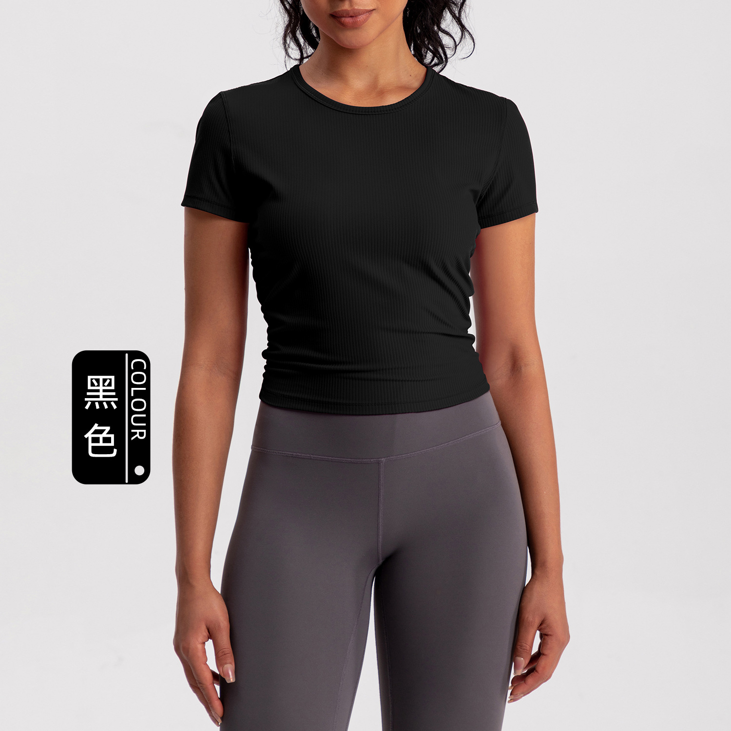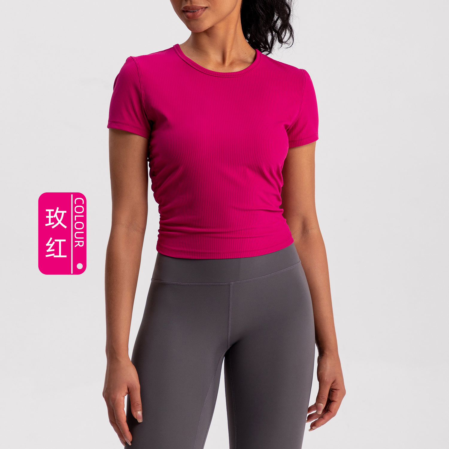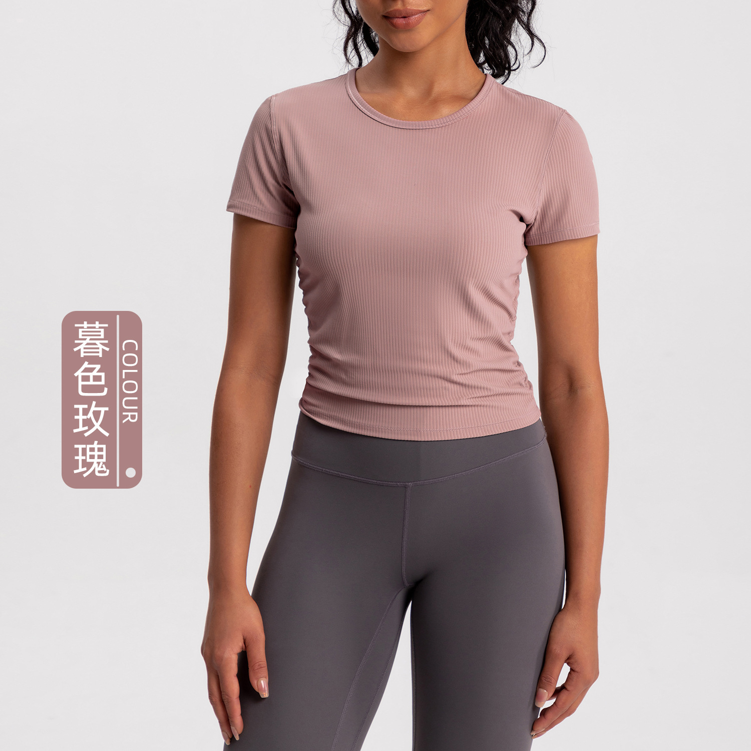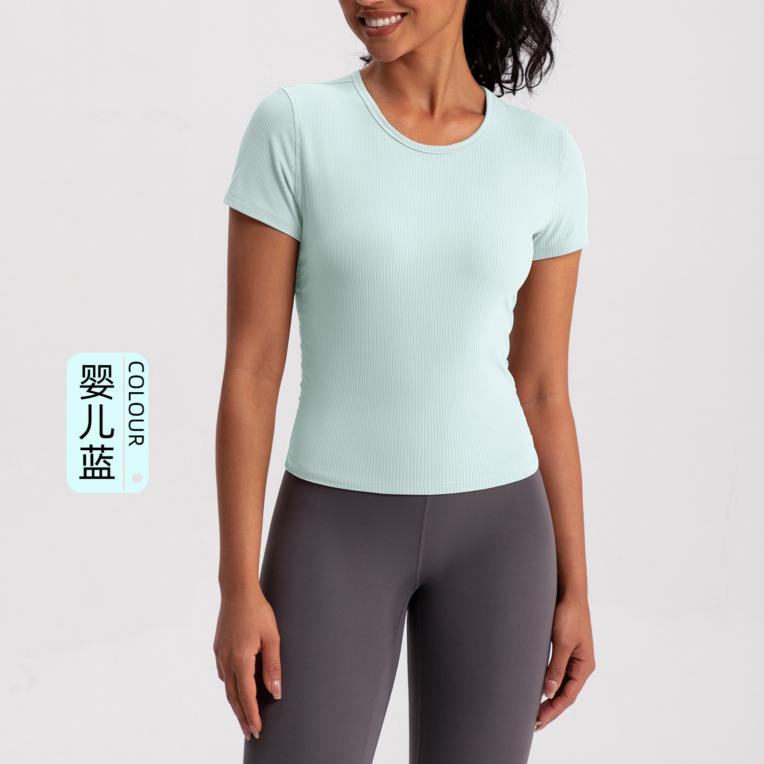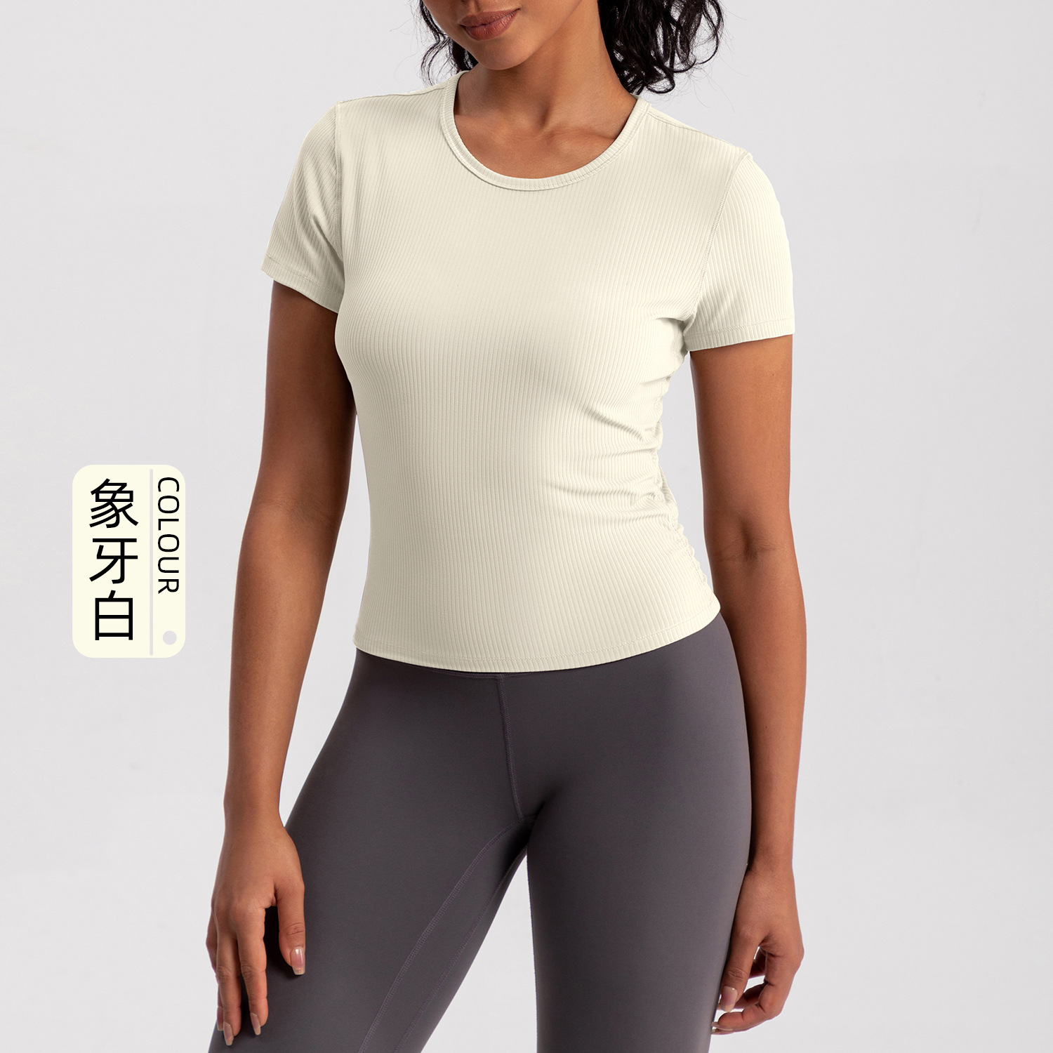 요가 의류 여성용 반팔 리브 러닝 피트니스 티셔츠 성적인 아름다운 등 슬림 핏 짧은 슬림 핏 빠른 건조 스포츠 탑
