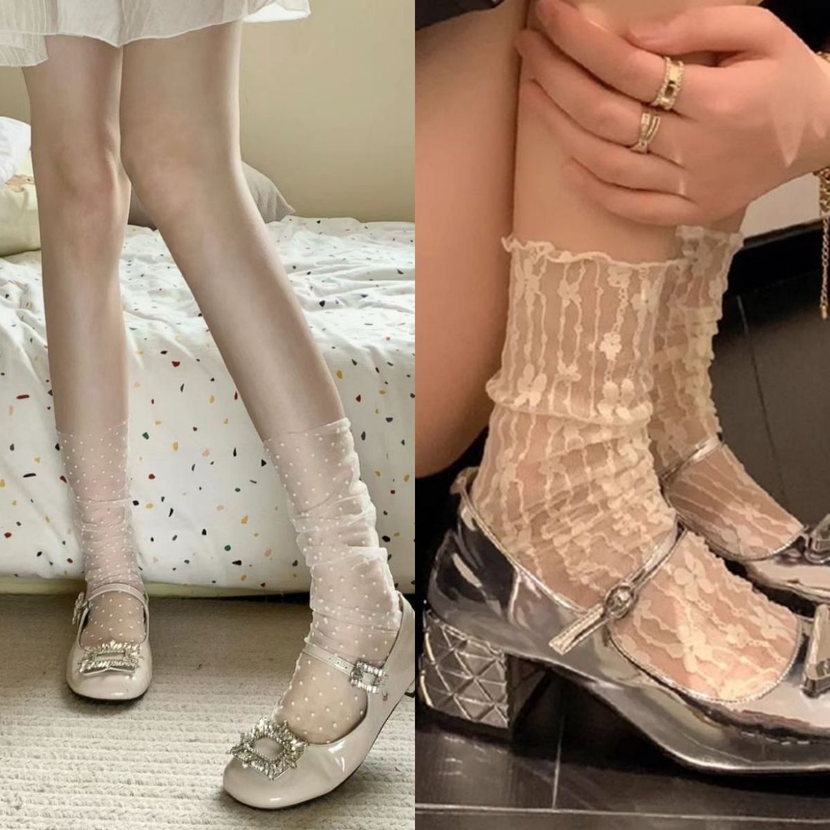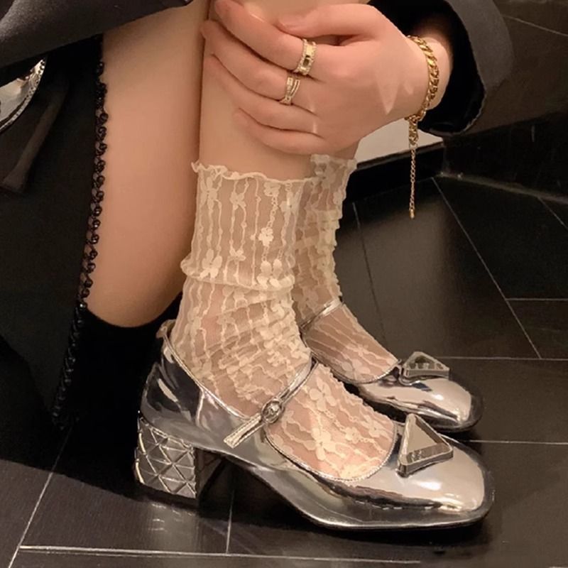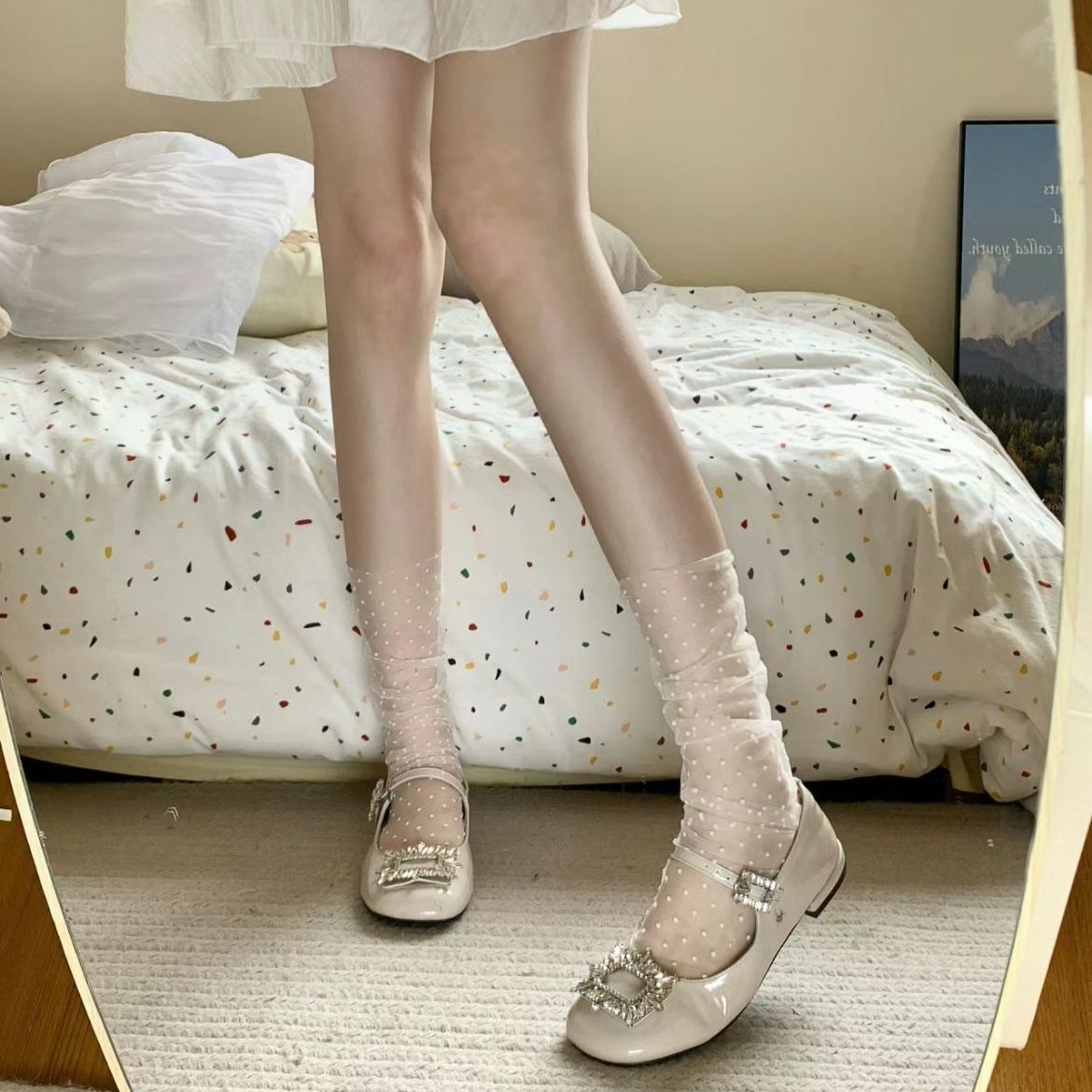 봄 여름 메쉬 양말 순수한 욕망 흰색 물방울 무늬 코스웨어 요정 초박형 투명 거즈 레이스 종아리 양말