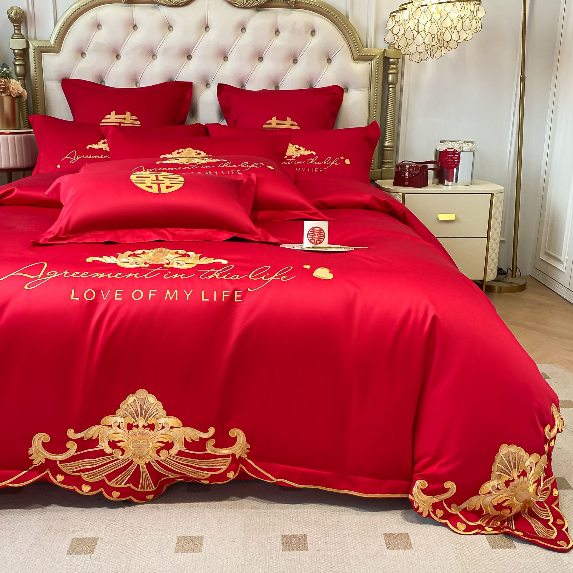 웨딩 네 조각 세트 모든면 해피 퀼트 레드 하이 엔드 간단한 자수 새로운 웨딩 룸 웨딩 선물 침대 모자 싱글 침구
